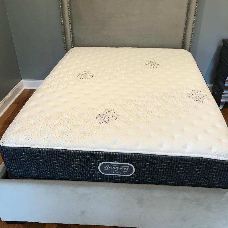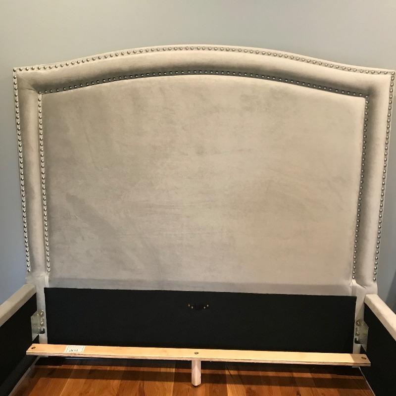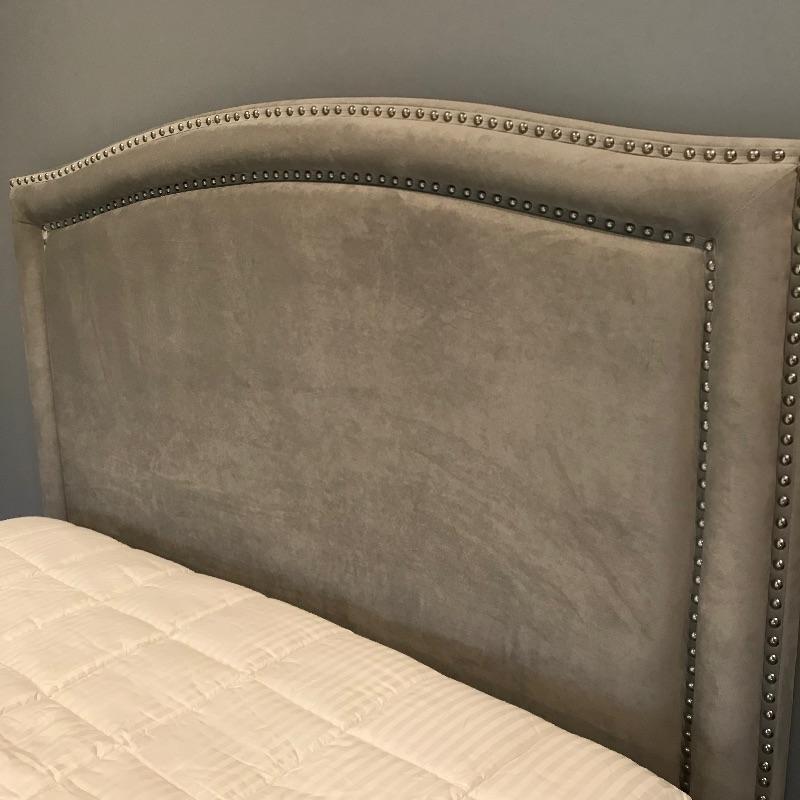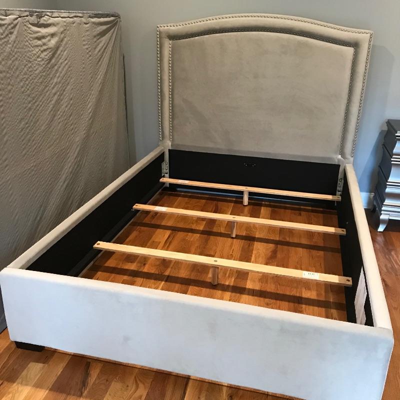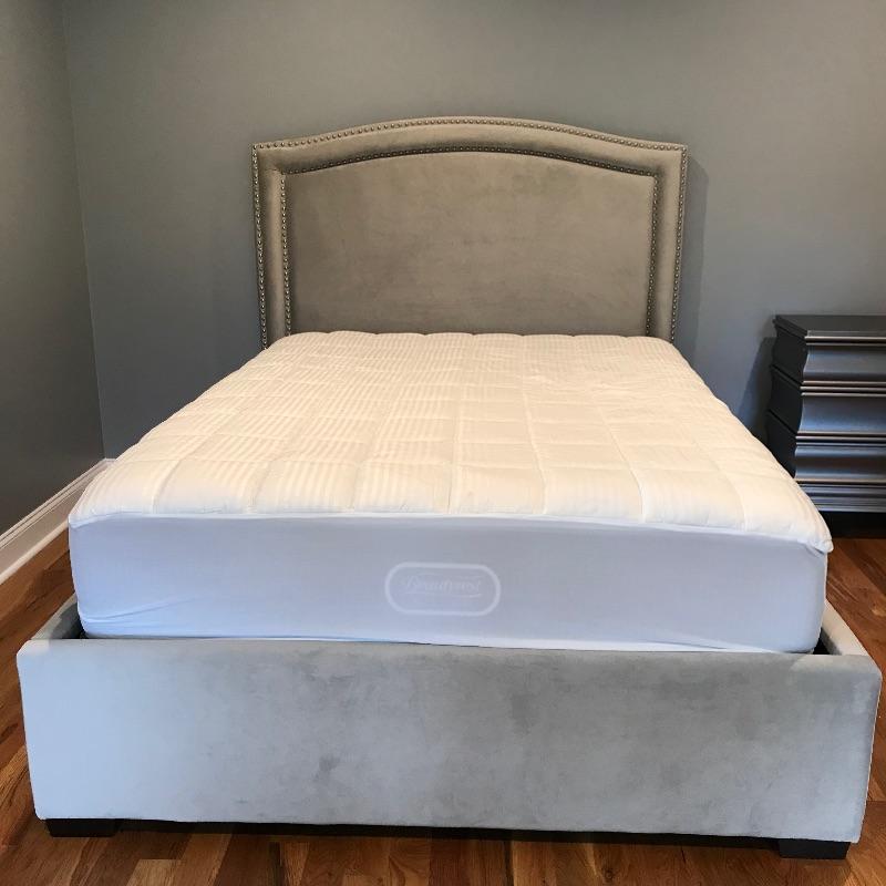 Very stylish and modern look with this soft plush silver upholstered bed. Silver studs adorn the headboard. Lot includes headboard and railings and wood slats. Bed is in like new condition. Headboard measures approximately 65.5” x 60”. Winning bidder may take home Beautyrest Silver mattress/box spring was only used a handful of times. No shipping.