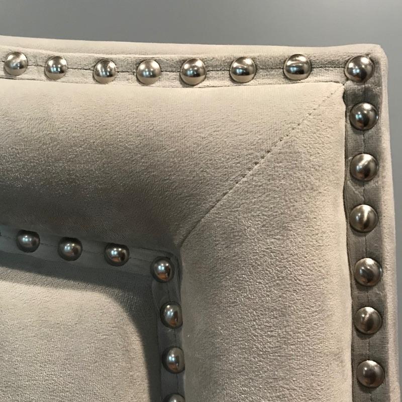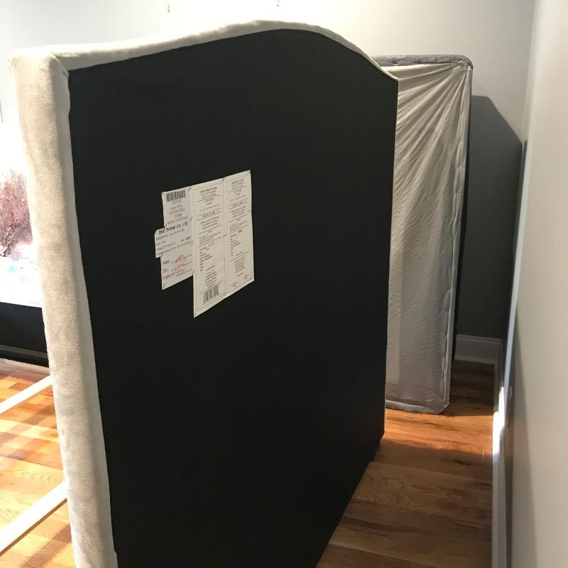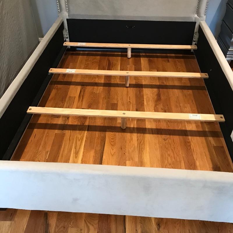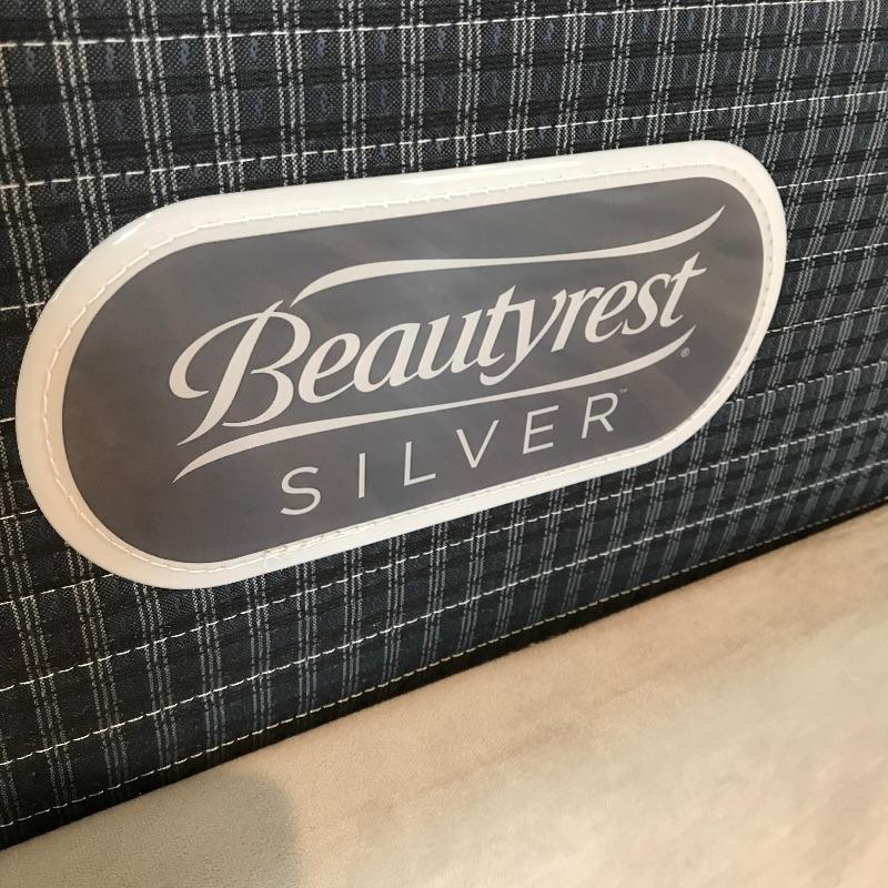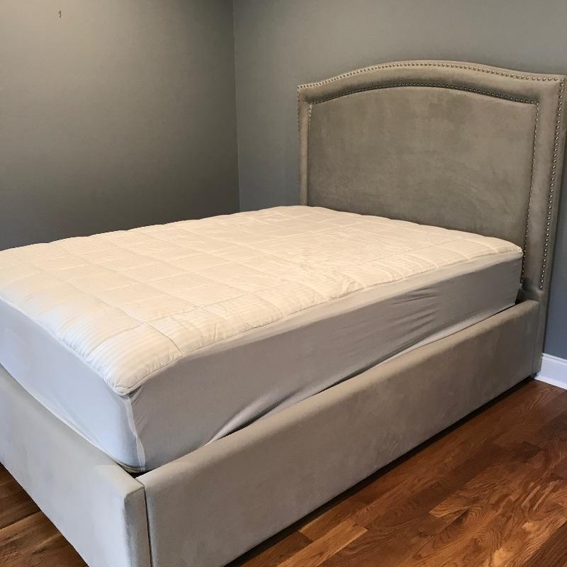 Very stylish and modern look with this soft plush silver upholstered bed. Silver studs adorn the headboard. Lot includes headboard and railings and wood slats. Bed is in like new condition. Headboard measures approximately 65.5” x 60”. Winning bidder may take home Beautyrest Silver mattress/box spring was only used a handful of times. No shipping.