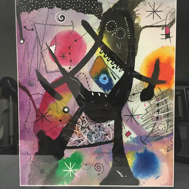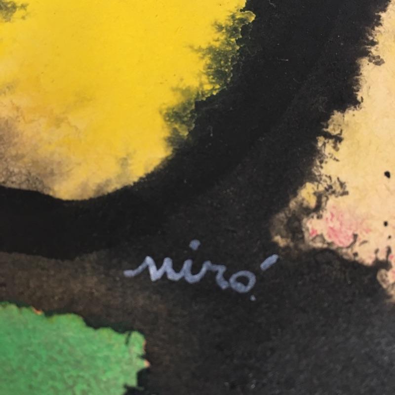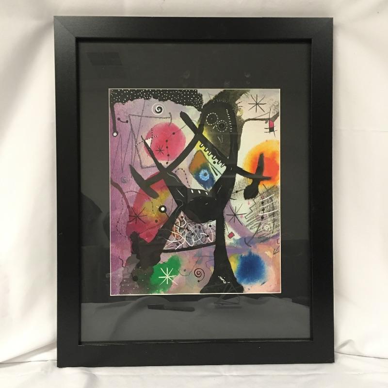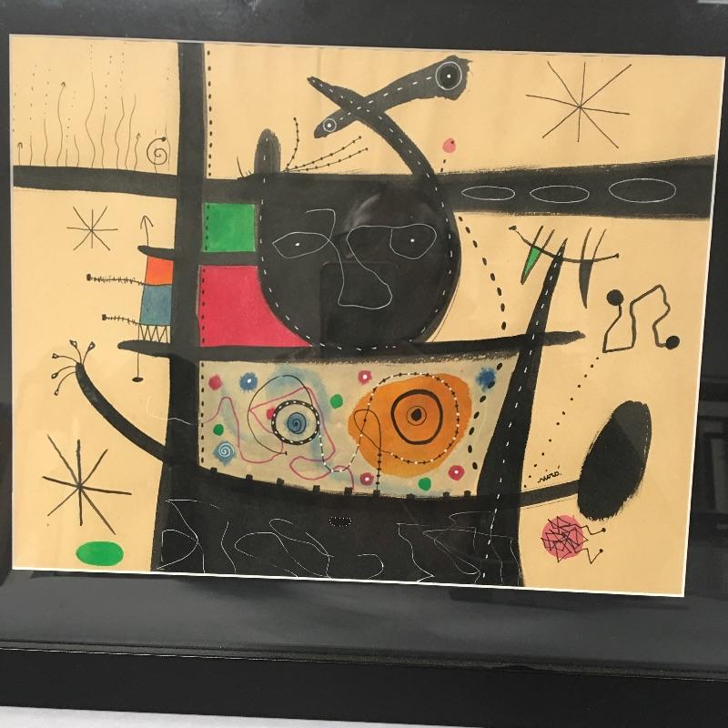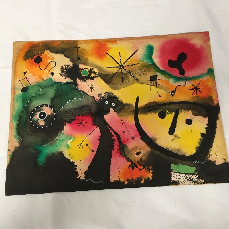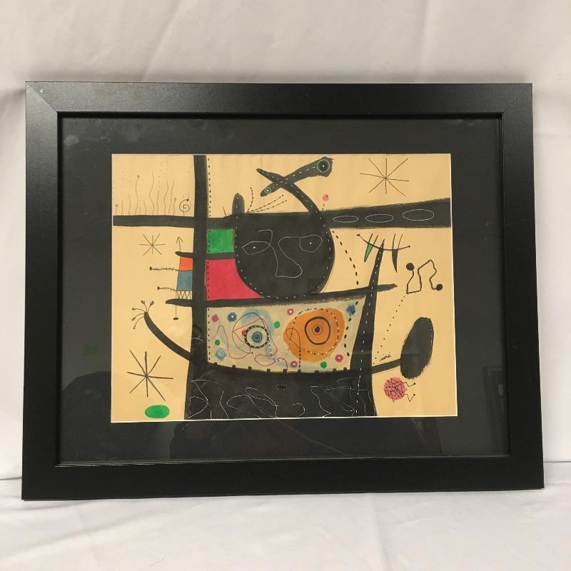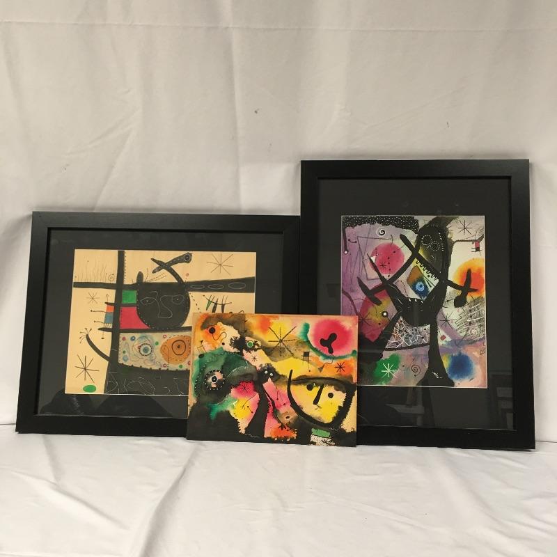 This trio of artwork in the style of Joan Miro includes two framed pieces and one unframed piece. All appear to be watercolor on paper.