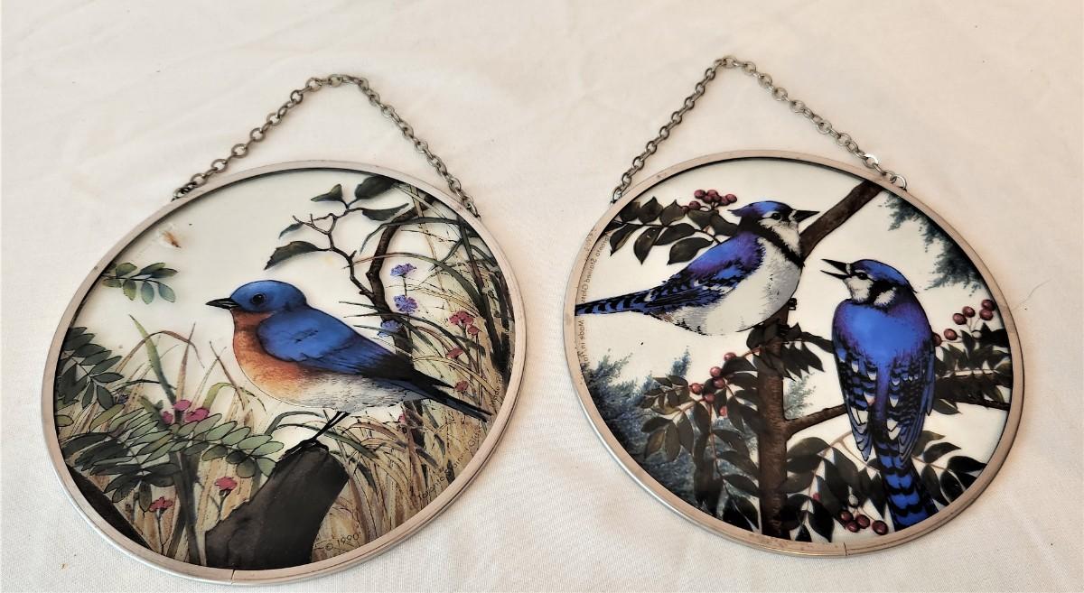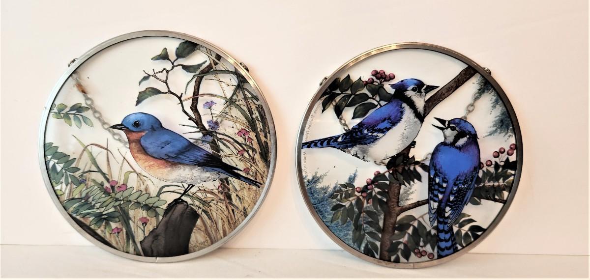 Lot of 2 stained glass suncatchers - Toronto Stained Glass Co. - Blue Birds and Blue Jays. Each is 6.5" across - both in good condition.