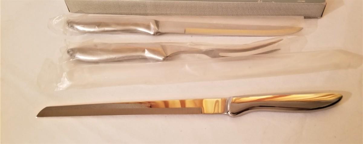 Looks as though it was never used - three piece stainless steel carving set in original box - 1960's (Japan). Longest knife is 14.5" long, then 13.5" long - meat fork is 11.5" long.