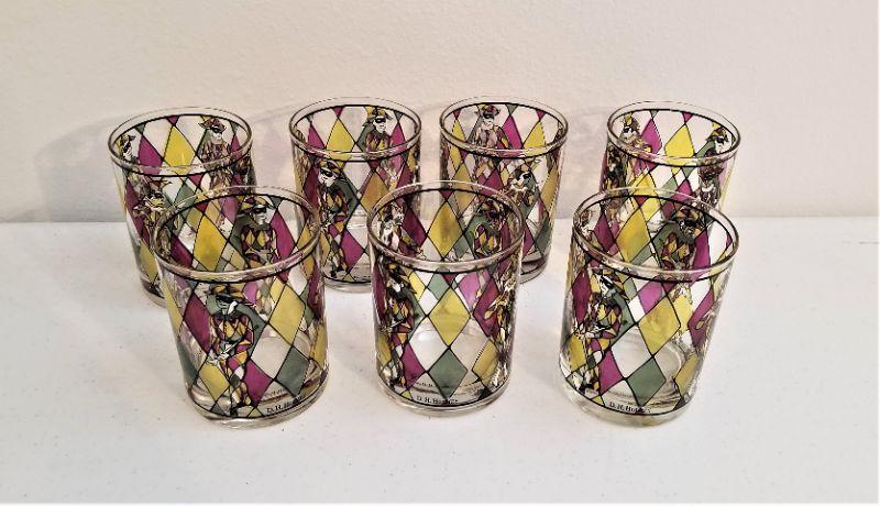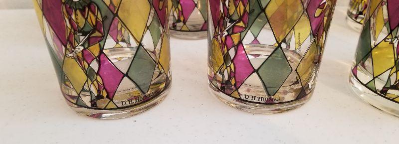 GREAT vintage barware from DH Holmes with a Mardi Gras theme "Harlequin". Retired pattern. These glasses are in excellent condition. Set of seven. They stand about 4" tall.