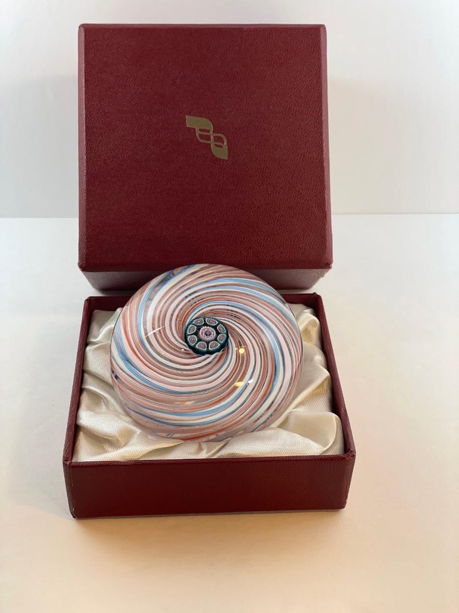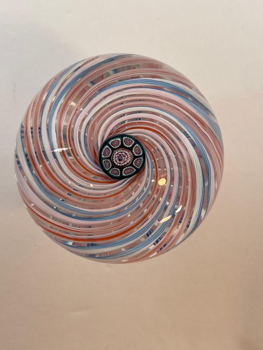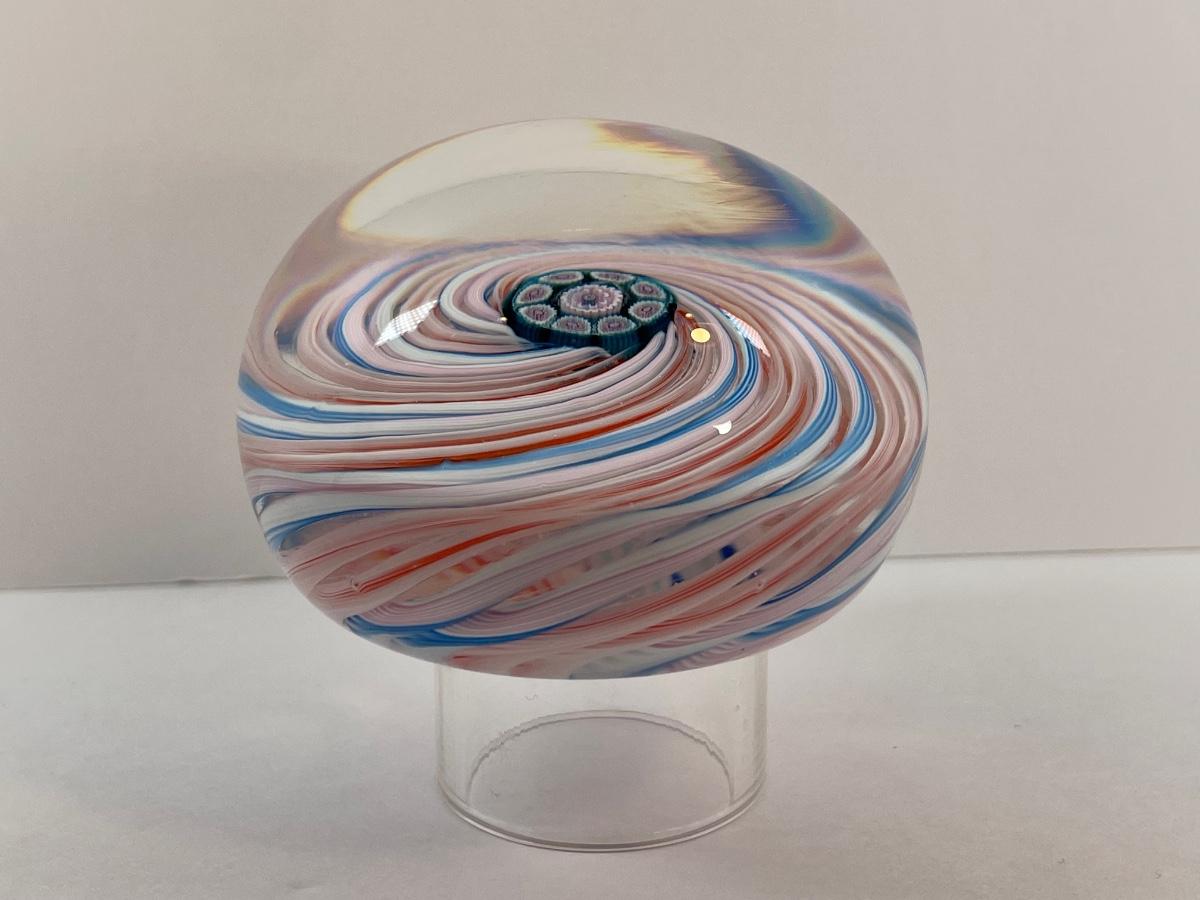 1983 Perthshire blue/orange/white latticinio millefiori ribbon swirl, 2 3/4" x 2"