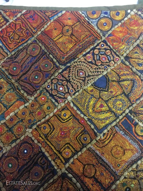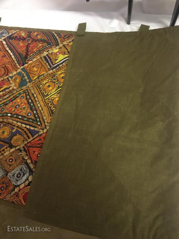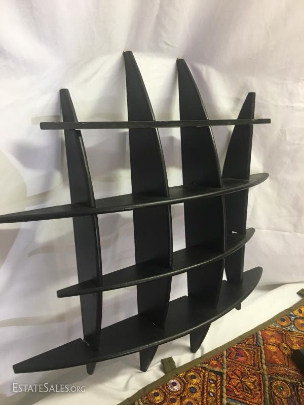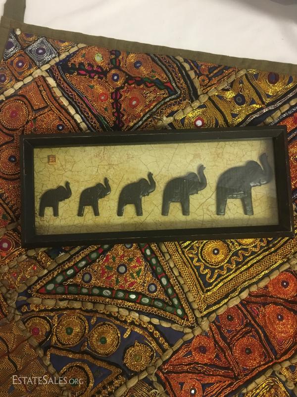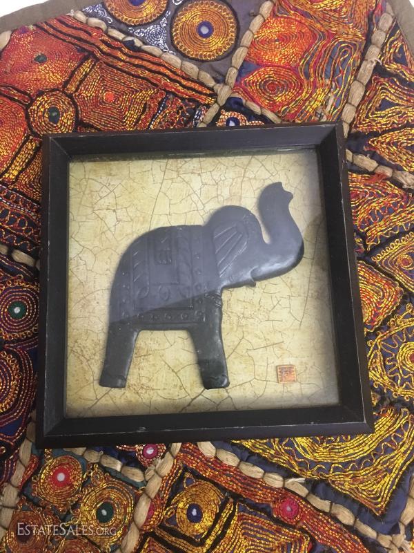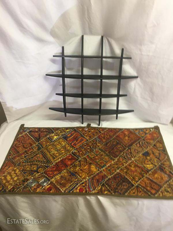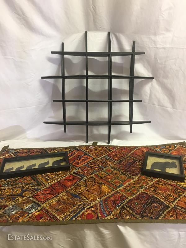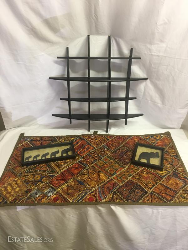 3 tab ornate tapestry. Measures 46" x 24". Two elephant shadow box framed carvings. Small measures 8" x 8" and larger one is 14" x 6". Black shelf unit is made of wood and measures 28" x28". Each square shelf measures 6" x 6". Unit sticks out 5" at center. This lot is available for shipping or local pick up in Waynesville, NC.