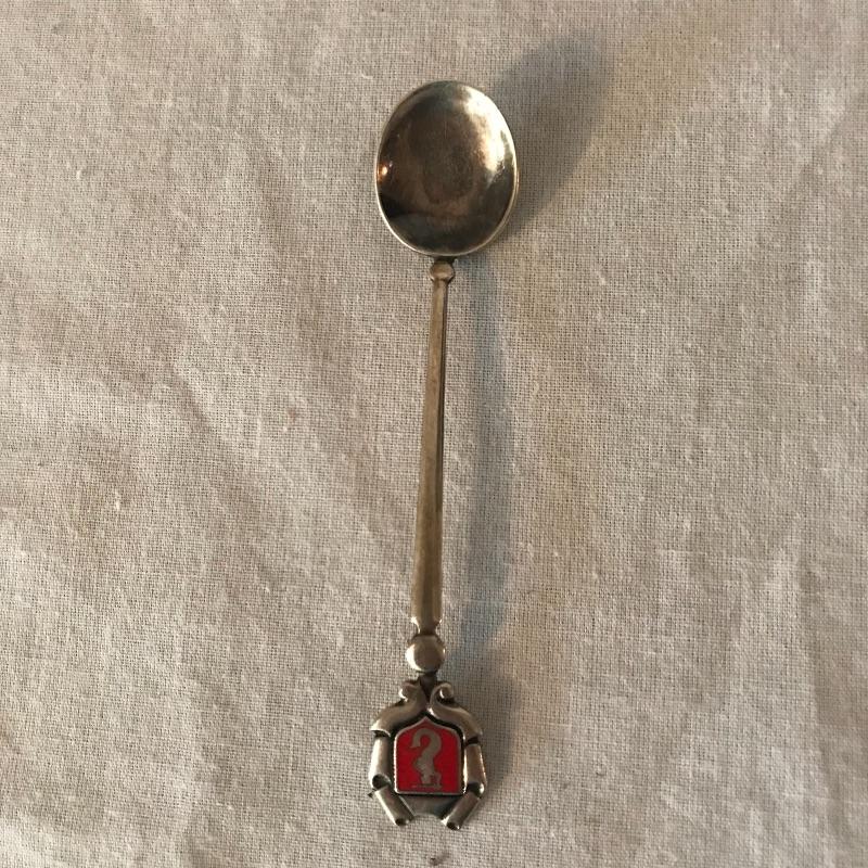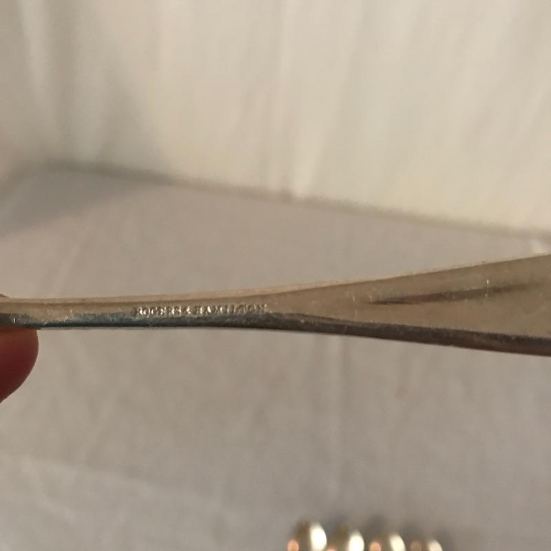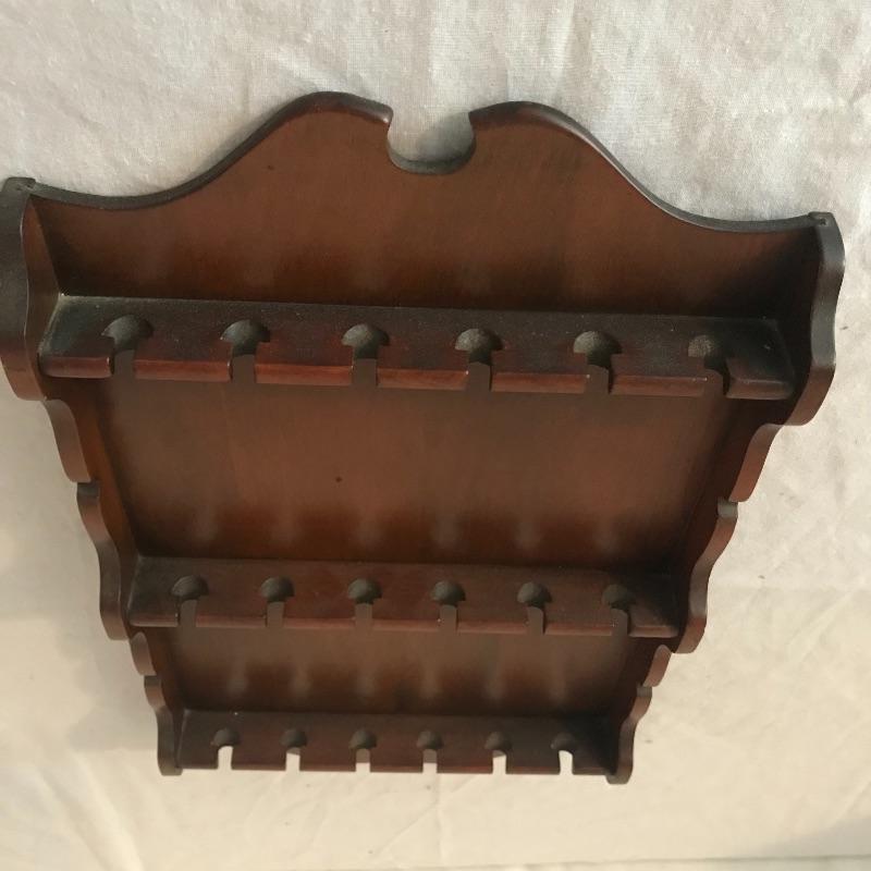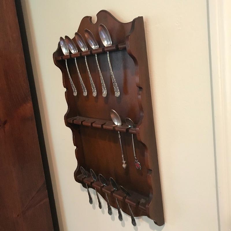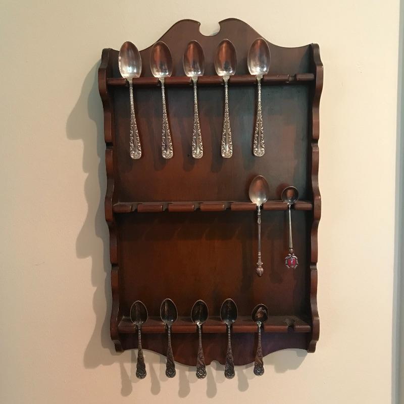 Create your own memories with this special lot! Lovely vintage wooden spoon display measuring 10.25” x 2” x 18” with wire ready for hanging. This display has spots for eighteen spoons. Also included are five Rogers and Hamilton spoons, five Rogers & Bros spoons and two more unique spoons. Shipping available.
