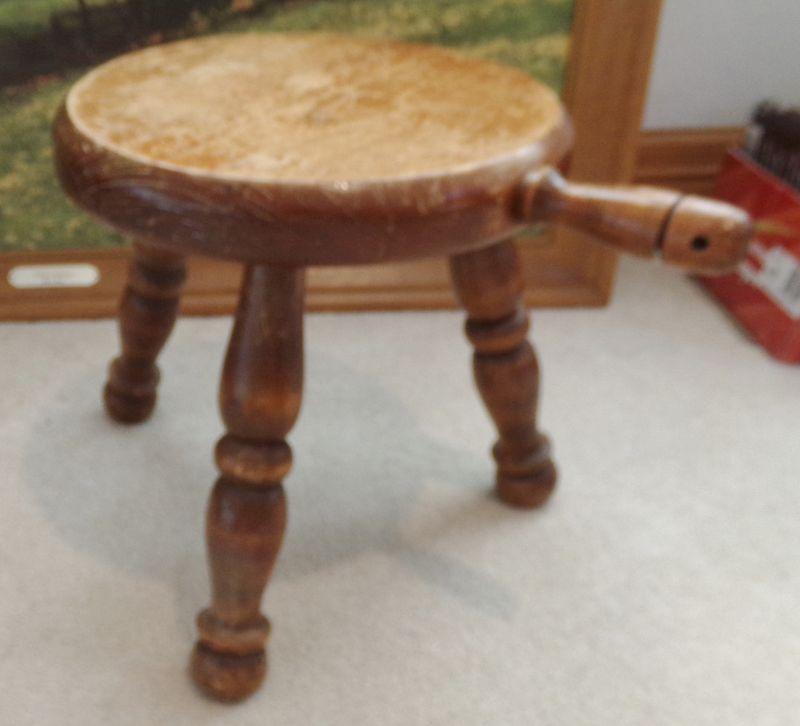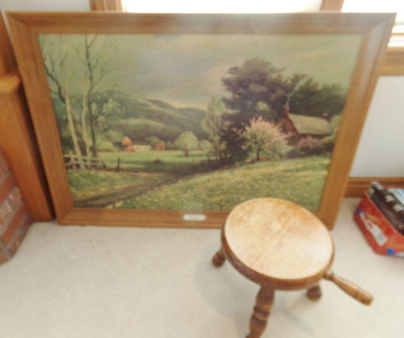 LOT 32 WOODEN STOOL WITH HANDLE AND PICTURE