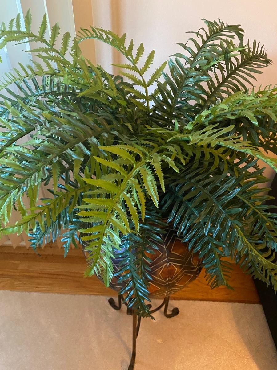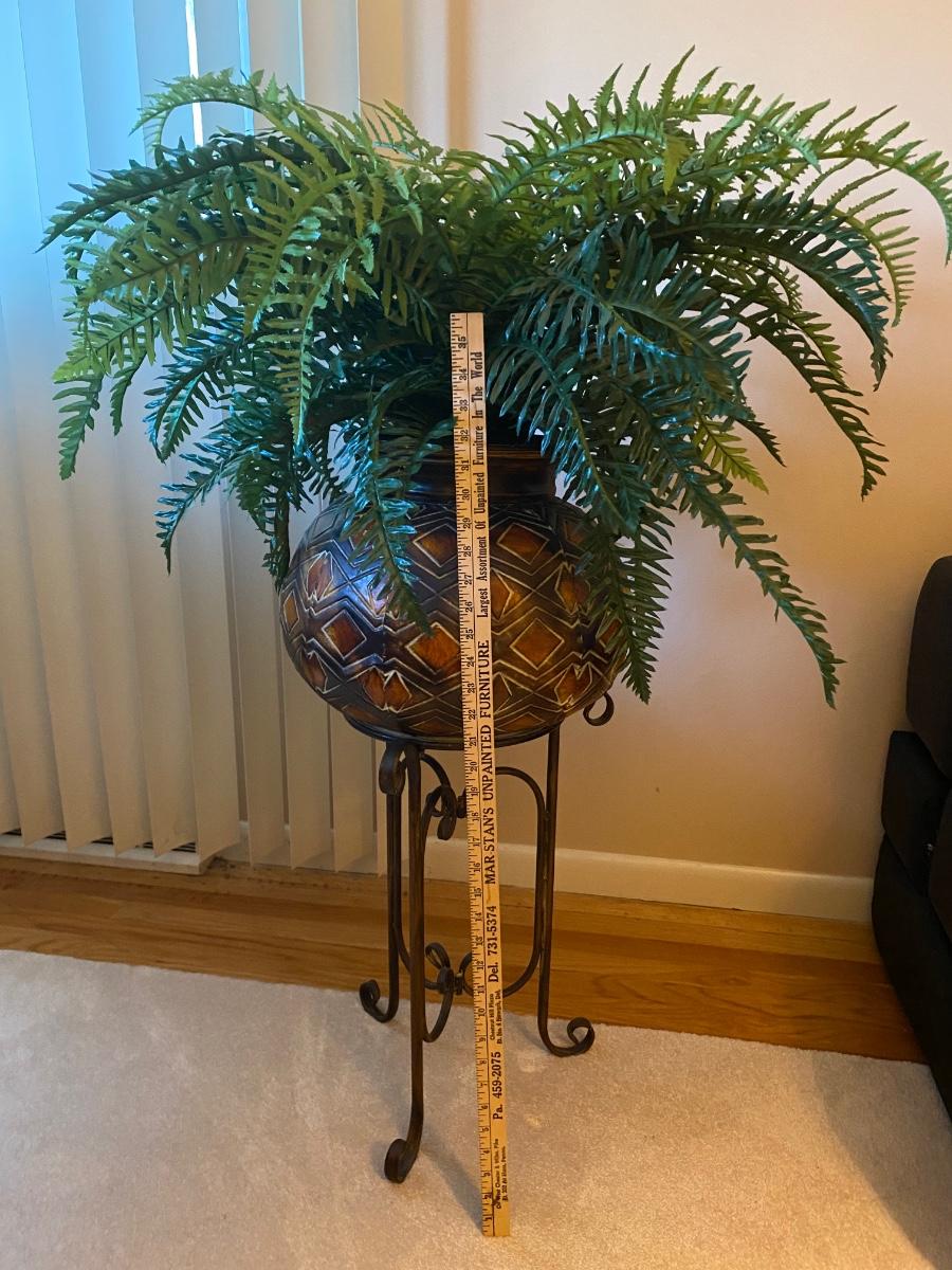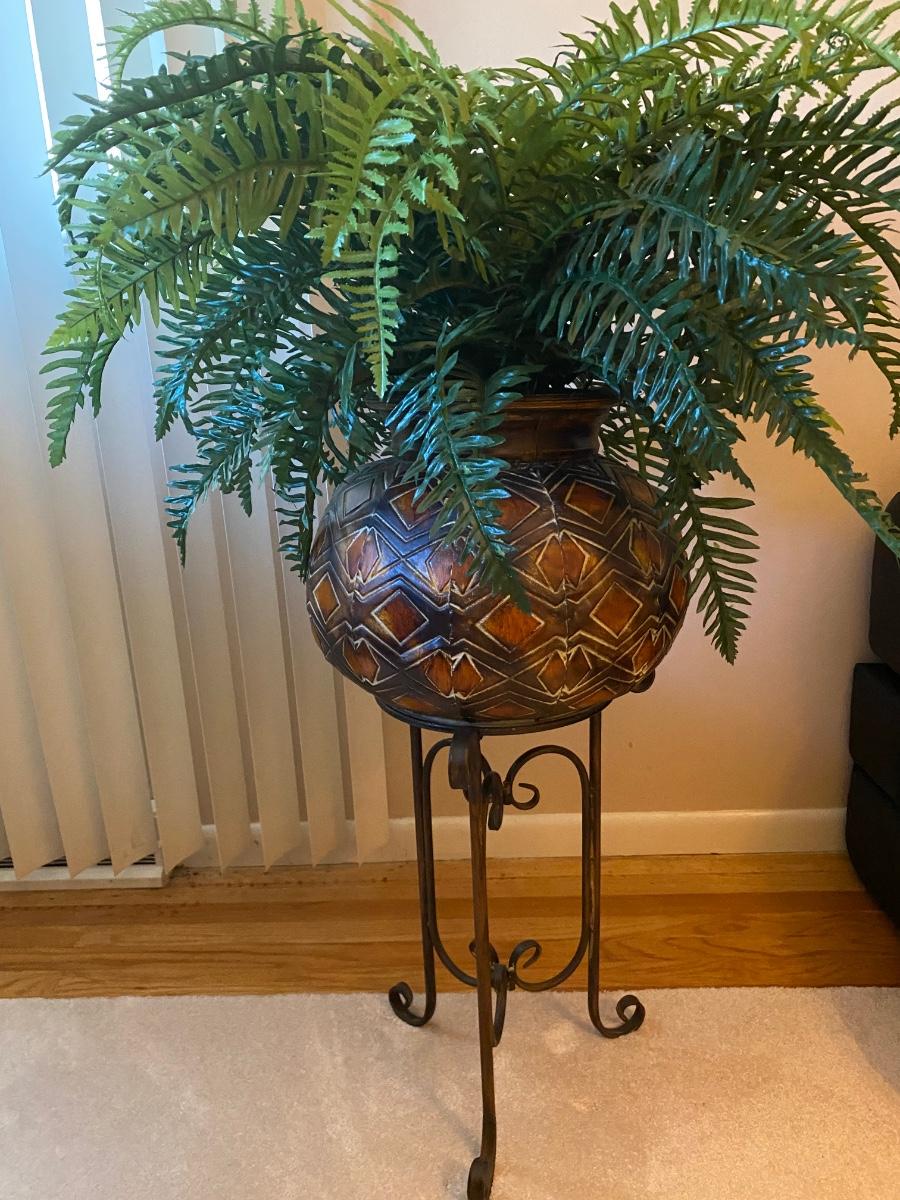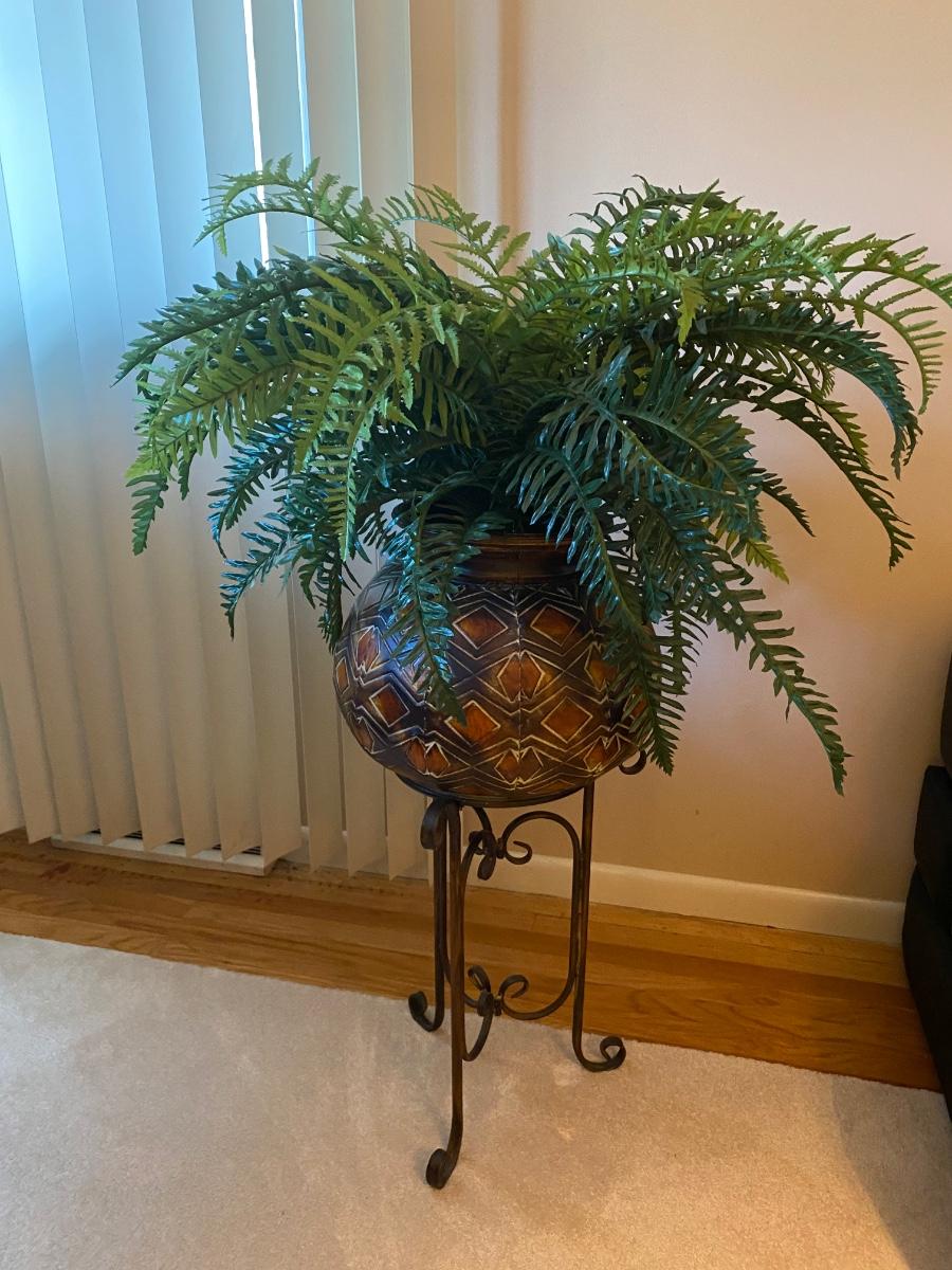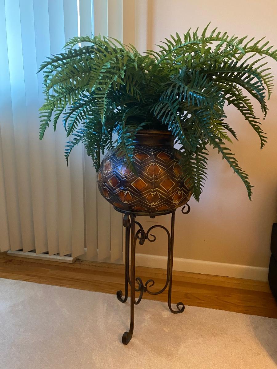 Artificial plant sits in a basket on a black lightweight metal stand.
