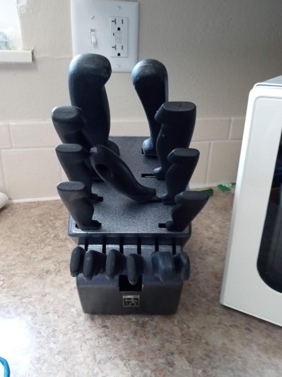 LOT 320  SMALL RIVAL MICROWAVE AND GINSU KNIVES IN A BLOCK