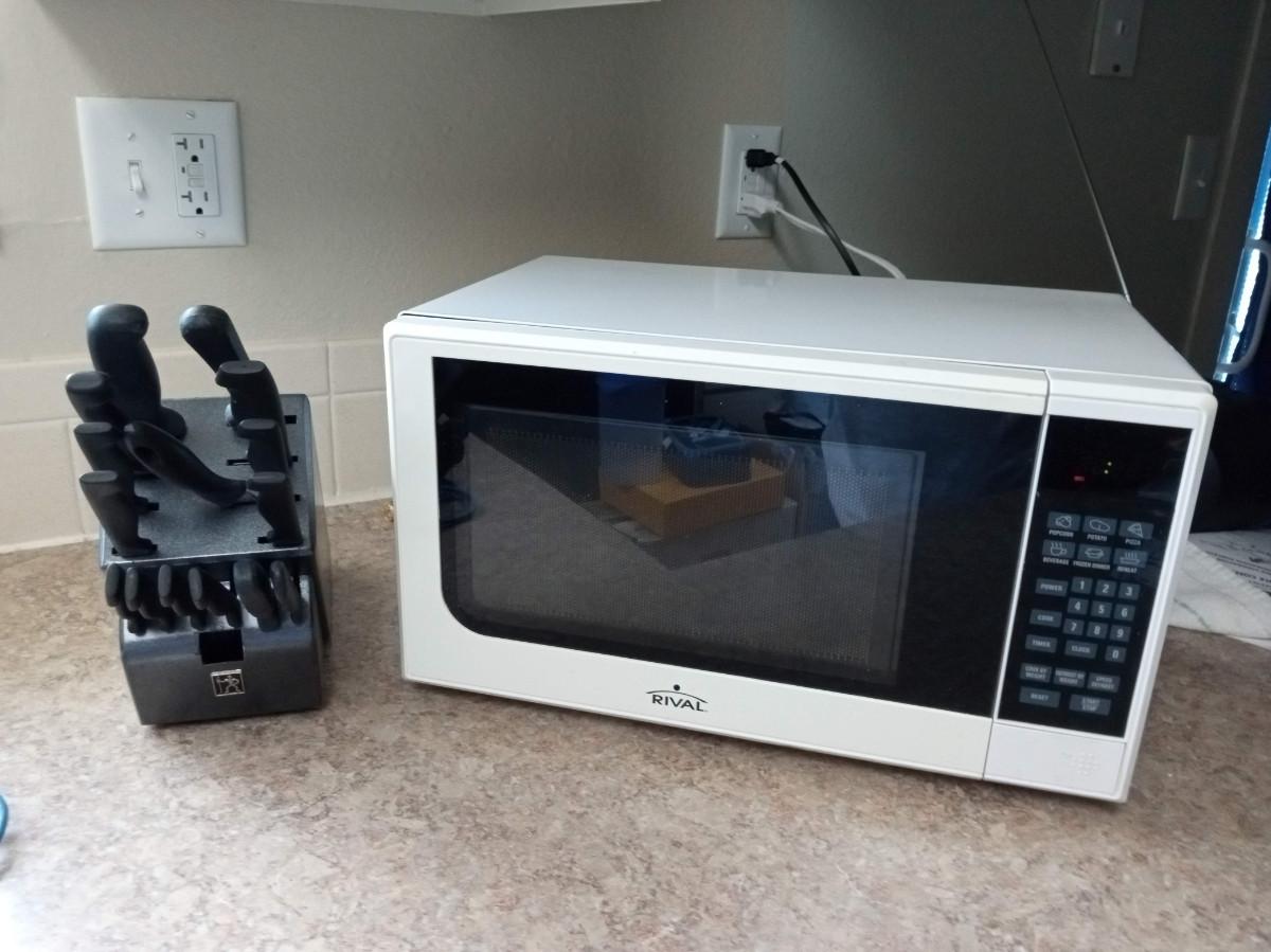 MICROWAVE TAKES A LITTLE LONGER TO COOK THAN A NEWER MODEL BUT WORKS WELL, WE HAVE BEEN USING IT WHILE PREPARING THE AUCTION. IT MEASURES 17.5" X 11" X 10"