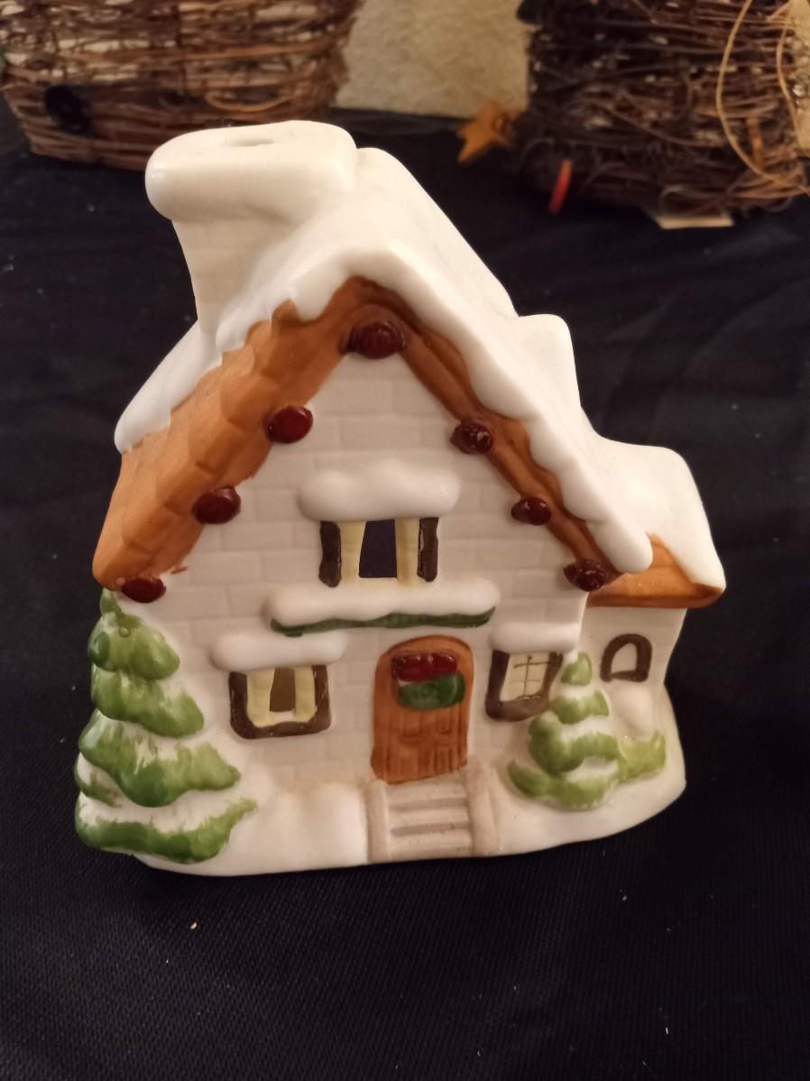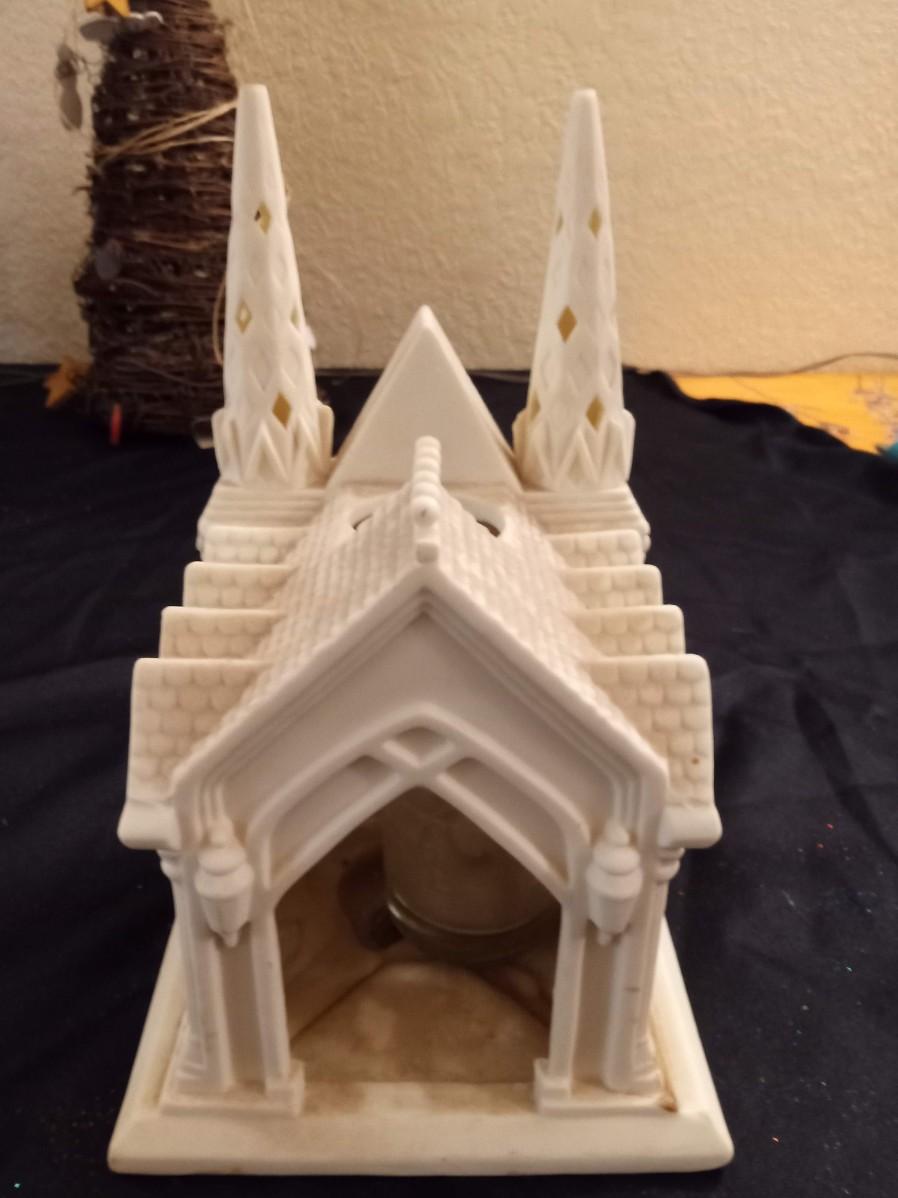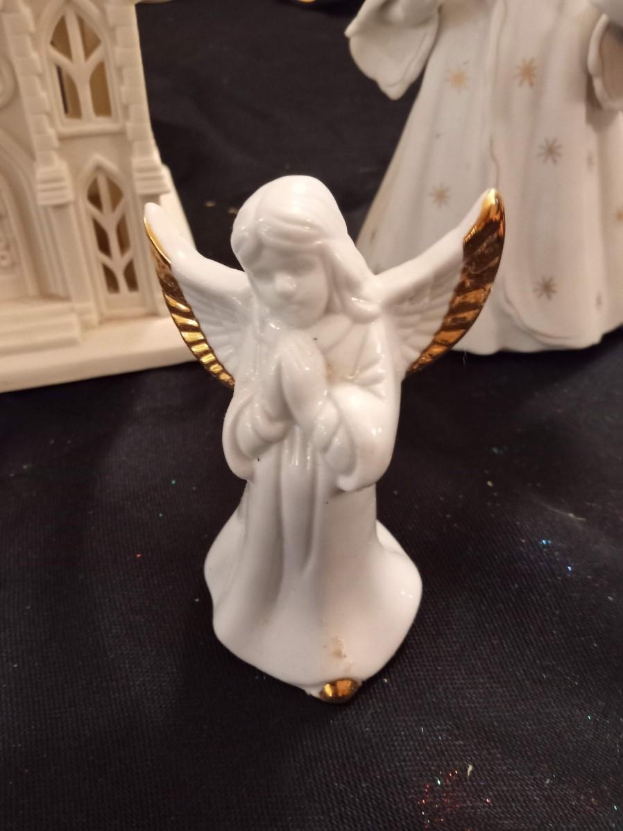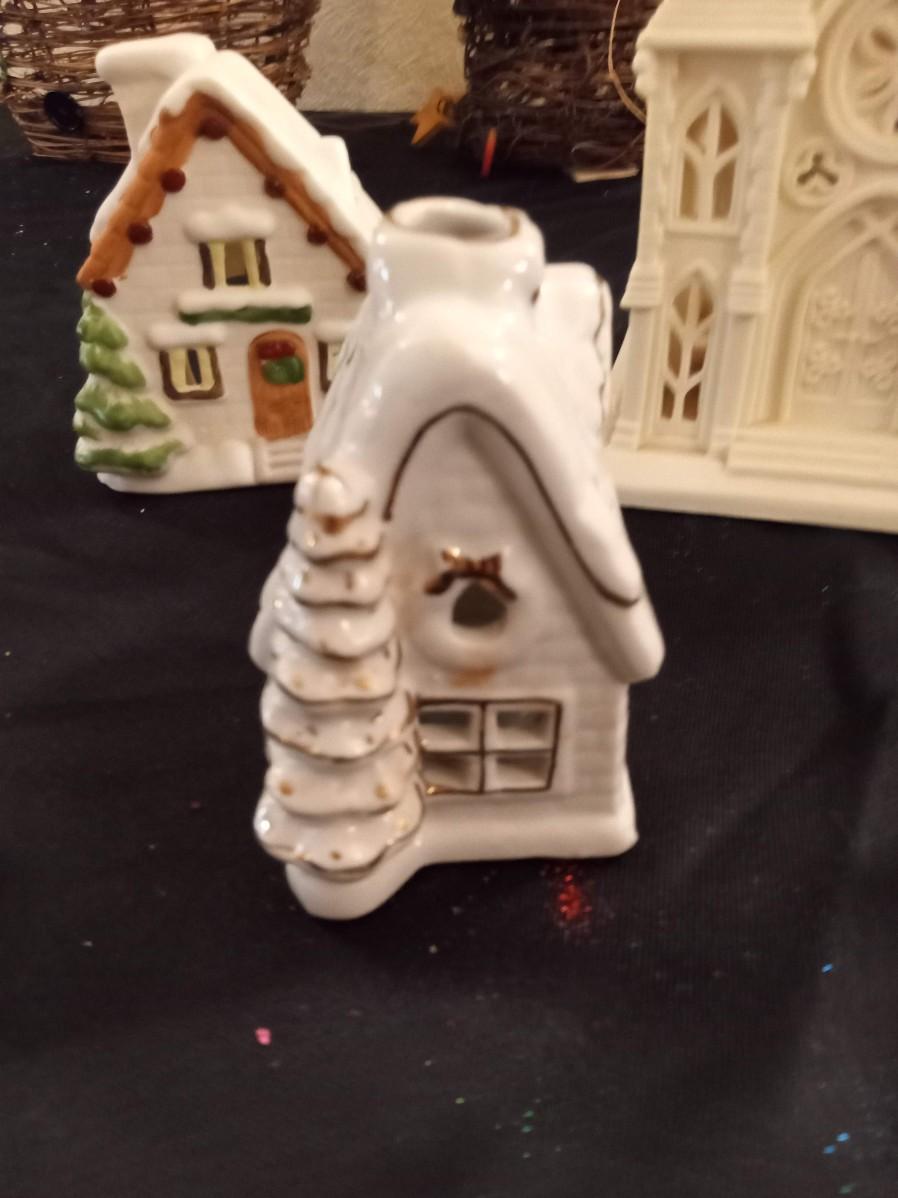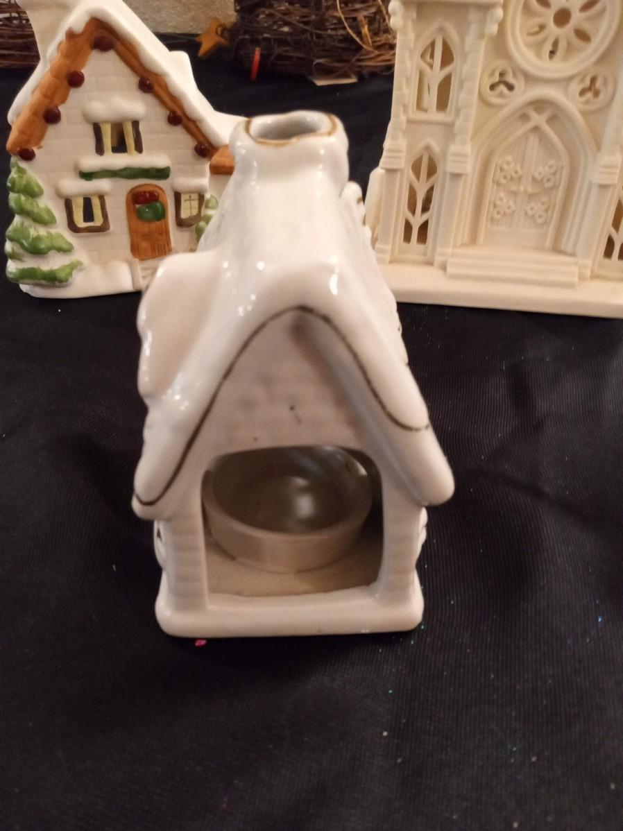 PARTYLITE CANDLE HOLDER CHURCH, SMALLER ANGEL IS A BELL, THE 2 SMALLER HOUSES ARE ALSO CANDLE HOLDERS, BAG OF VOTIVE CANDLES AND 2 CLOTH ANGEL ORNAMENTS