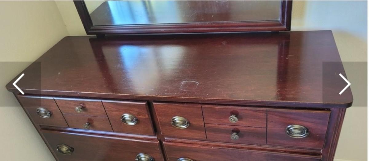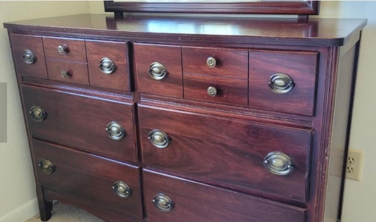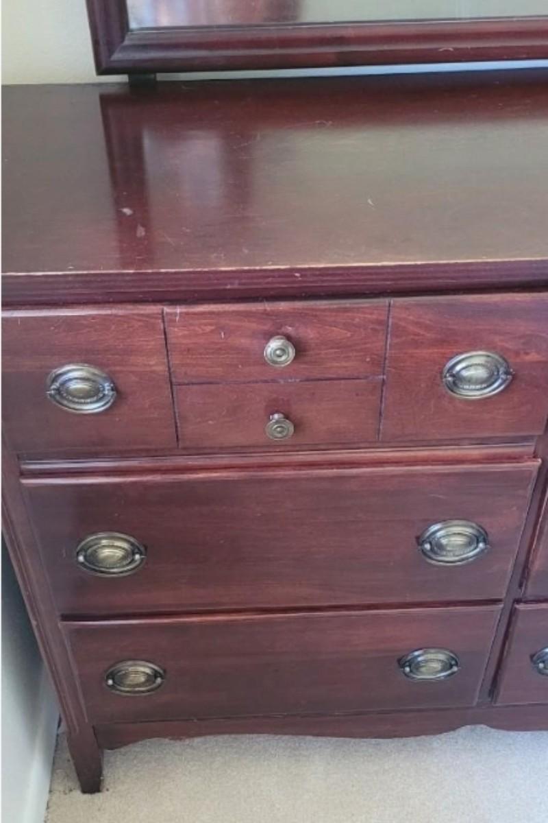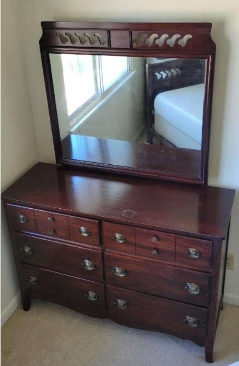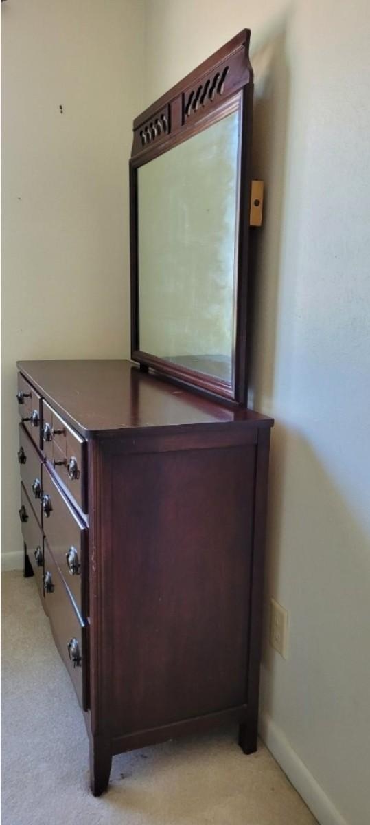 Matches the Bed. This Vintage Wood Dresser has the original Mirror and comes in a Dark oak stain that does show some wear to be expected with age.
