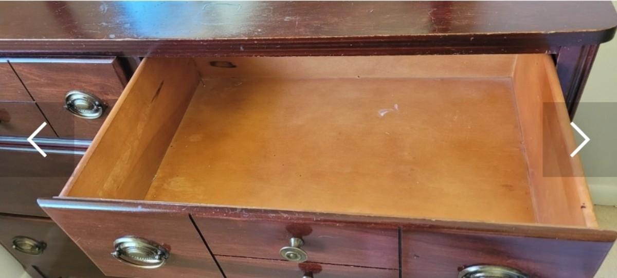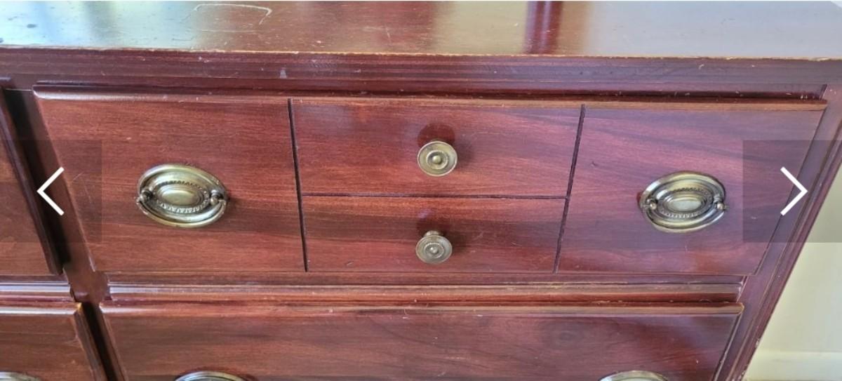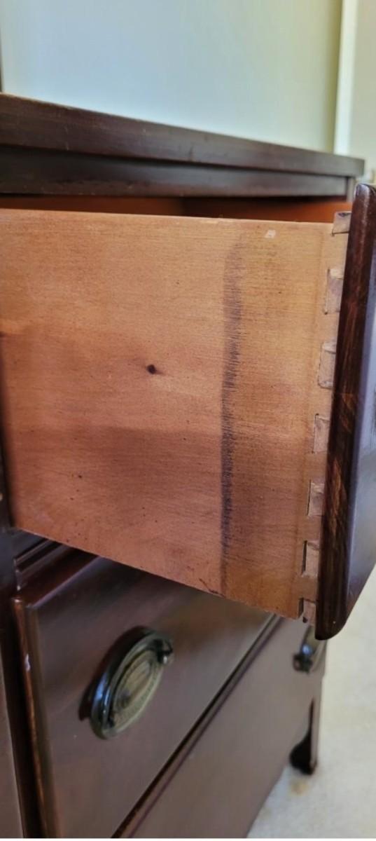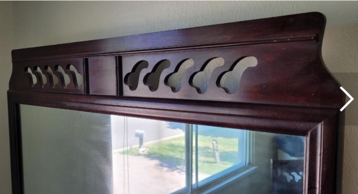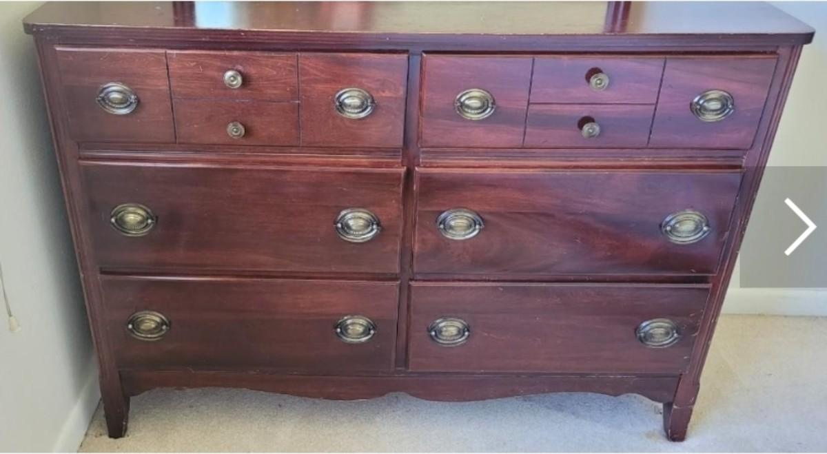 Matches the Bed. This Vintage Wood Dresser has the original Mirror and comes in a Dark oak stain that does show some wear to be expected with age.