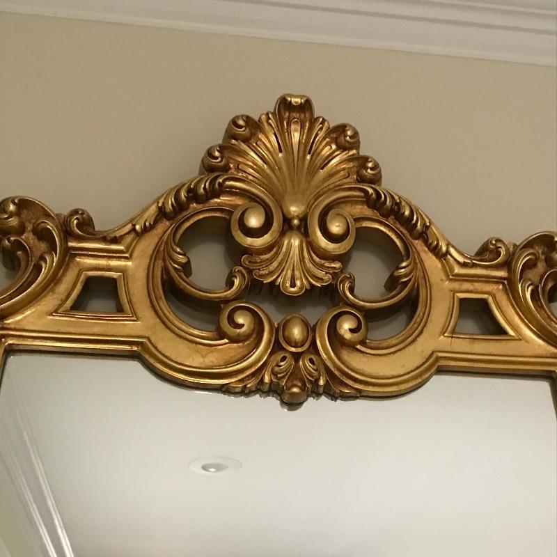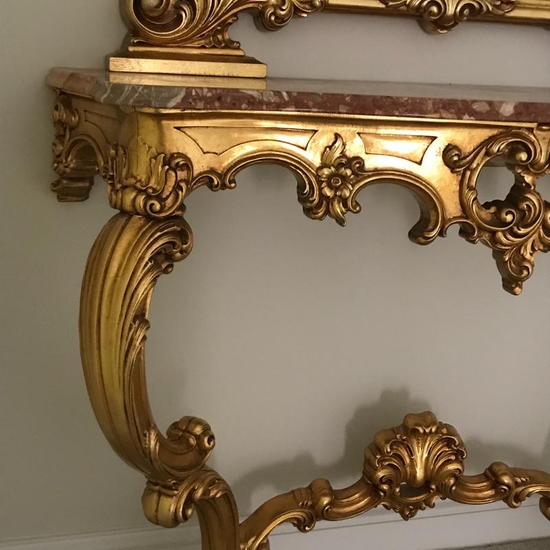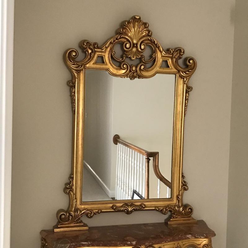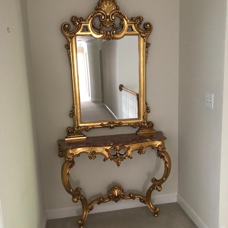This elegantly ornate table and mirror set is perfect for a hallway, formal entryway or maybe a bedroom. Mirror hangs on the wall but gives the appearance that it is connected to and sitting on the table top. Together, unit is approx. 42” x 13” x 84”h. Tabletop is approx. 32” from floor. Mirror is approx. 36” x 50”.