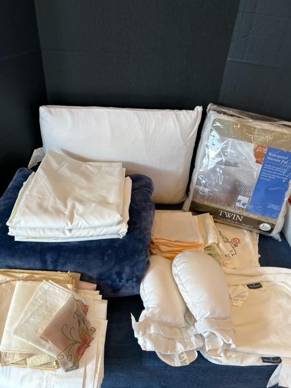 Sleep innovations foam pillow, waterproof mattress cover, blanket, Posey medical mittens.