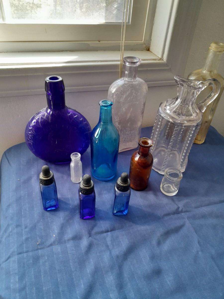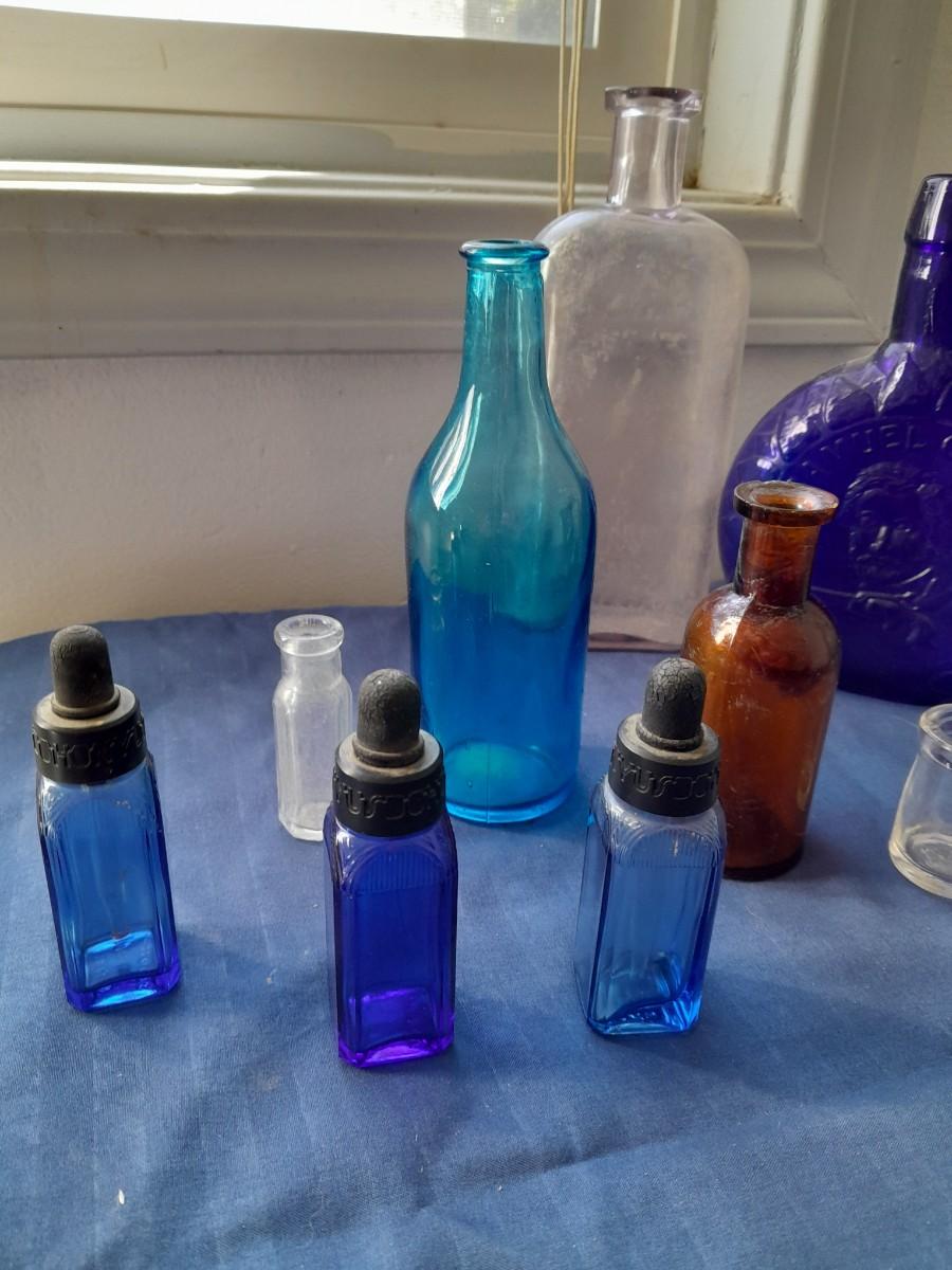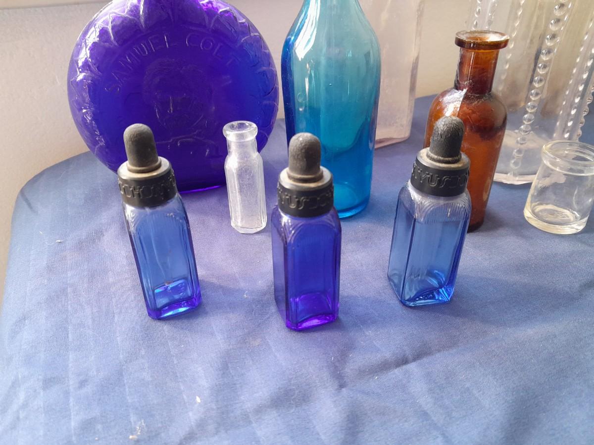 OLD BOTTLES, BLUE MEDICINE BOTTLES WITH DROPPERS