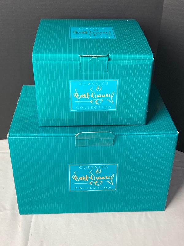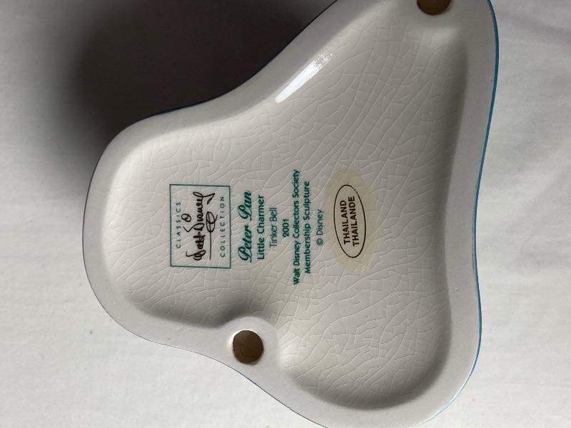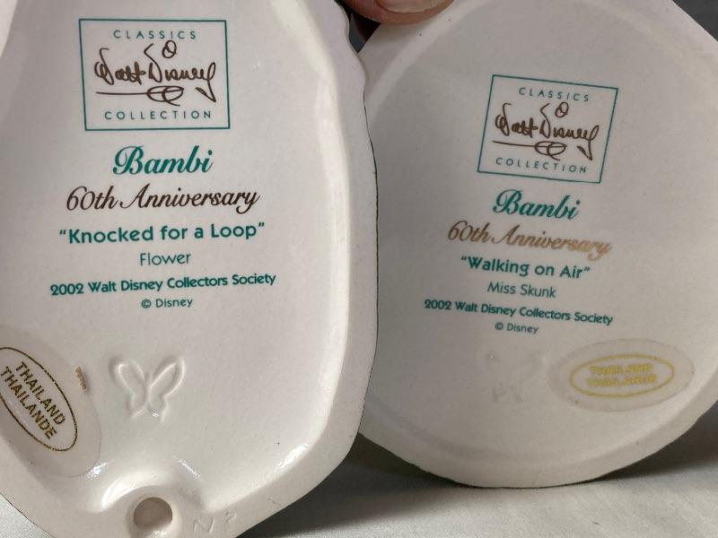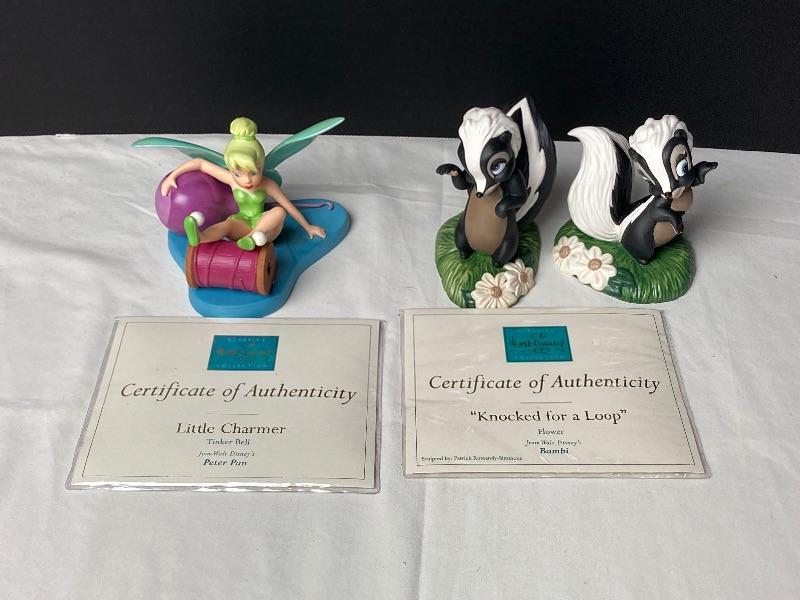 From the movie Peter Pan, “Little Charmer” Tinkerbell porcelain figurine. From the movie Bambi , “Knocked For A Loop”Flower porcelain figurine and “Walking On Air” Miss Skunk porcelain figurine (missing certificate of authenticity). Tinkerbell and Flower figurines come with certificate of authenticity. All figurines come with original boxes
