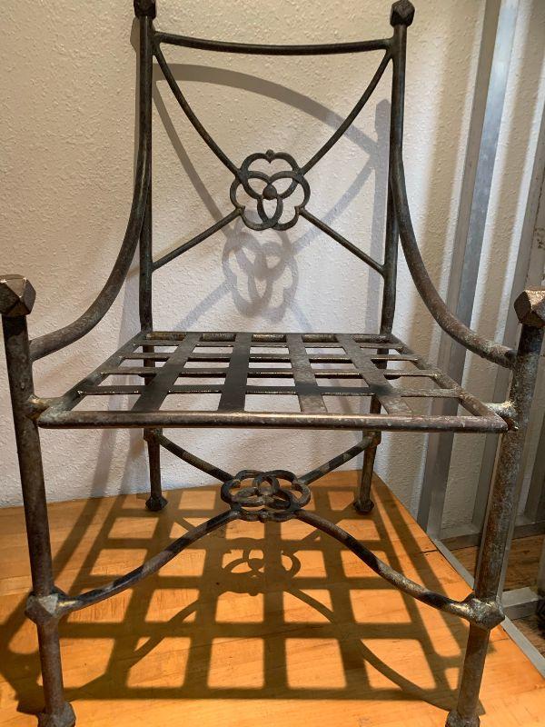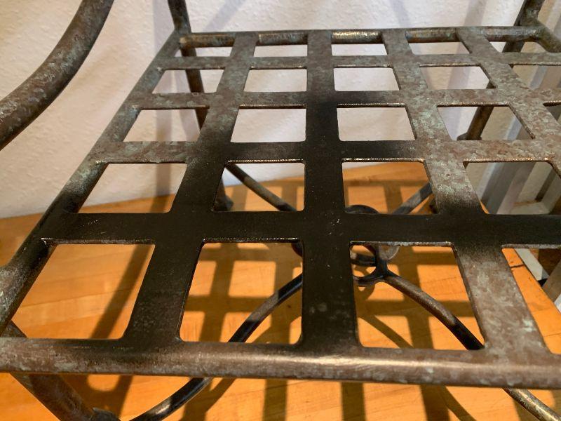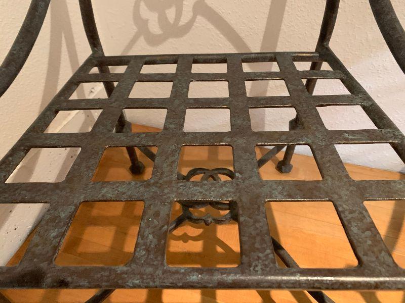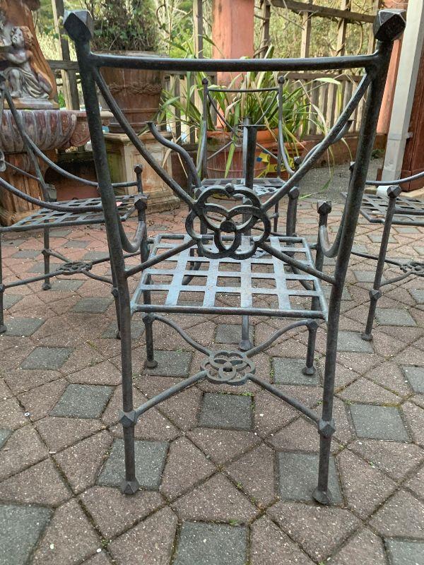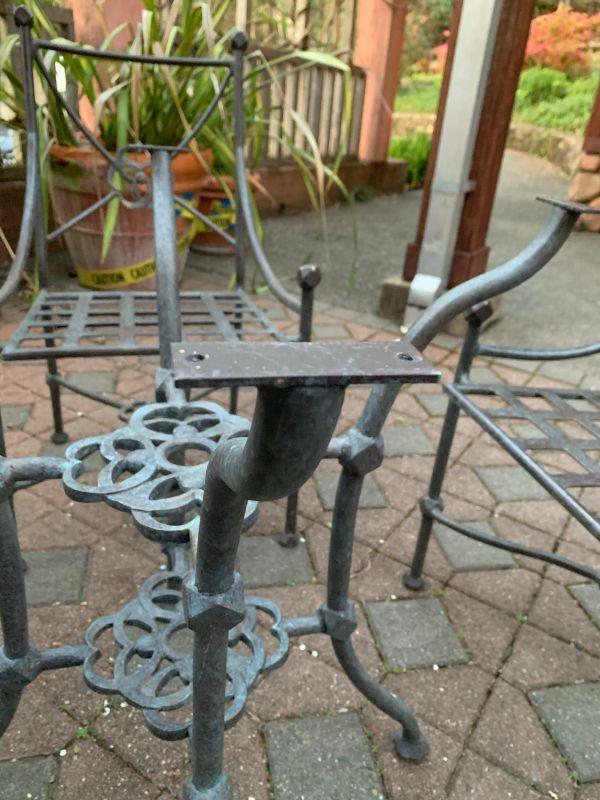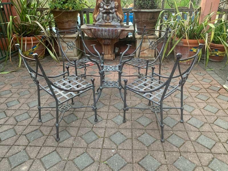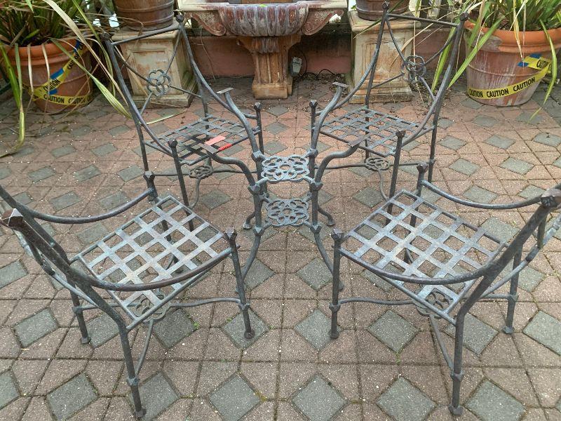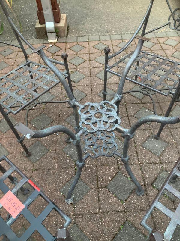 4 nice solid heavy outdoor/indoor chairs. One chair has black spray paint on it that will not be noticeable with a cushion on it. Matching table base only.