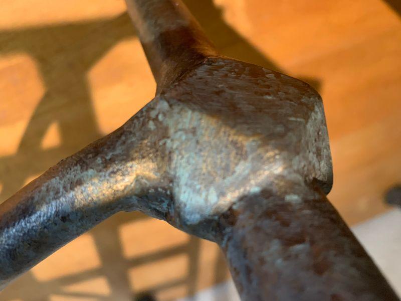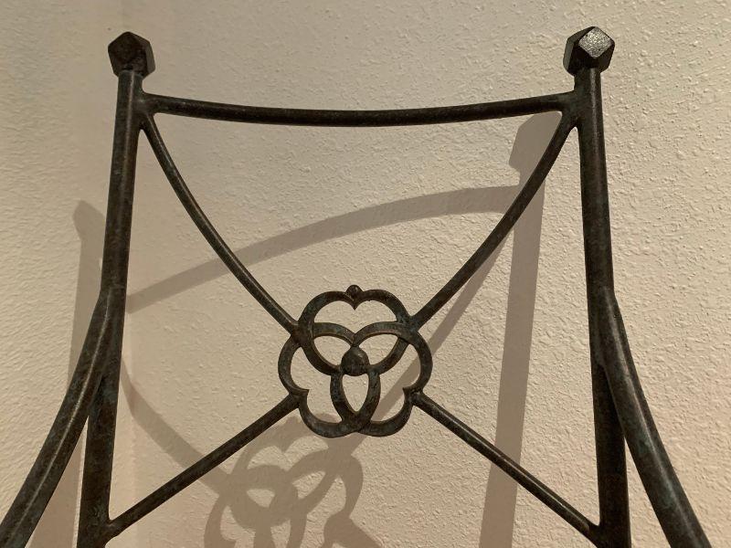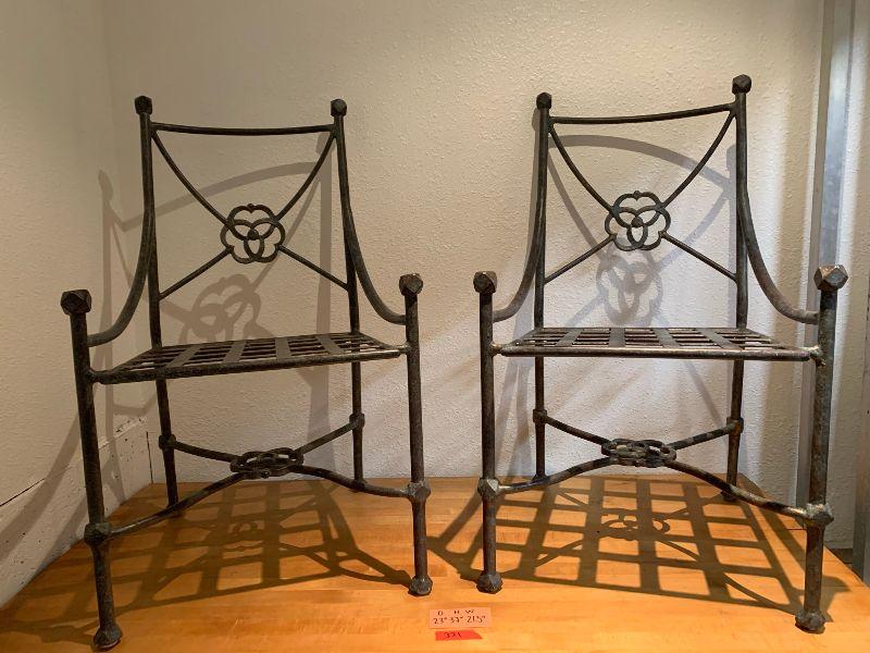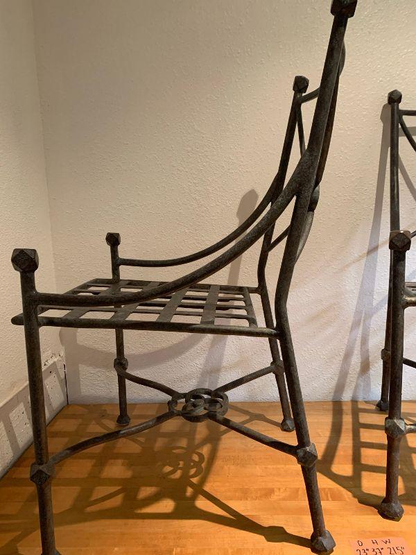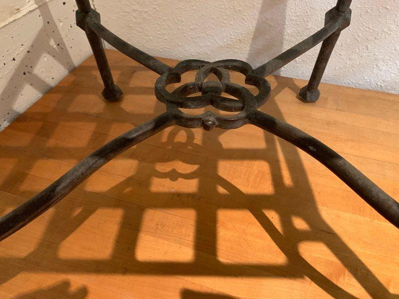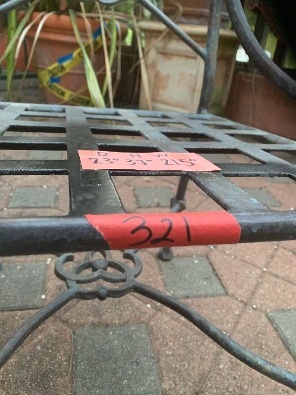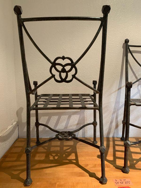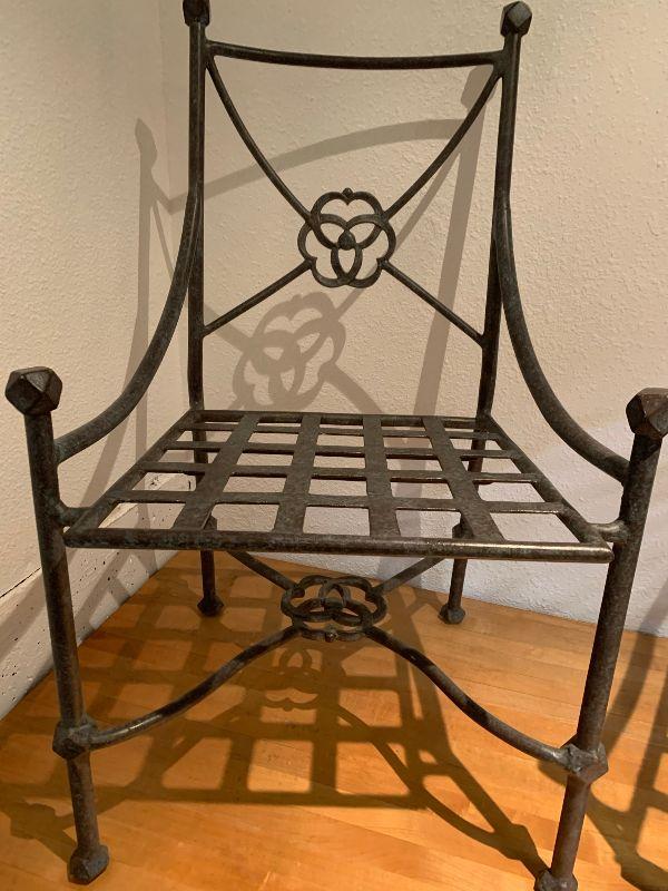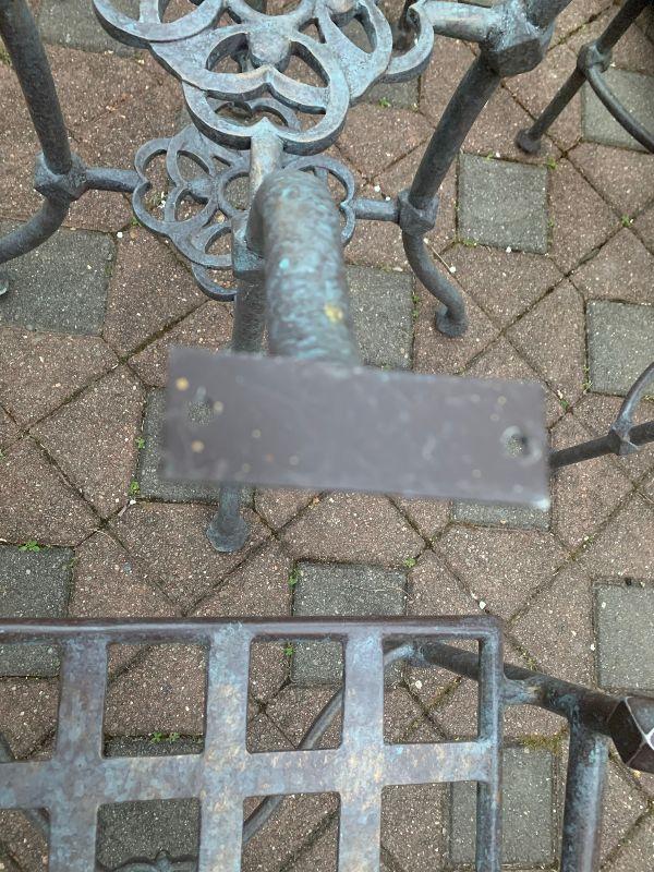 4 nice solid heavy outdoor/indoor chairs. One chair has black spray paint on it that will not be noticeable with a cushion on it. Matching table base only.