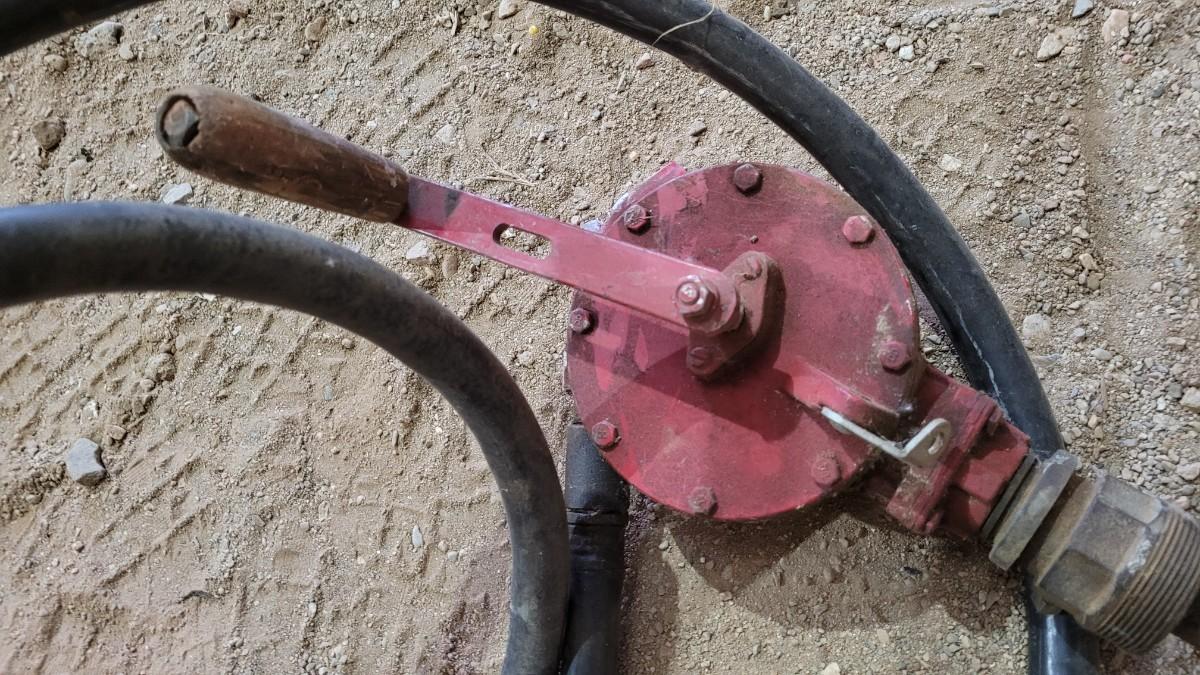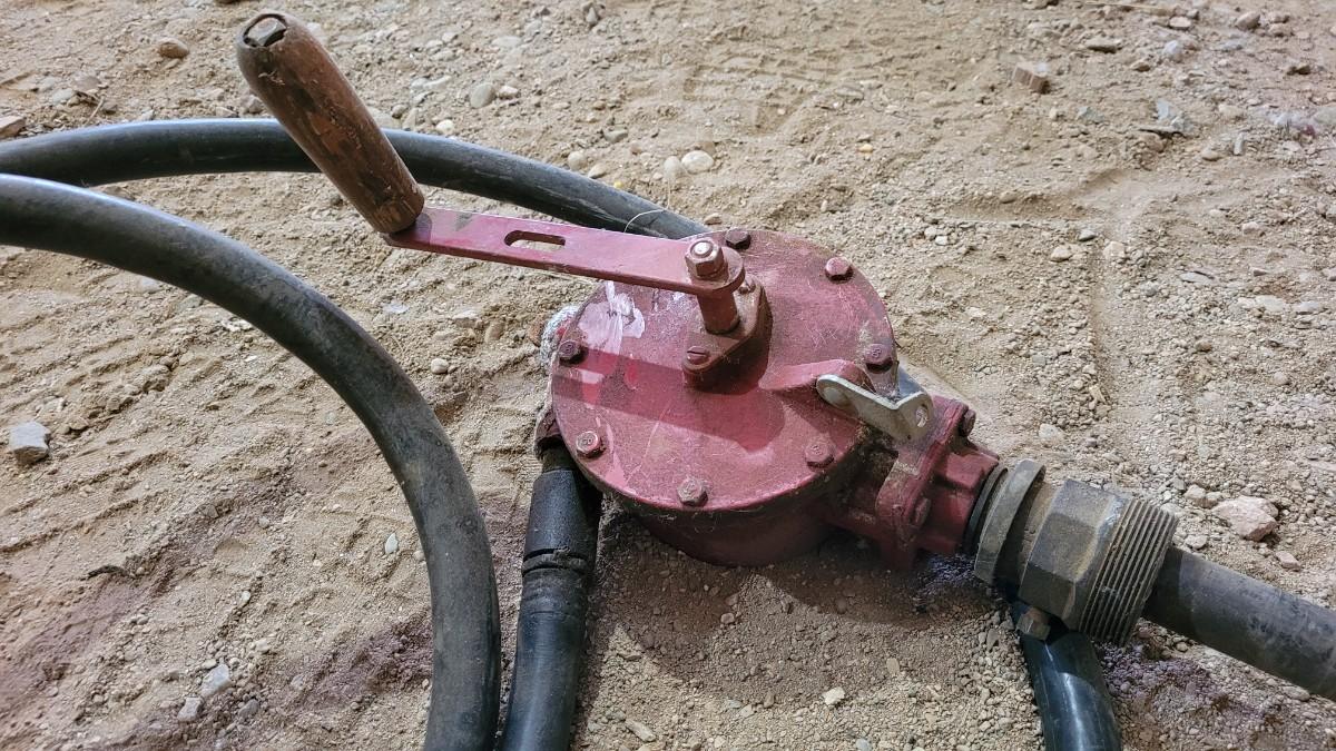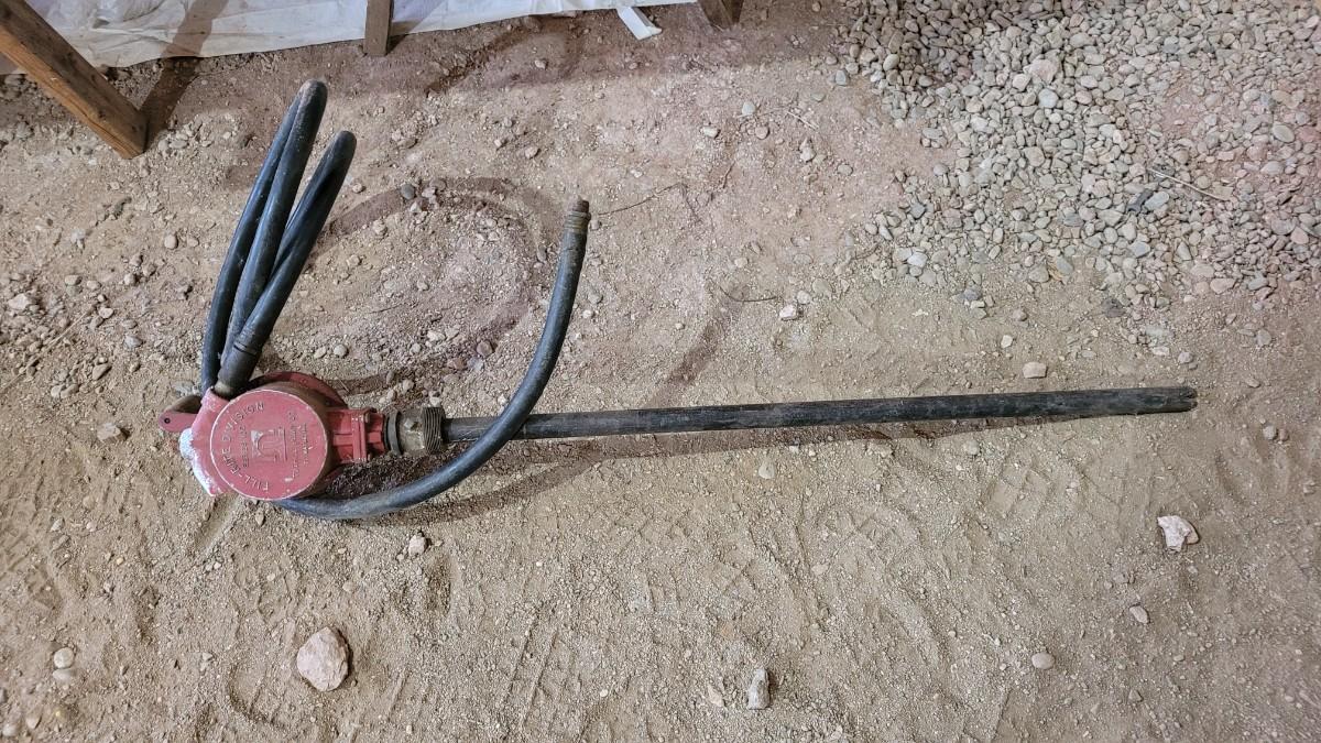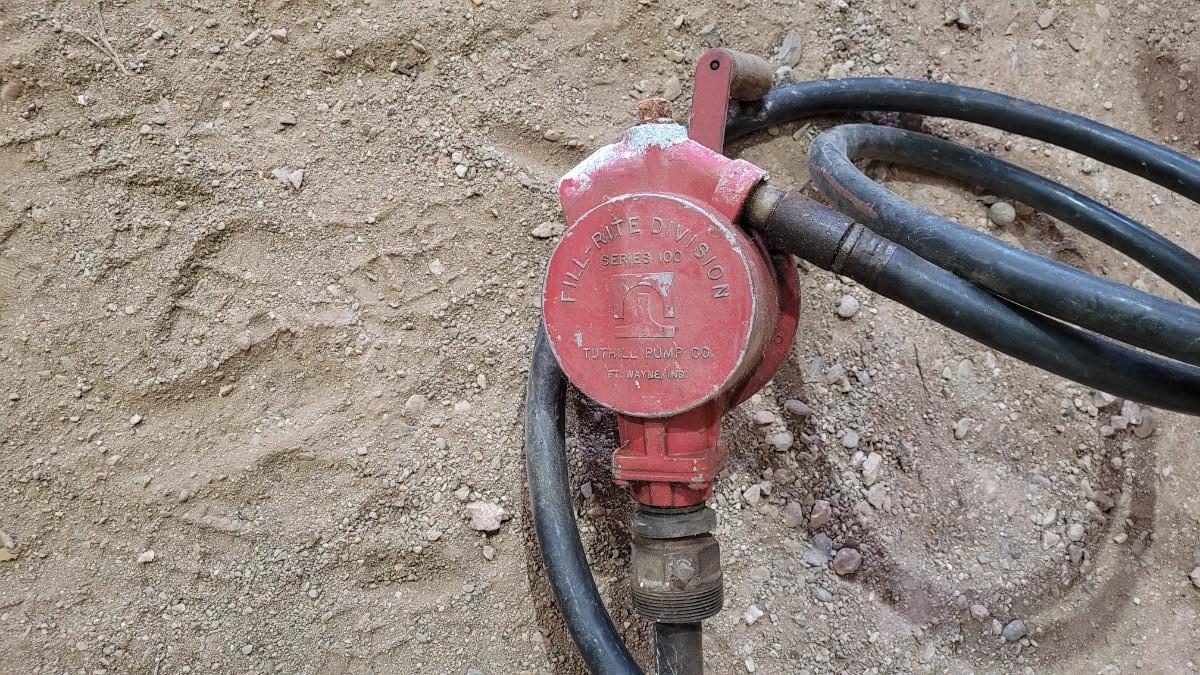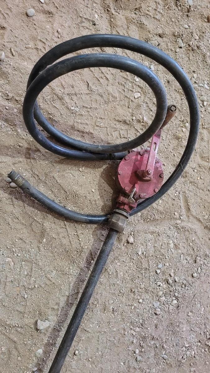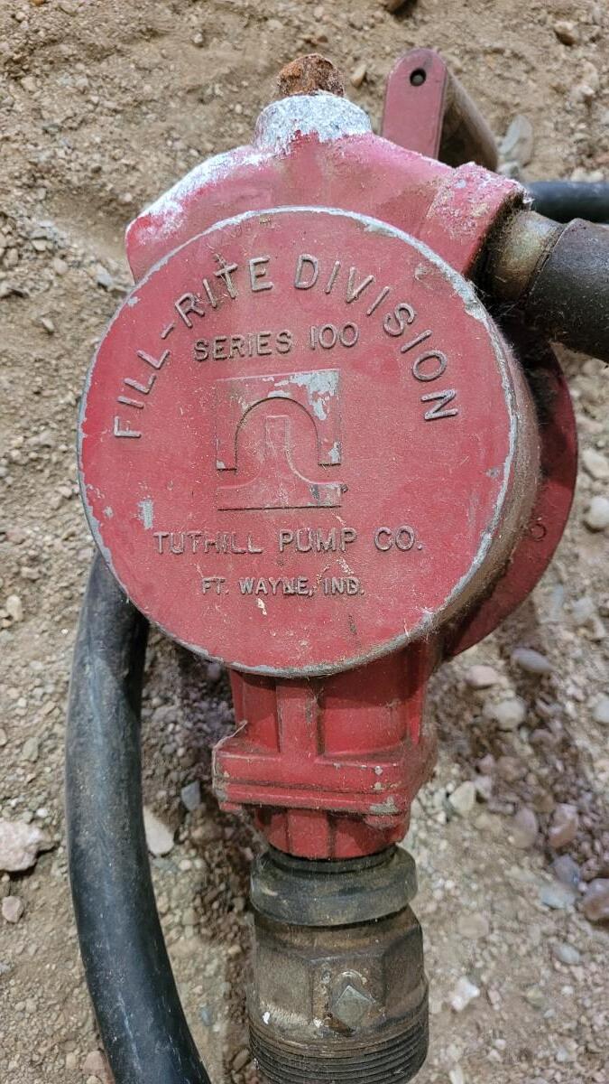 Lot 321: Vintage Farm Hand Crank FILL RITE Series 100 Pump w/ Original Hose Remnant