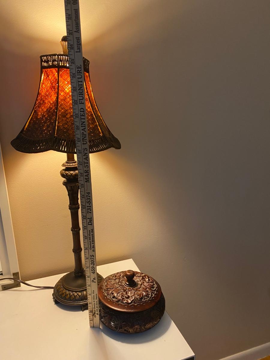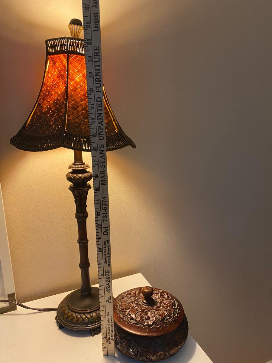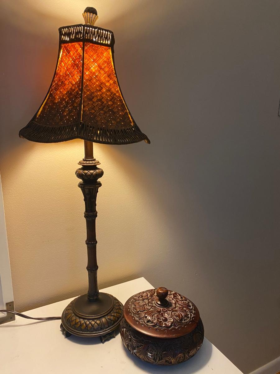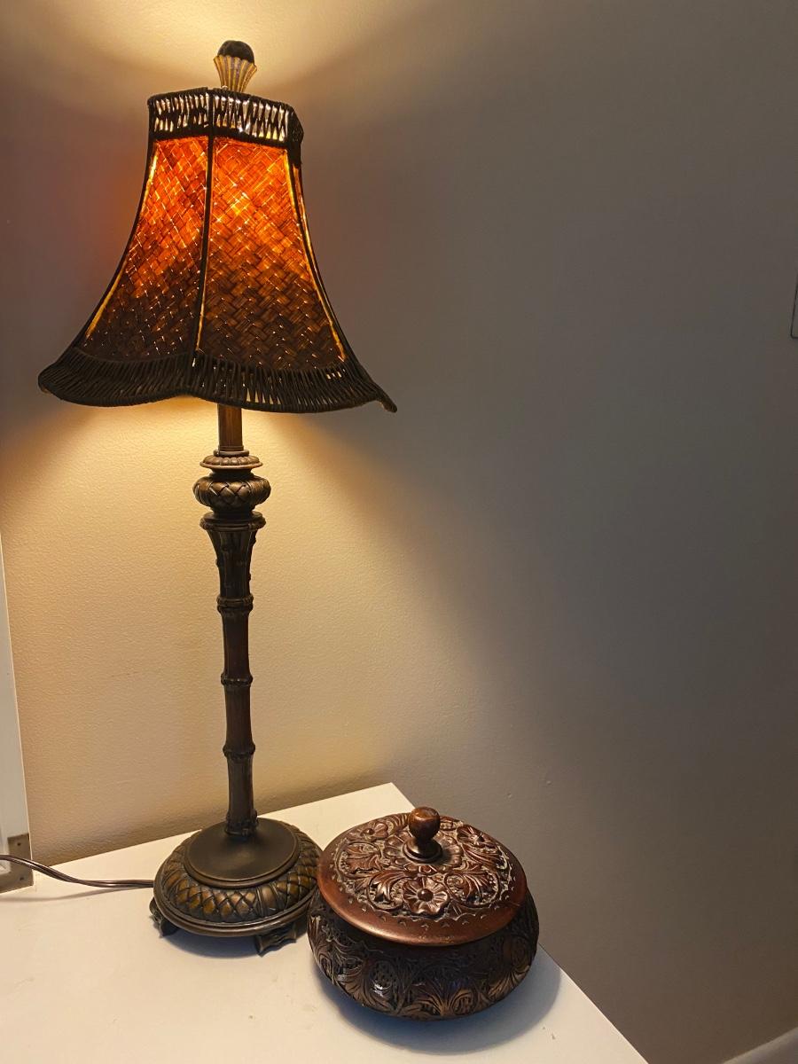 Rose wood trinket box is beautifully carved Lamp has metal base.