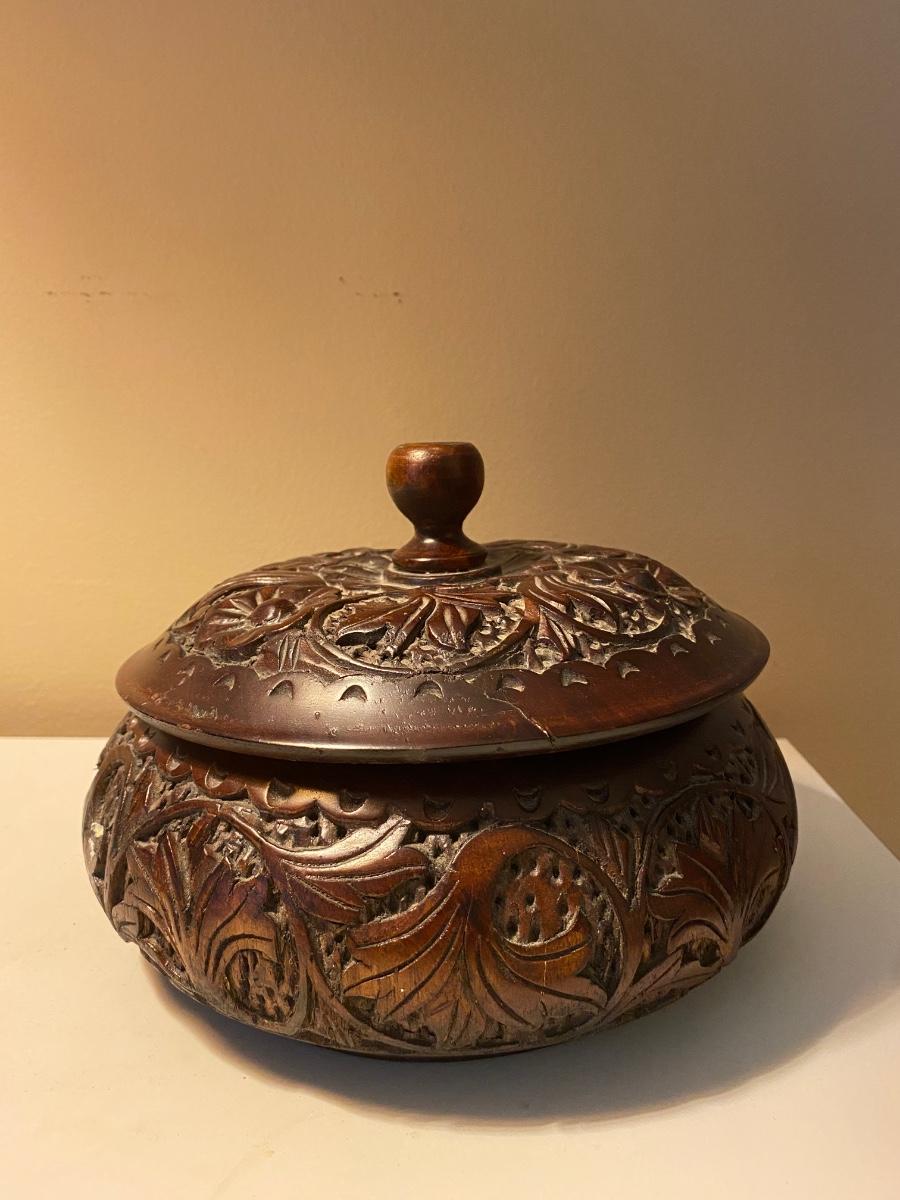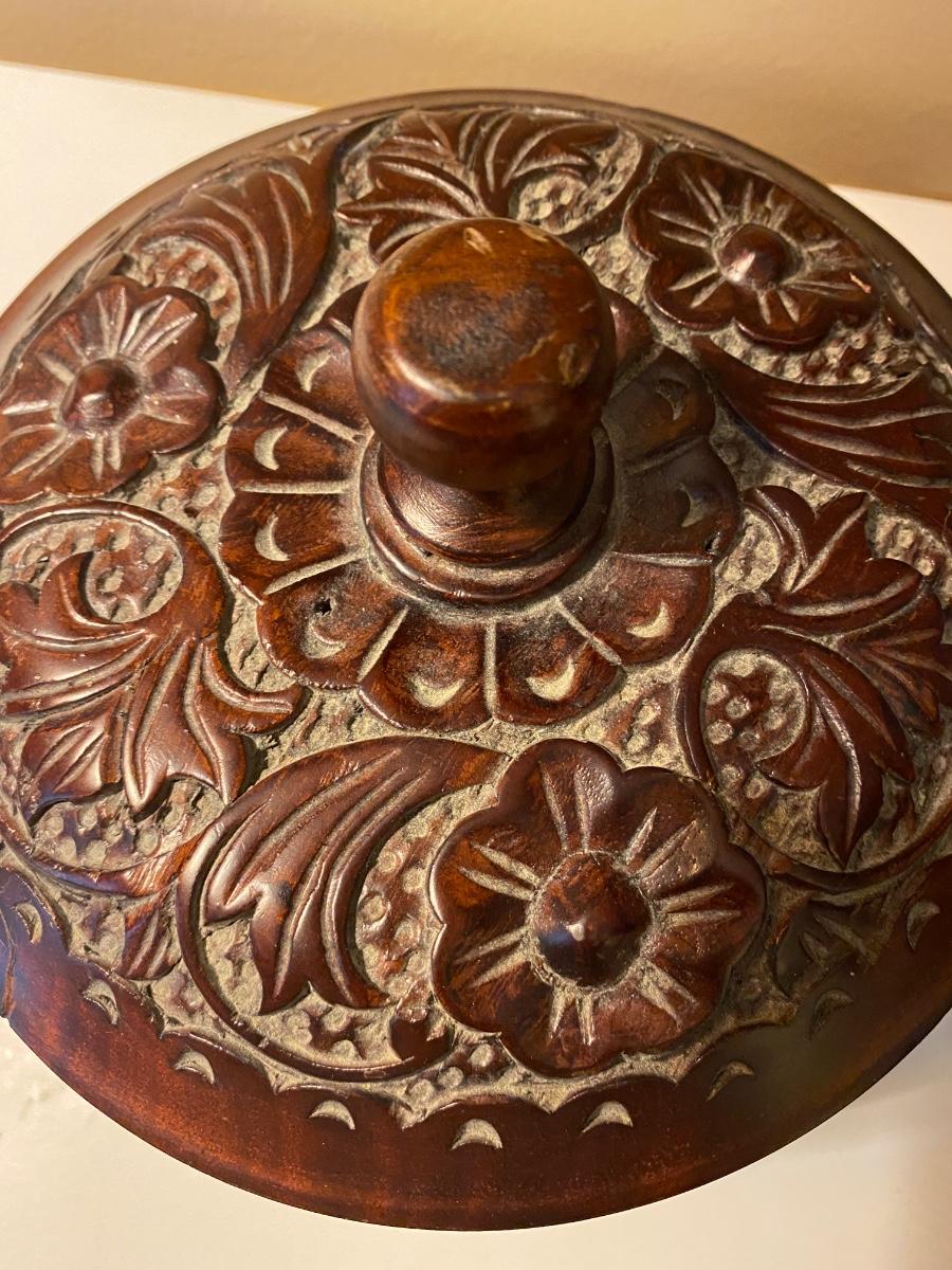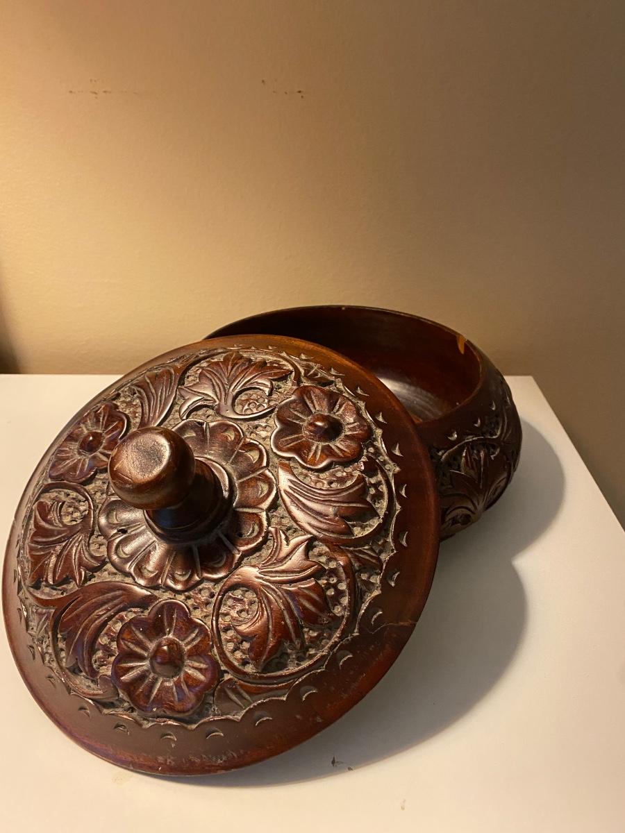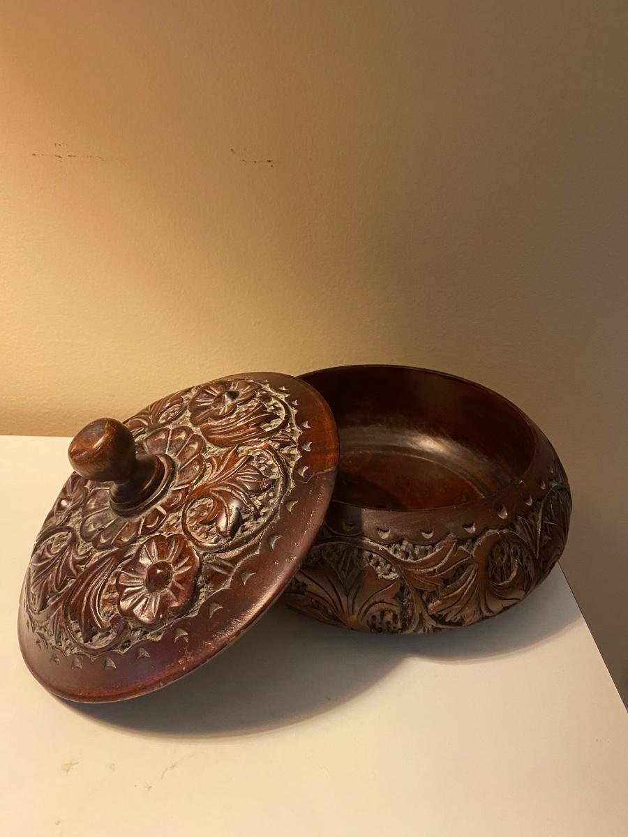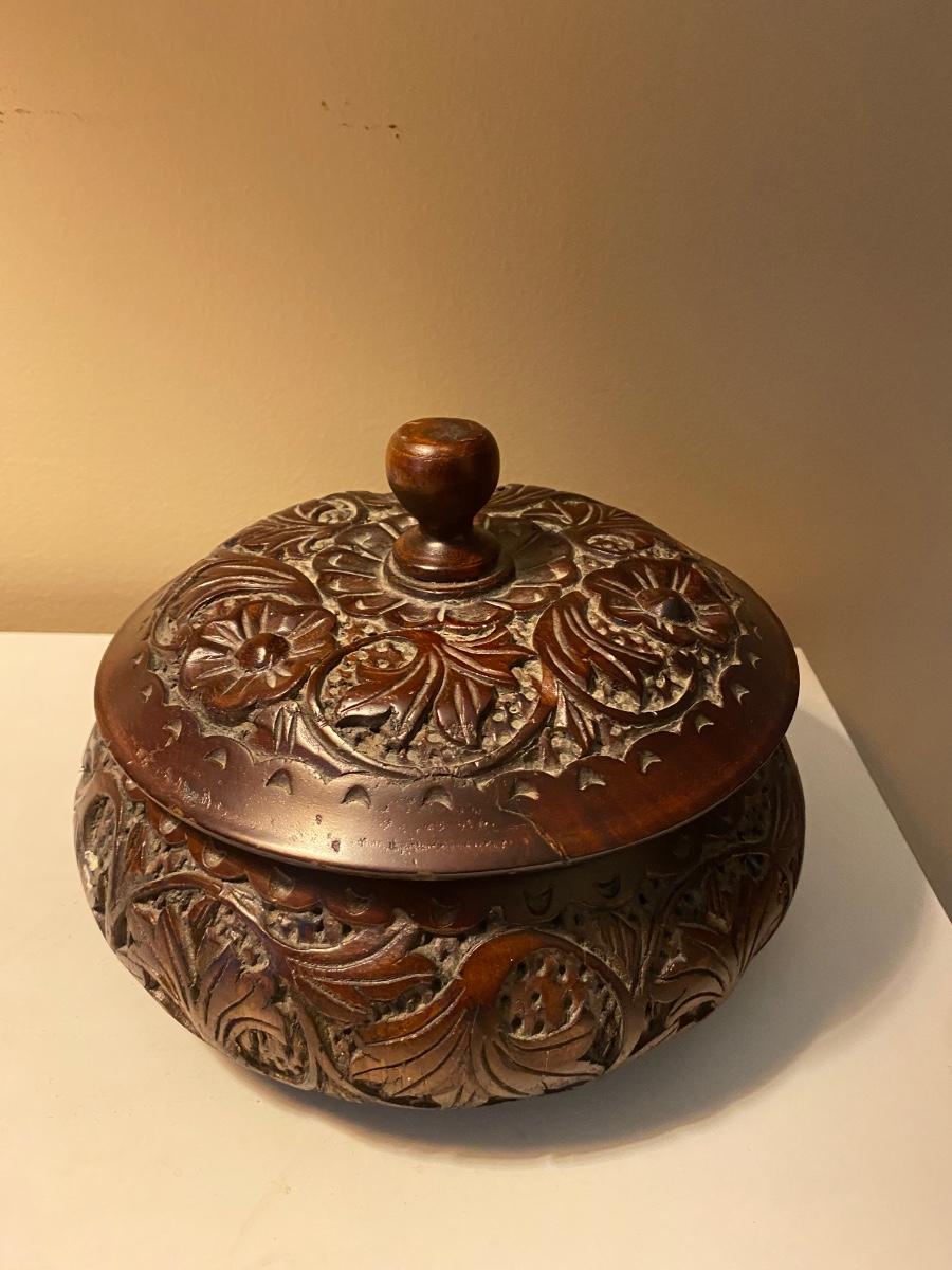 Rose wood trinket box is beautifully carved Lamp has metal base.