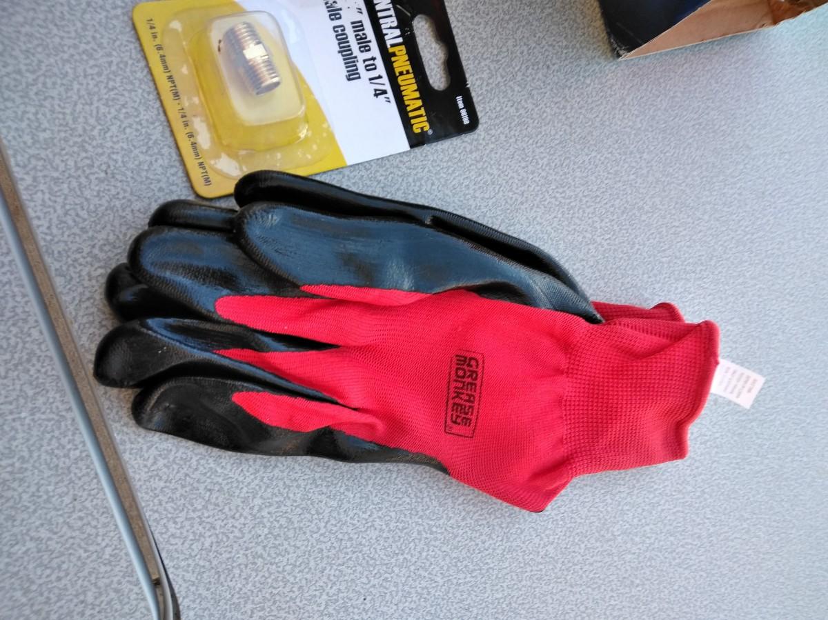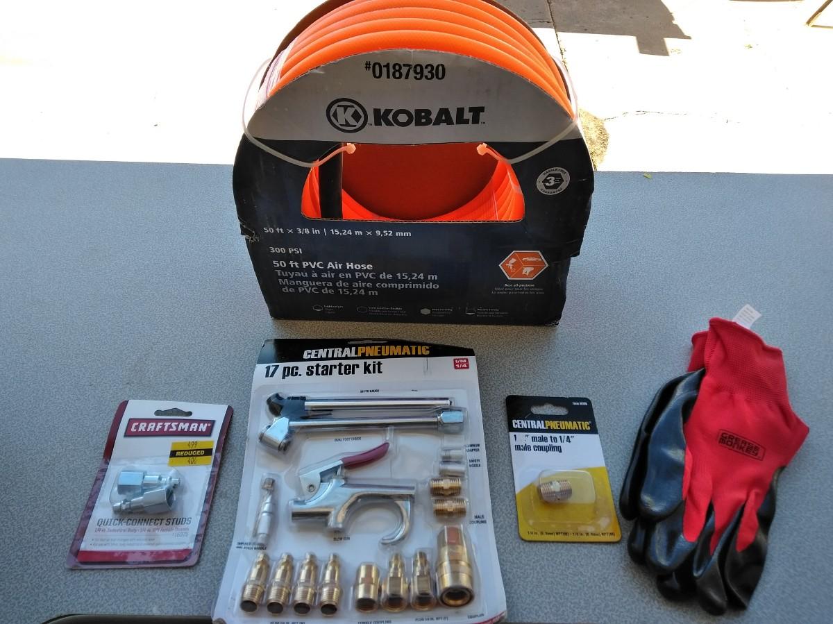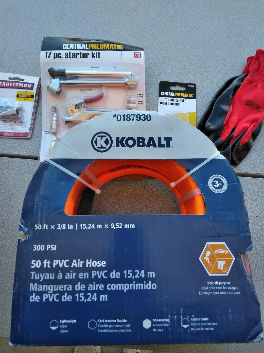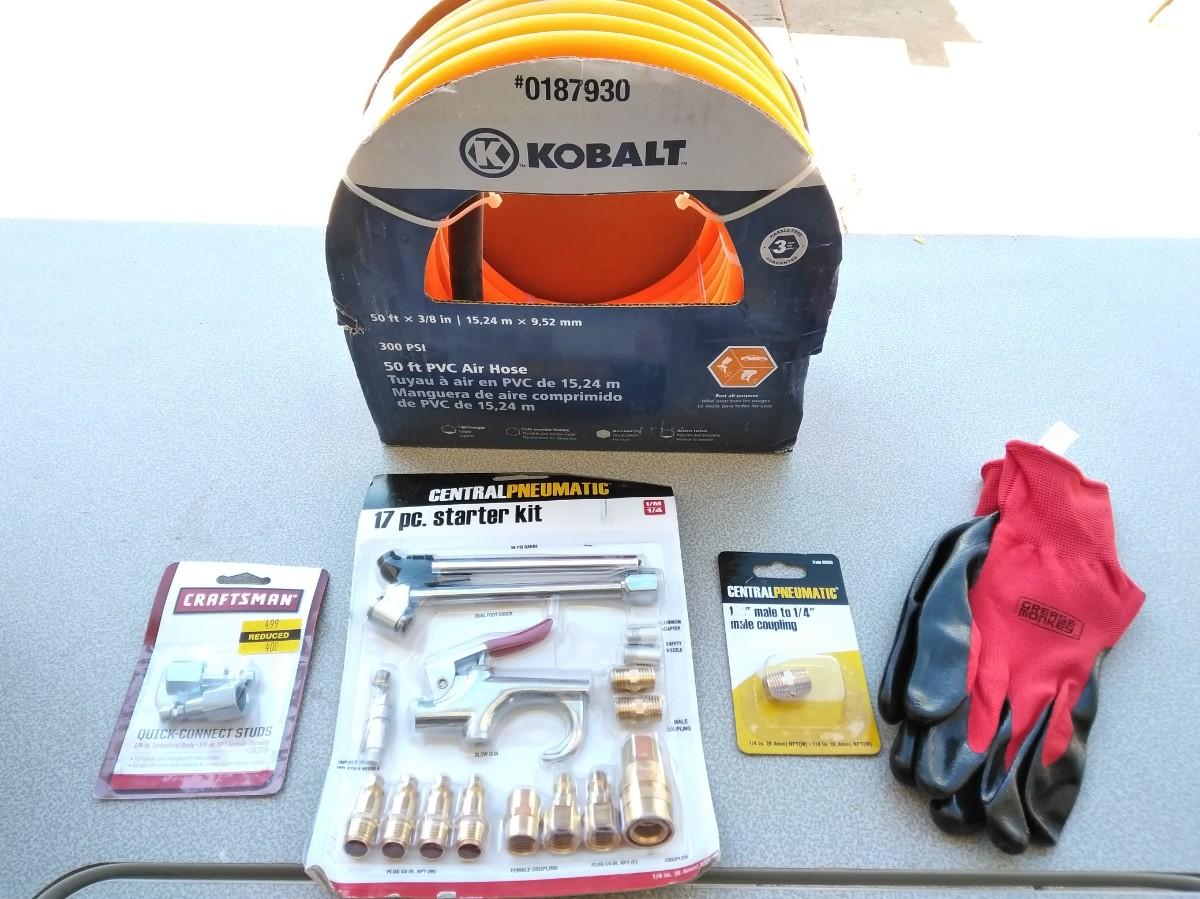 KOBALT 50 FT. AIR HOSE AND AIR COMPRESSOR ATTATCHMENTS WITH A PAIR OF WORK GLOVES
