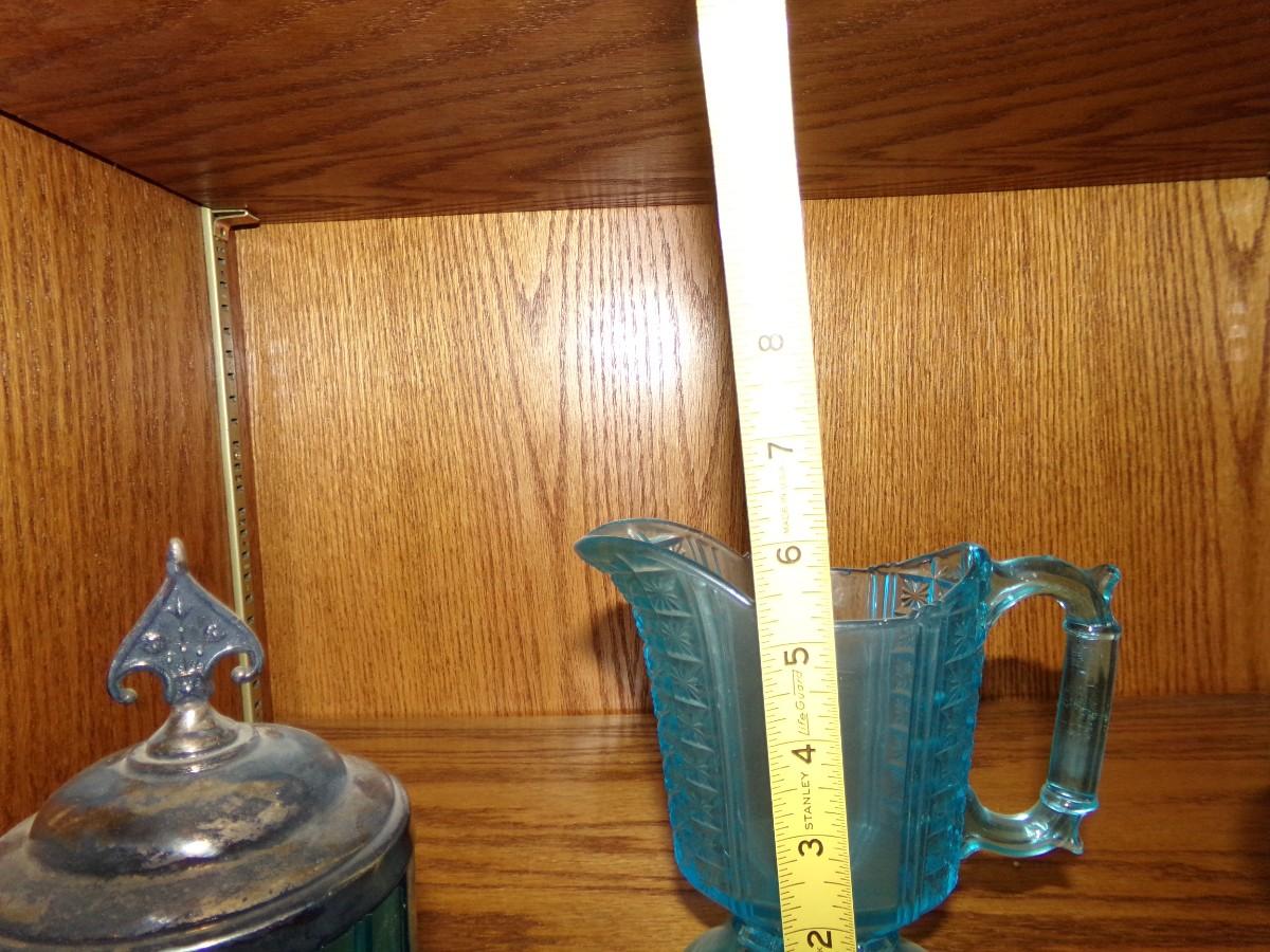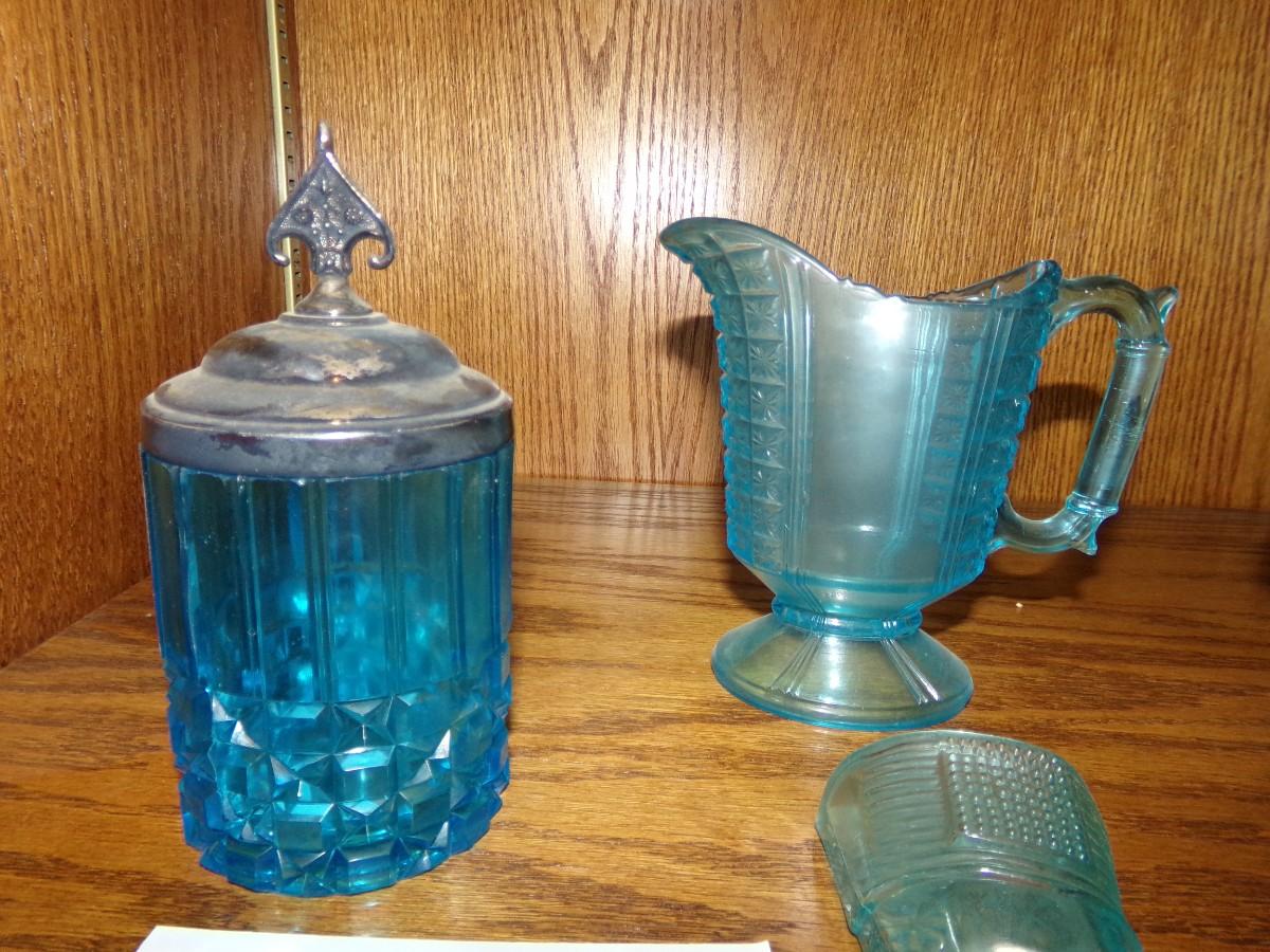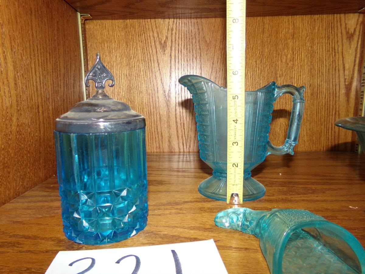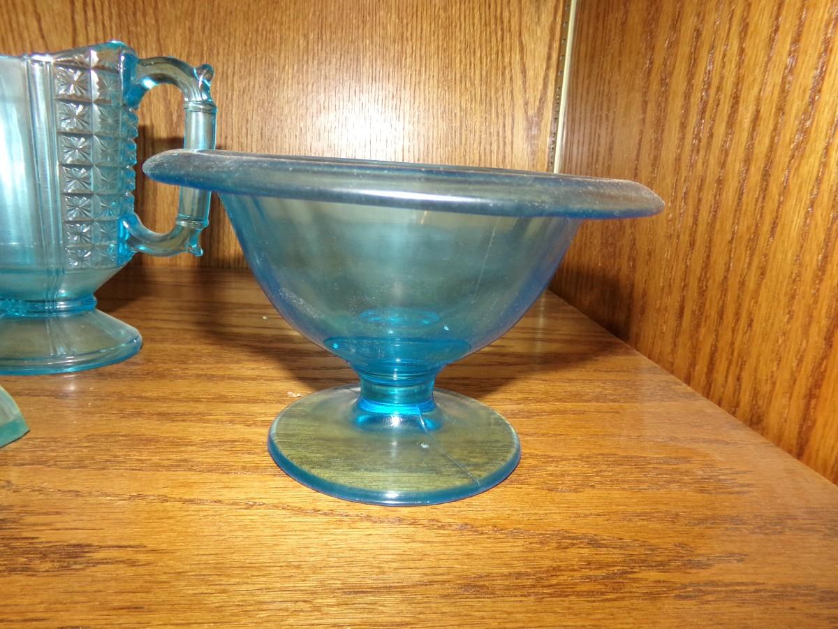 VINTAGE BLUE GLASS DISH WITH LID, PITCHER, BOWL ON A PEDESTAL AND MORE.