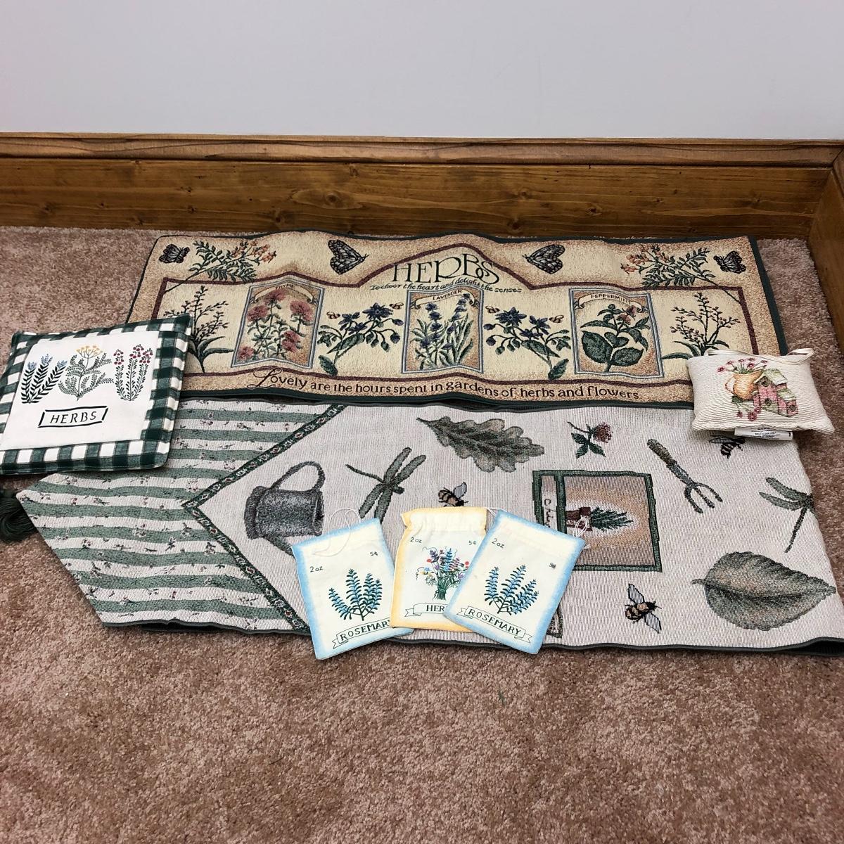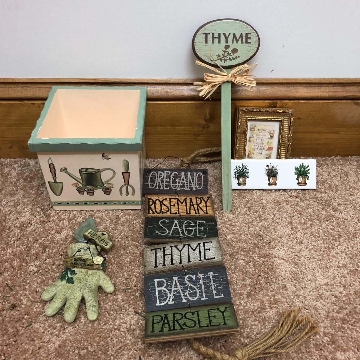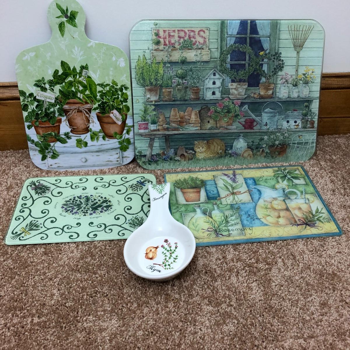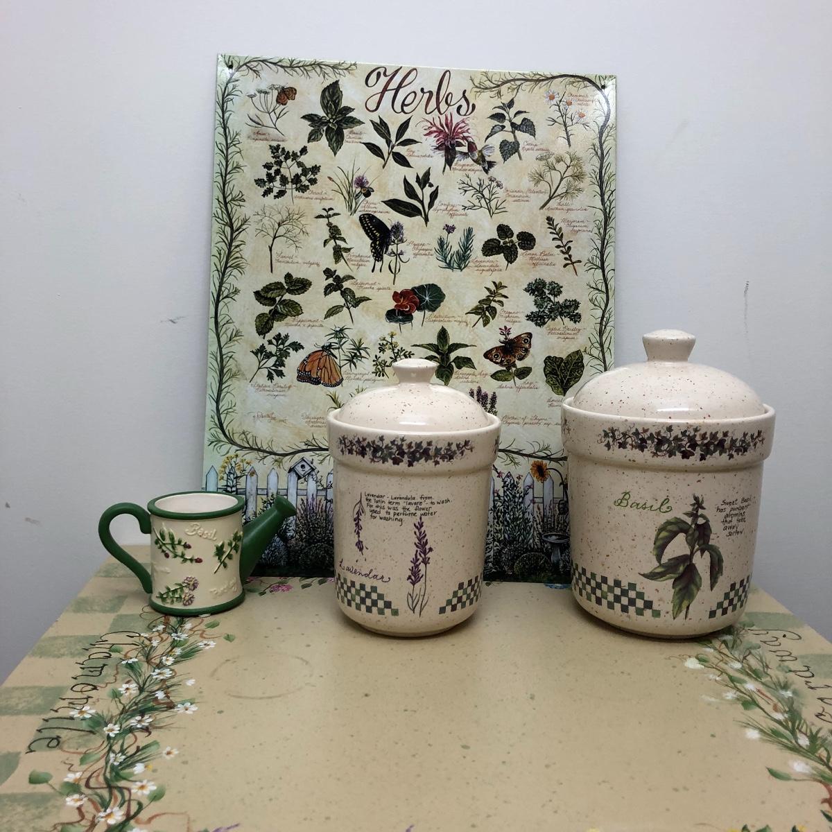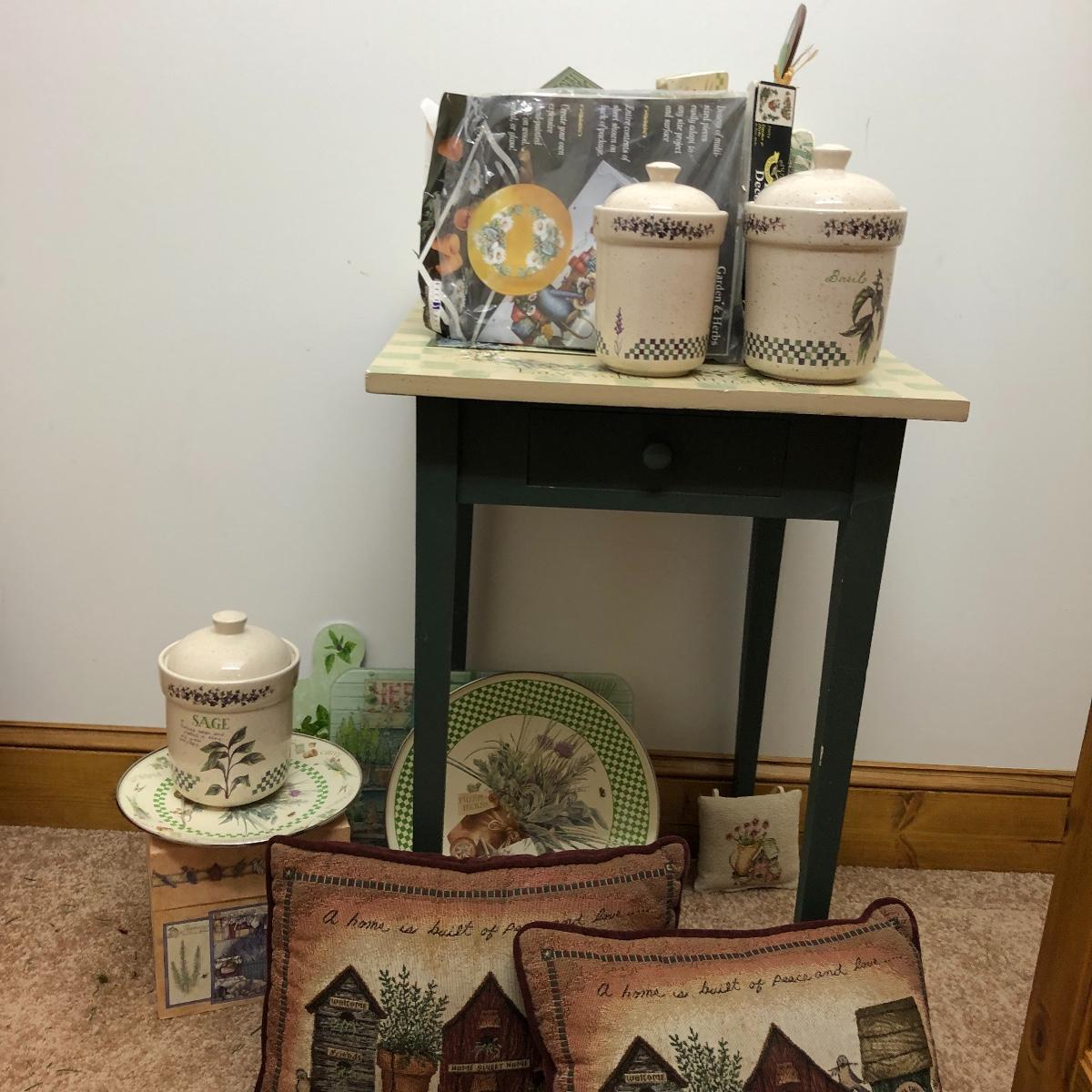 A great find for the chef or gardener. This Lot includes a table, four cutting boards, three pillows, spoon rest, two Marjolein Bastin metal serving plates, three Treasure Craft Canisters, Yankee Candle holder, frame and more. The Table measures 20” x 20” x 30”.
