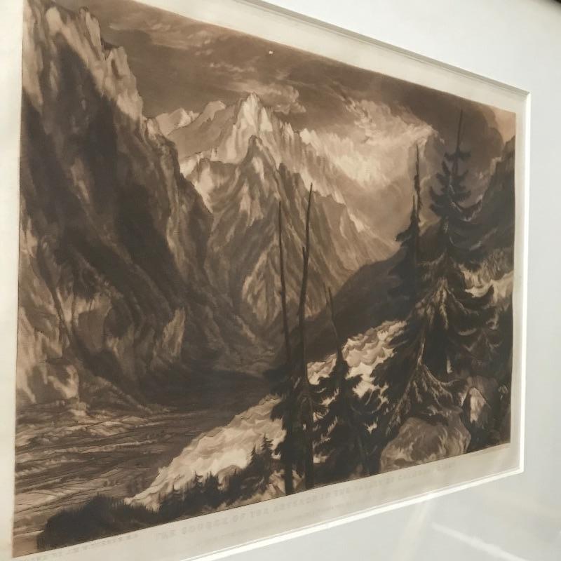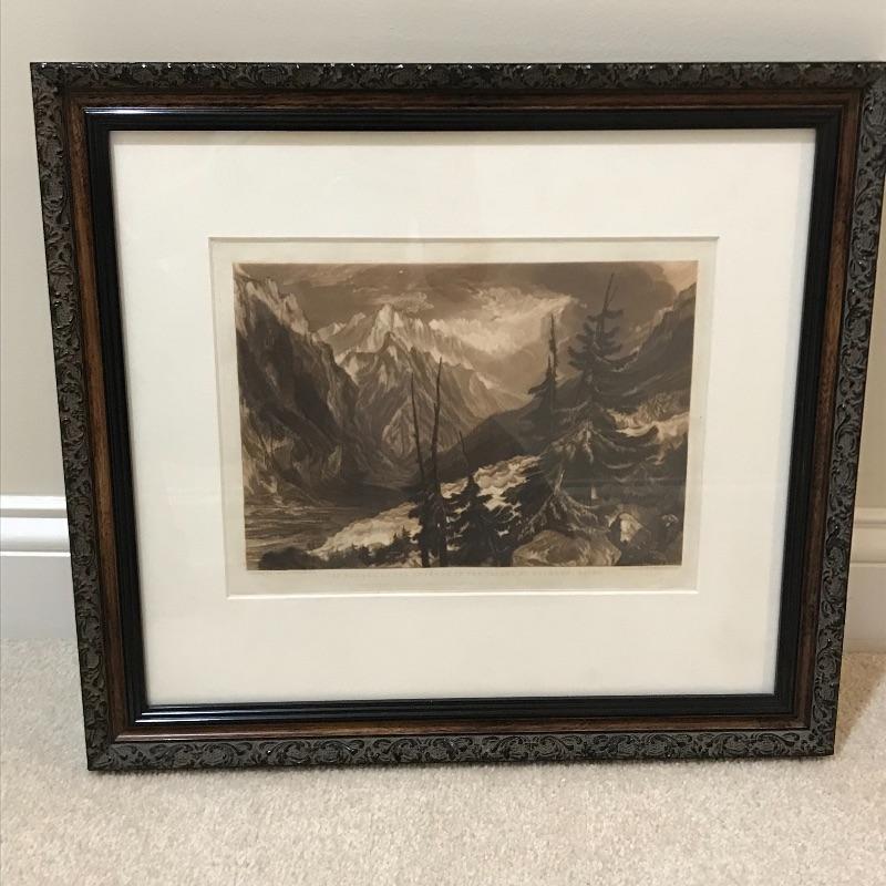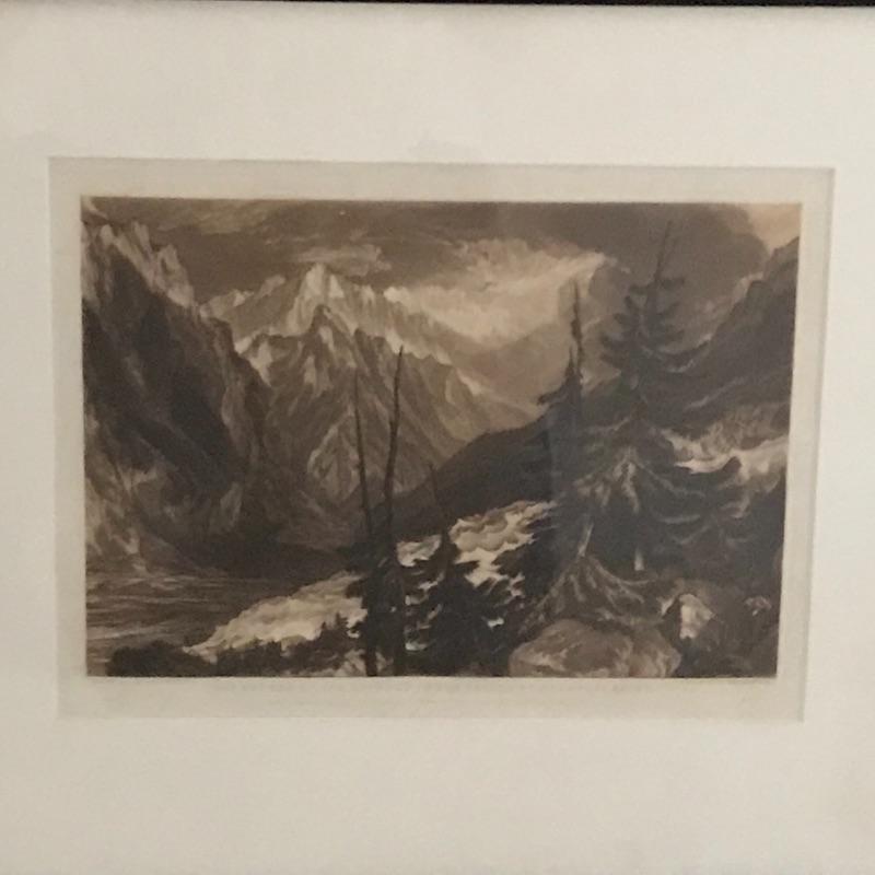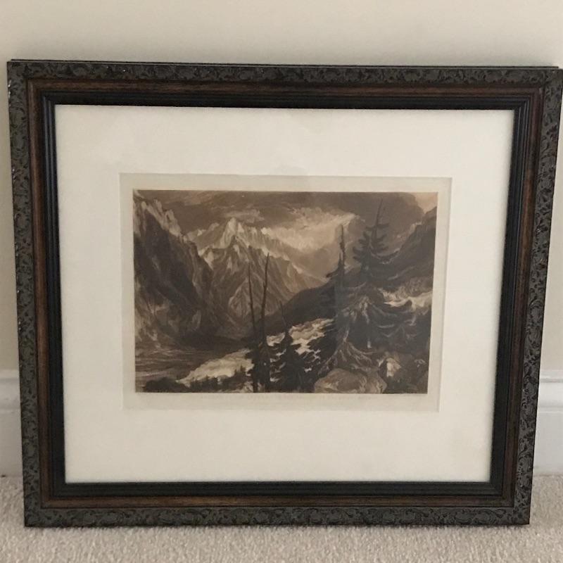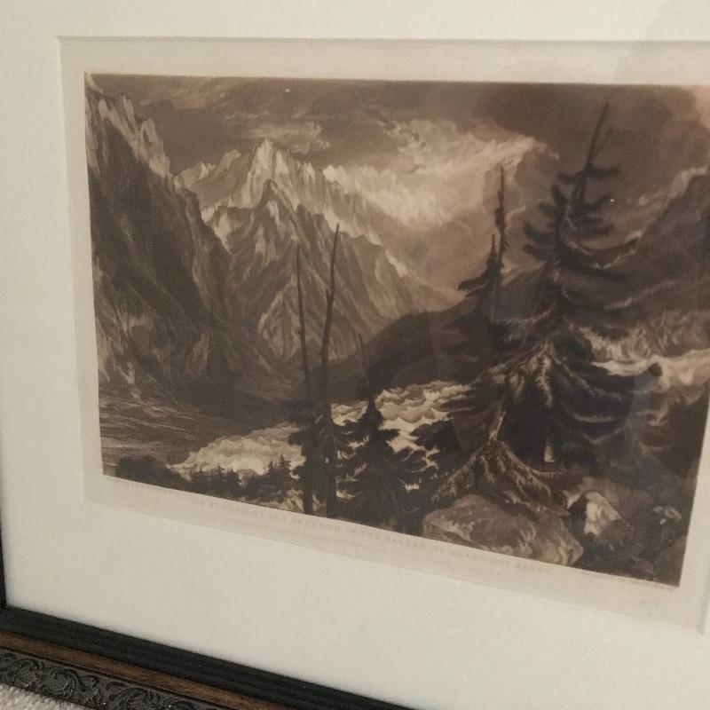 This gorgeous artwork is titled “The Source of the Arveron In the Valley of Chamoini Savoy” and was drawn by J.M.W. Turner and engraved by Thos Lupton. Turner etched the copper plates, then gave him to a professional engraver to add the mezzo tint engraving. This piece appears to have been purchased for $750 in 1987. Approx. 18” x 16.5”. See images. Comes with documentation.