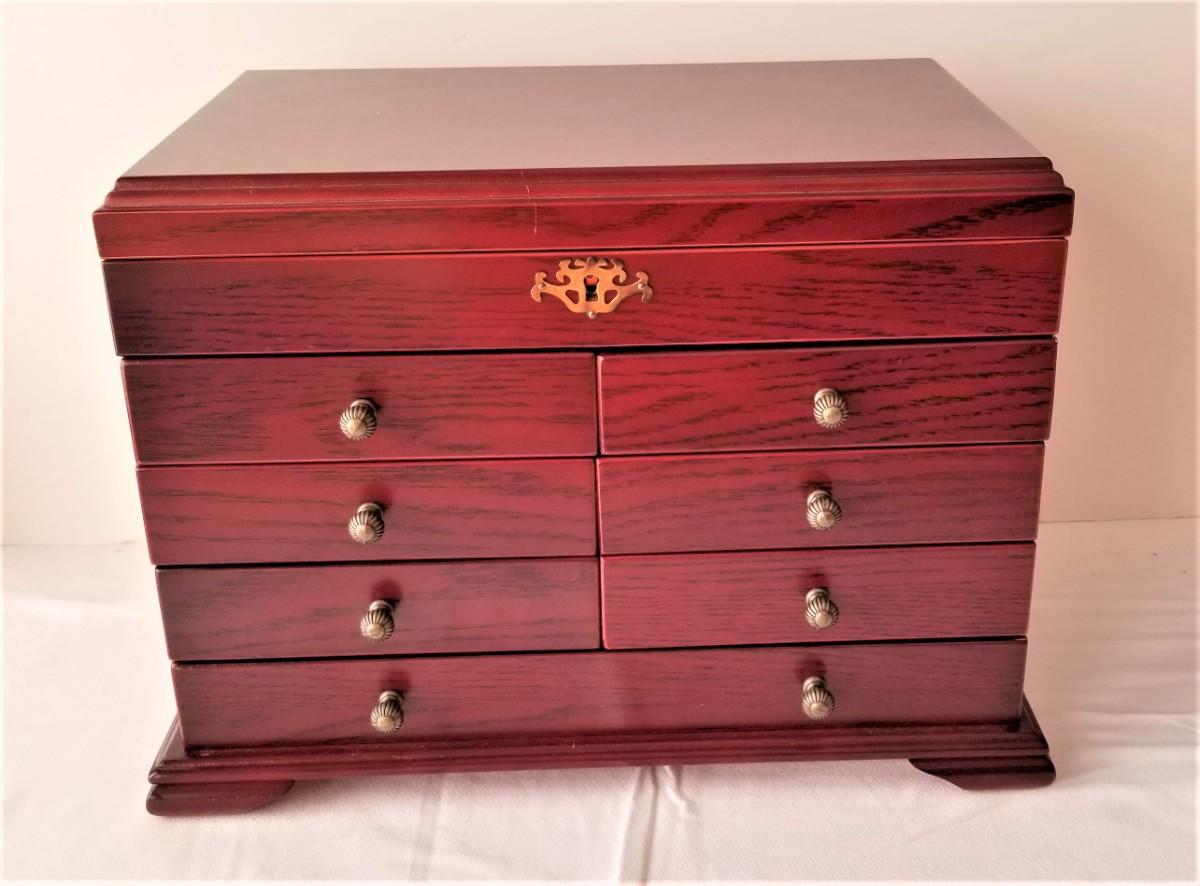 Gently used Thomas Pacconi Jewelry Box - 7 drawers - top opens with mirror inside. 11" tall, 9" deep, 14" across. A nice piece.