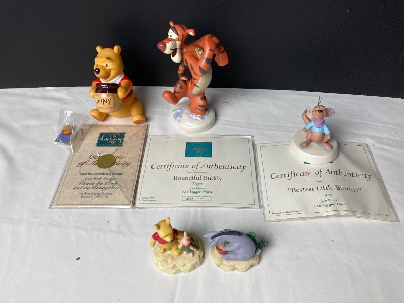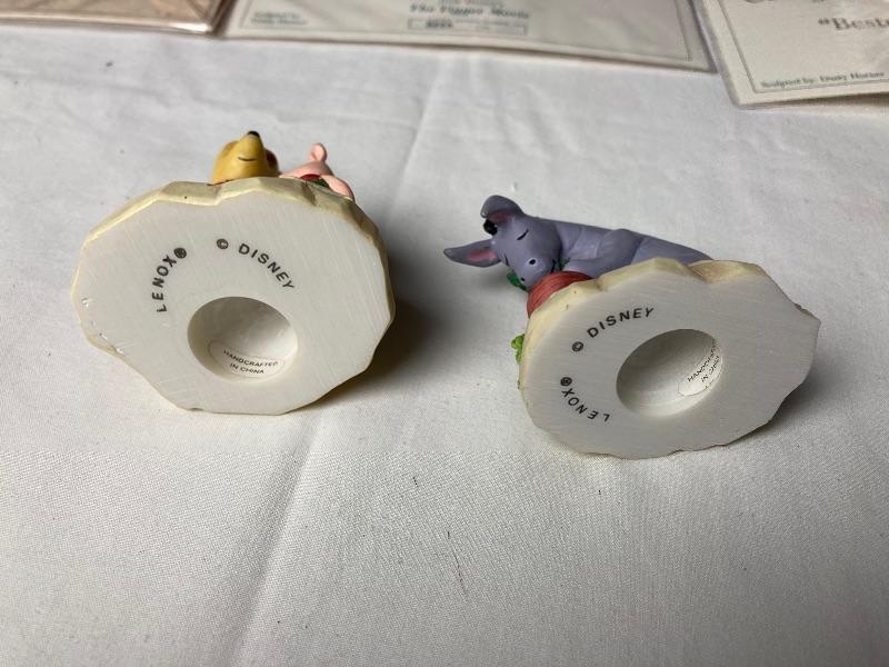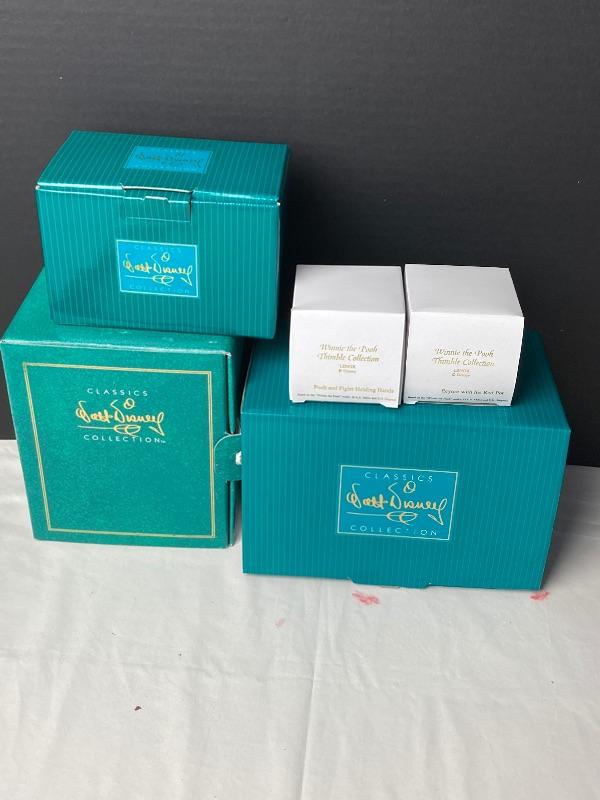 Winnie The Pooh characters- Roo “Bestest Little Brother” porcelain figurine, Pooh “Time For Something Sweet” porcelain figurine and Tigger “Bounciful Buddy” porcelain figurine. Two Lenox Thimbles “Pooh and Piglet Holding Hands” and “Eeyore With His Red Pot”