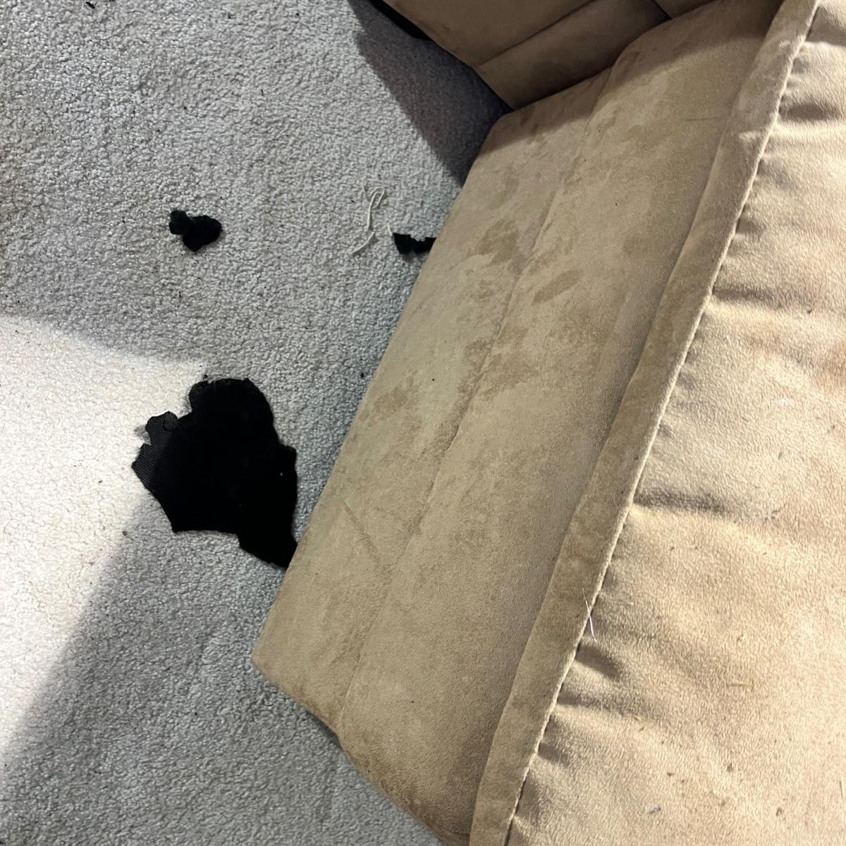 arm chair and ottoman tan (sever damage to bottom of ottoman)