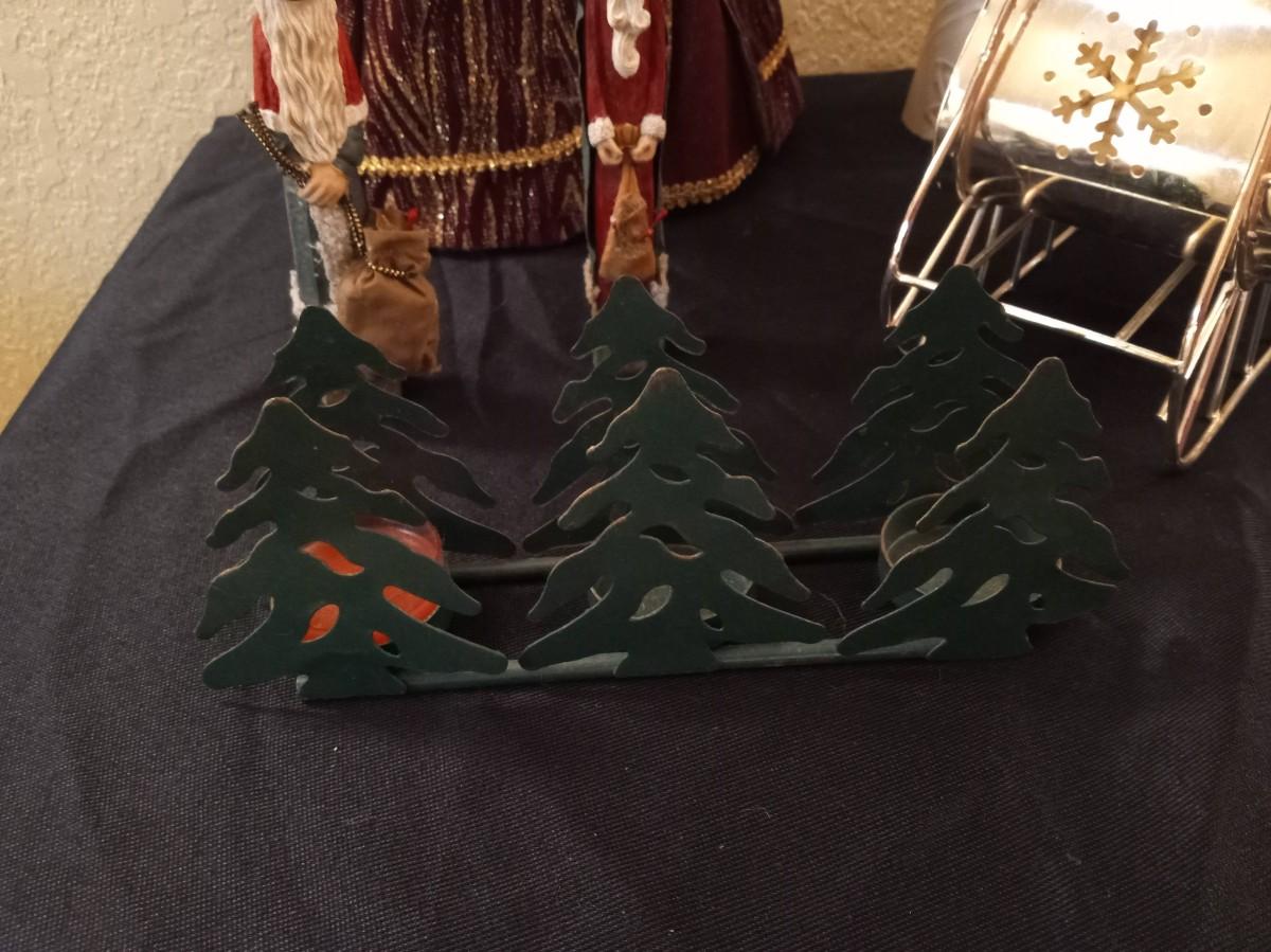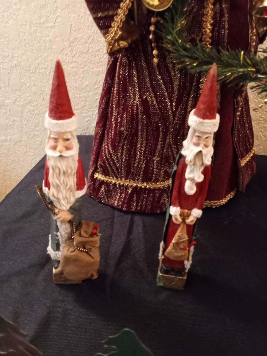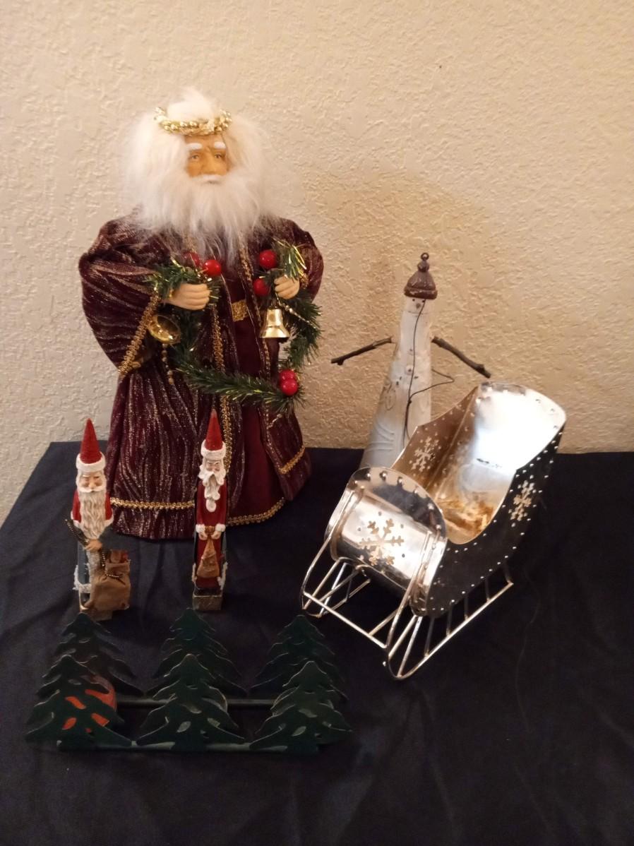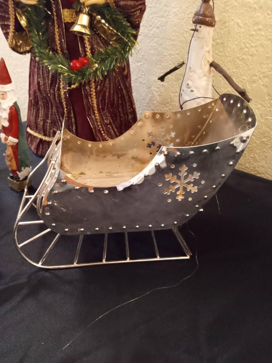 2 SMALLRESIN SANTAS, OLD WORLD SANTA APPROX 15" TALL, METAL SLEIGH AND METAL SNOWMAN