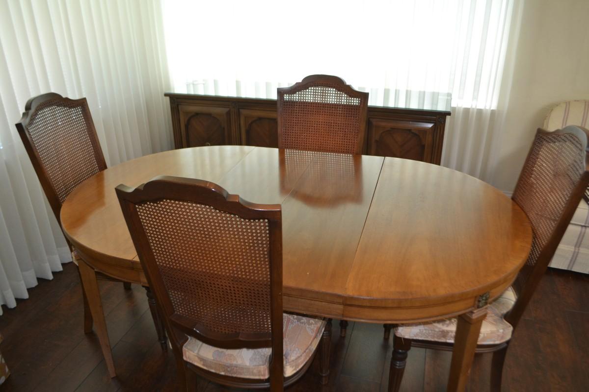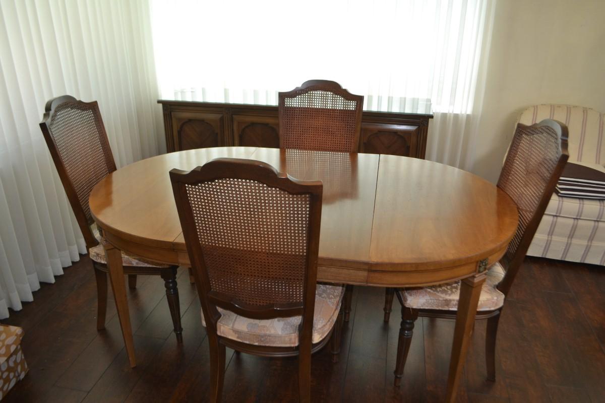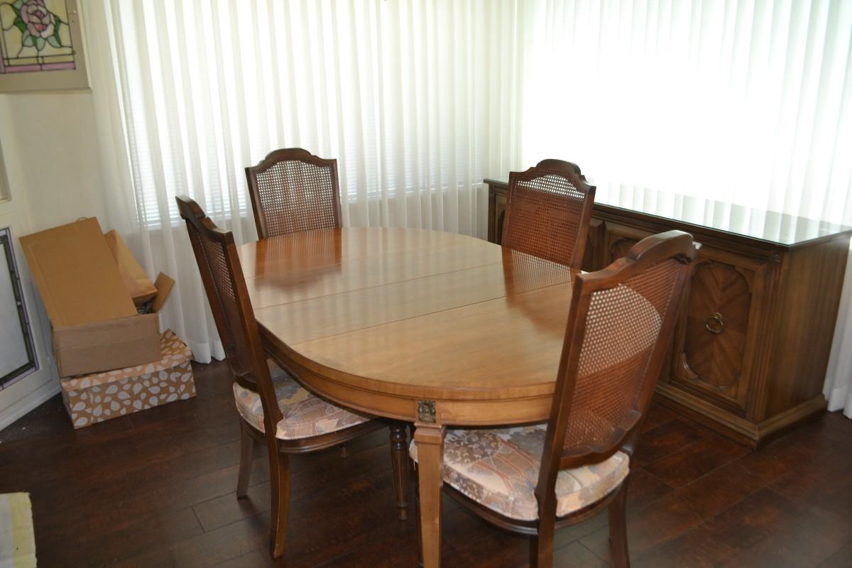 VINTAGE DINING TABLE WITH CANE BACK CHAIRS. 66" LONG, 42" ACROSS