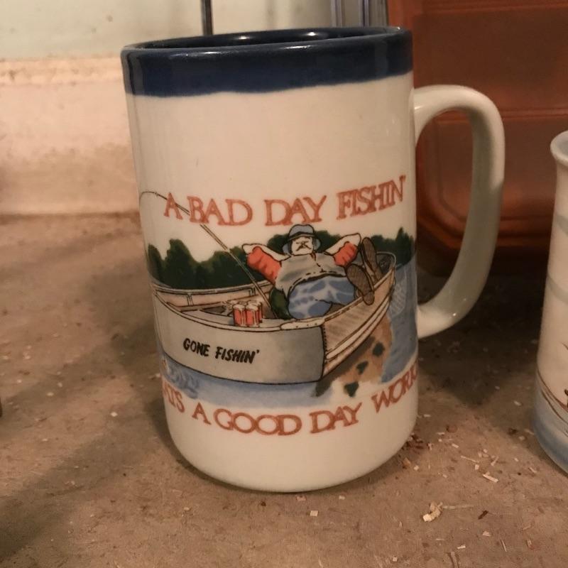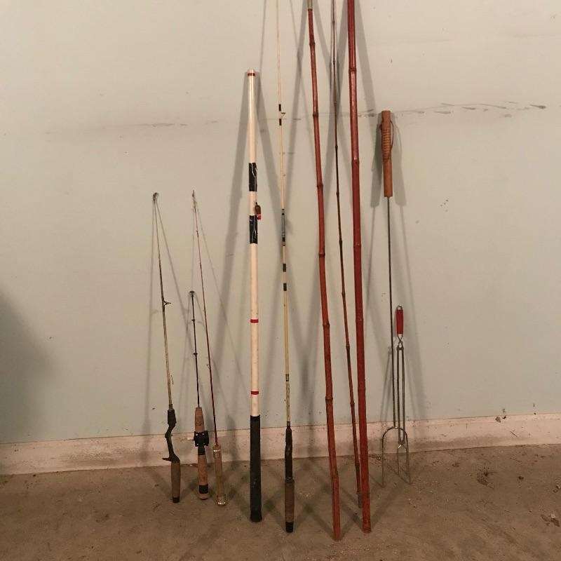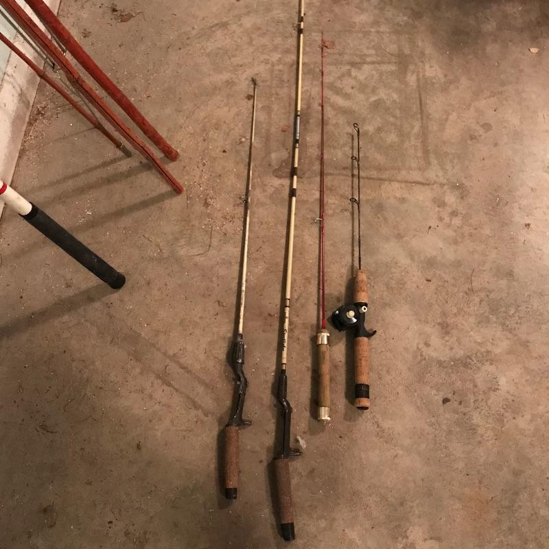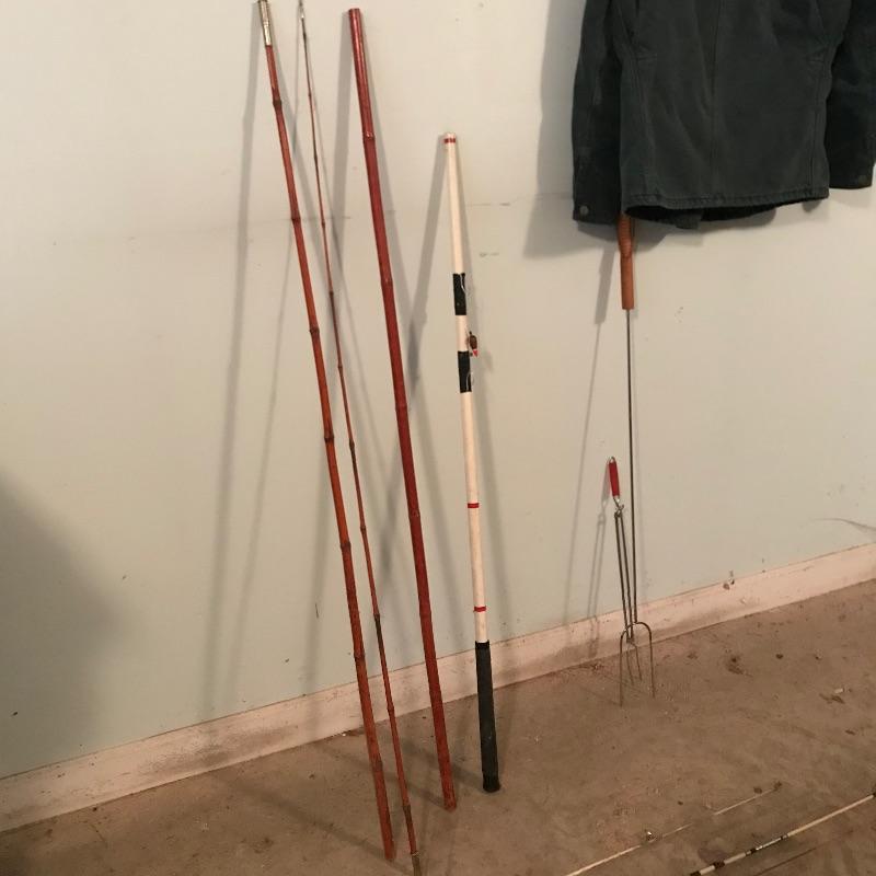 Nice forest green Carhartt jacket size extra large. Large bamboo cane fishing pole with more poles named Johnny Walker, Sportfisher and Berkley. The Bamboo pole cannot attach the middle and largest pieces together and has split about a third of the way up. Each bamboo piece is around 57”. The middle and top piece fit together well. The Berkley Northern Lites is lightweight and has a reel attached. Lot also contains two mugs, a Plano Magnum organizer and a forest green XL hat. See photos. No shipping.