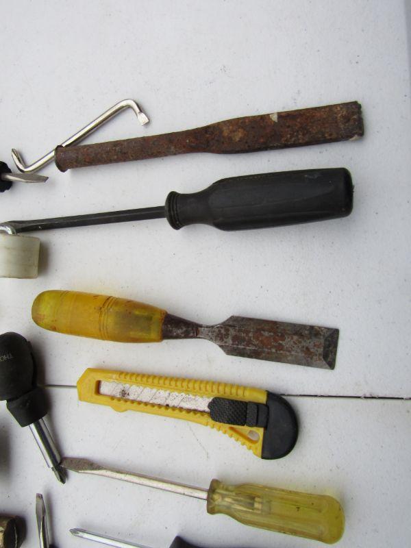 ASSORTMENT OF SCREWDRIVERS, PUTTY KNIVES, CHISELS, UTILITY KNIFE, NAD MORE