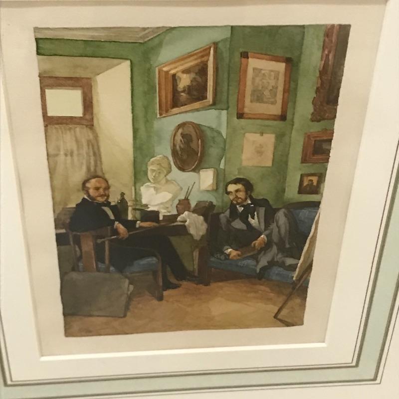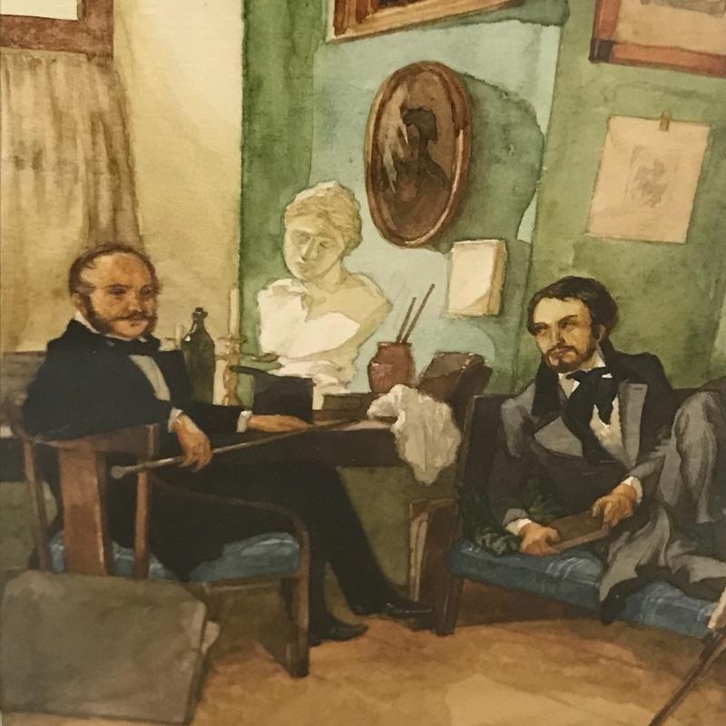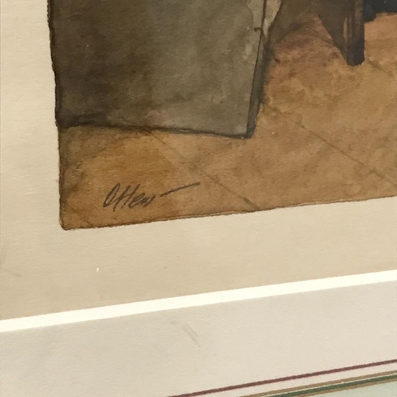 This framed watercolor is signed by the artist whose name is illegible (OHem? OHeus? OHenry are possibilities). Subjects appear to be noblemen and/or artists.