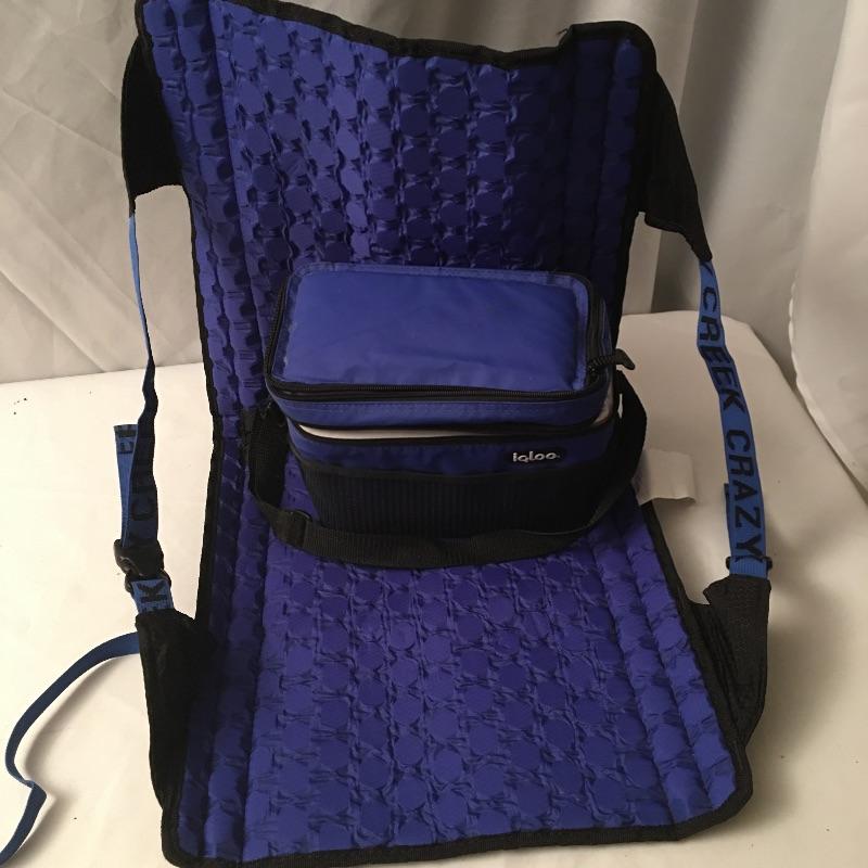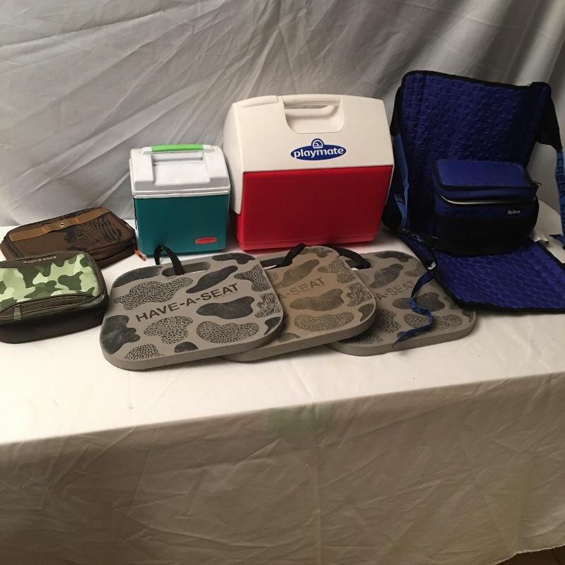 Tailgating essentials includes Igloo and Rubbermaid hard coolers, two Arctic Zone and one Igloo lunch bags, three Have a Seat pads and a Crazy Creek chair. Be ready for lunch or any sporting activity with this useful lot. Largest Igloo cooler measures 10” x 15” x 15”.