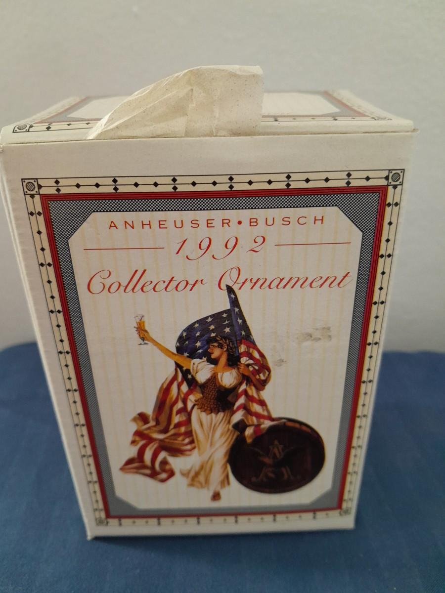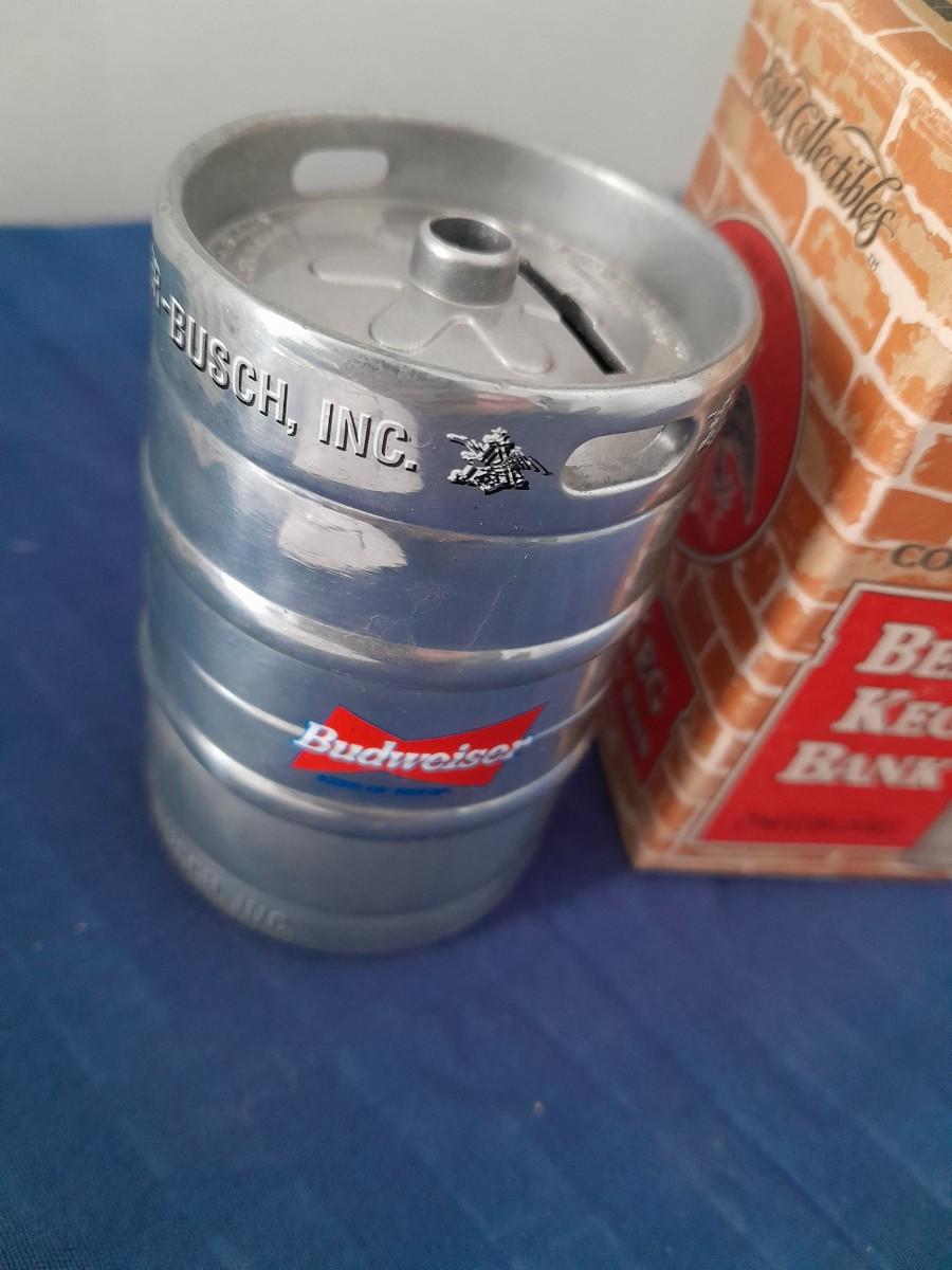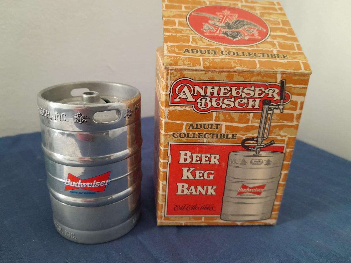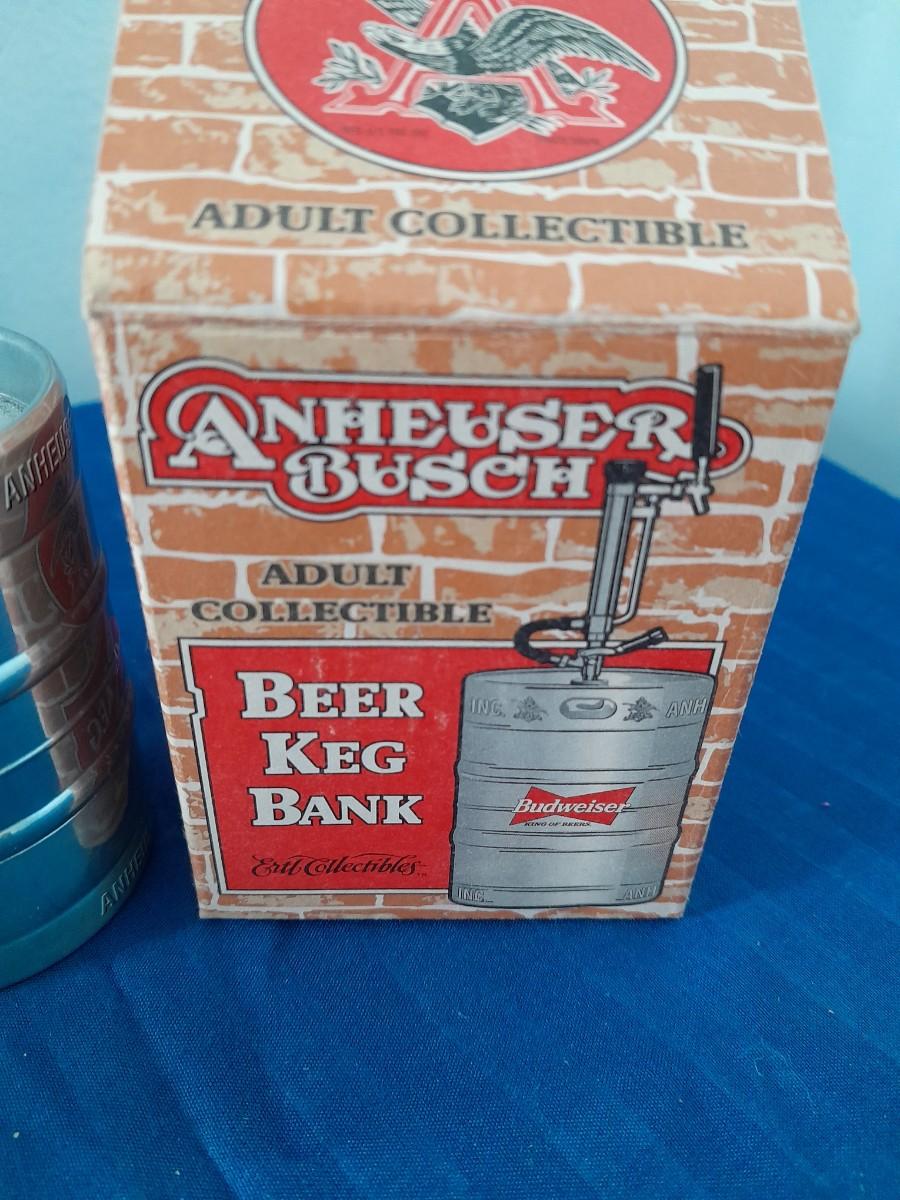 TWO COLLECTABLE ORNAMENTS, AND AN ANHEUSER BUSH BEER KEG BANK
