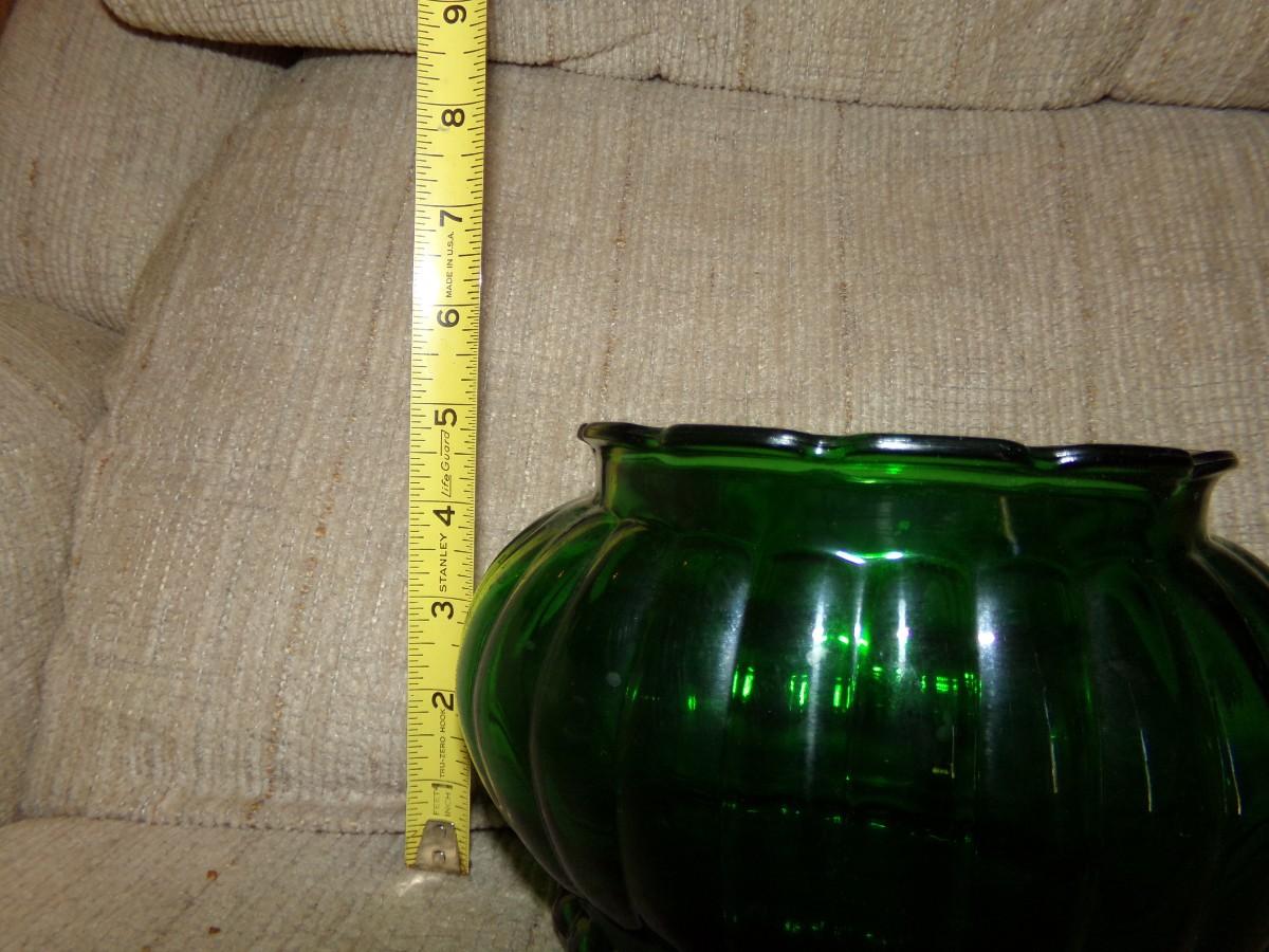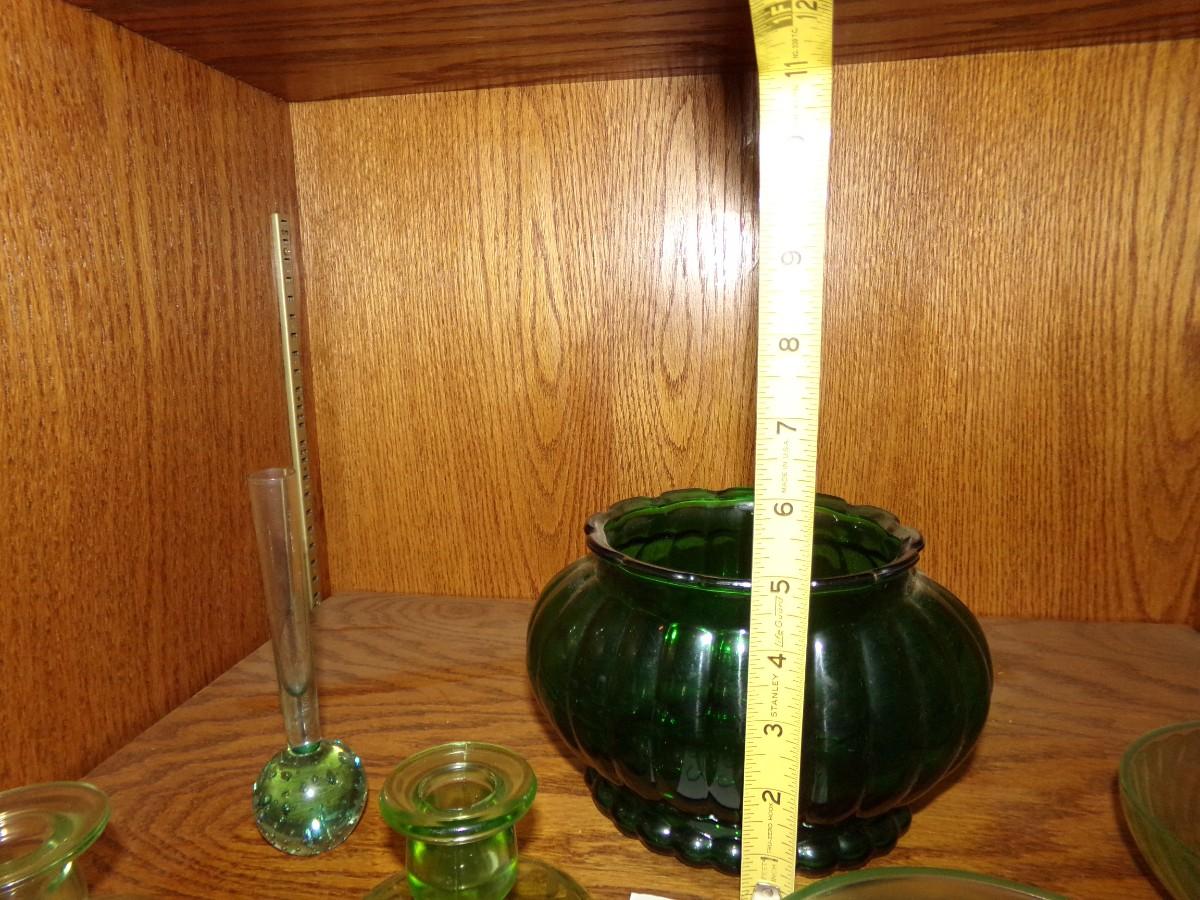 FORREST GREEN GLASS BOWL AND GREEN DEPRESSION GLASS BOWLS AND CANDLE HOLDERS.