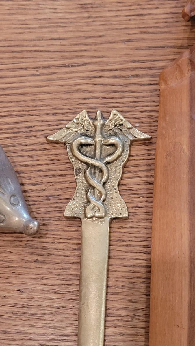 Brass Caduceus, Wood Antelope, Silver tone Jewish Star and Brass Mouse