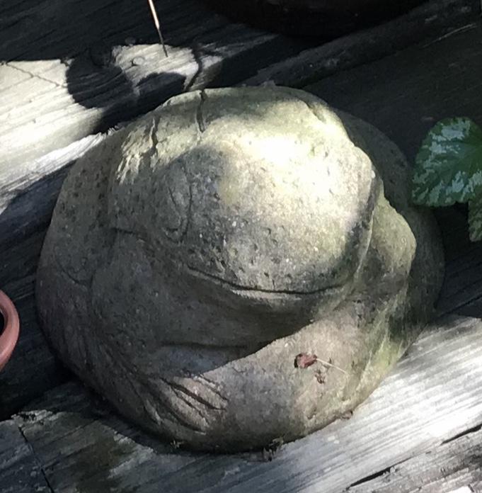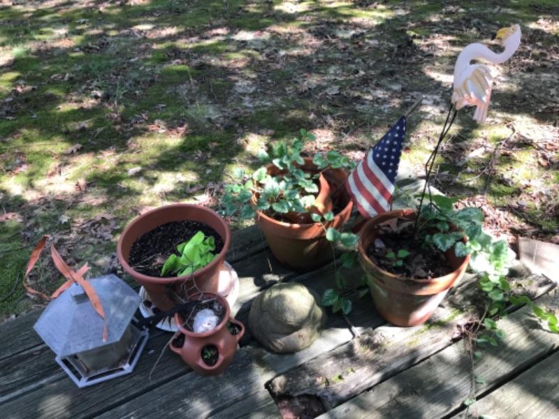 Cement frog, garden pots (two terra-cotta, two plastic) , bird feeder