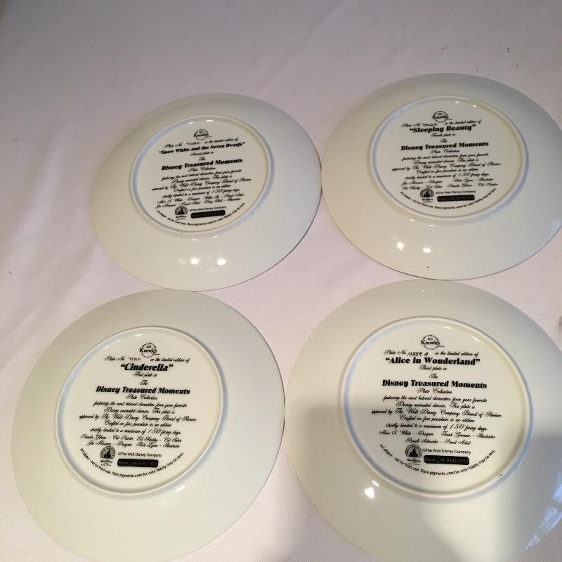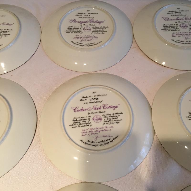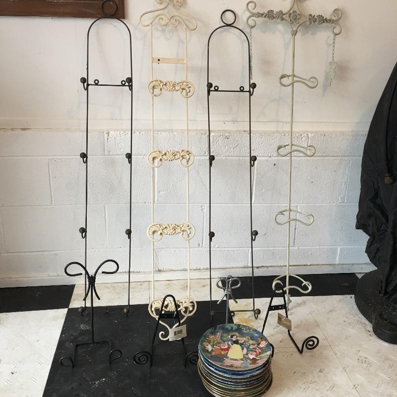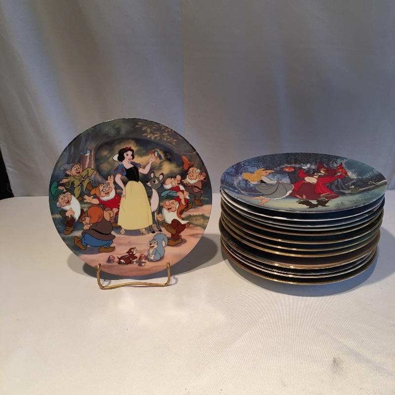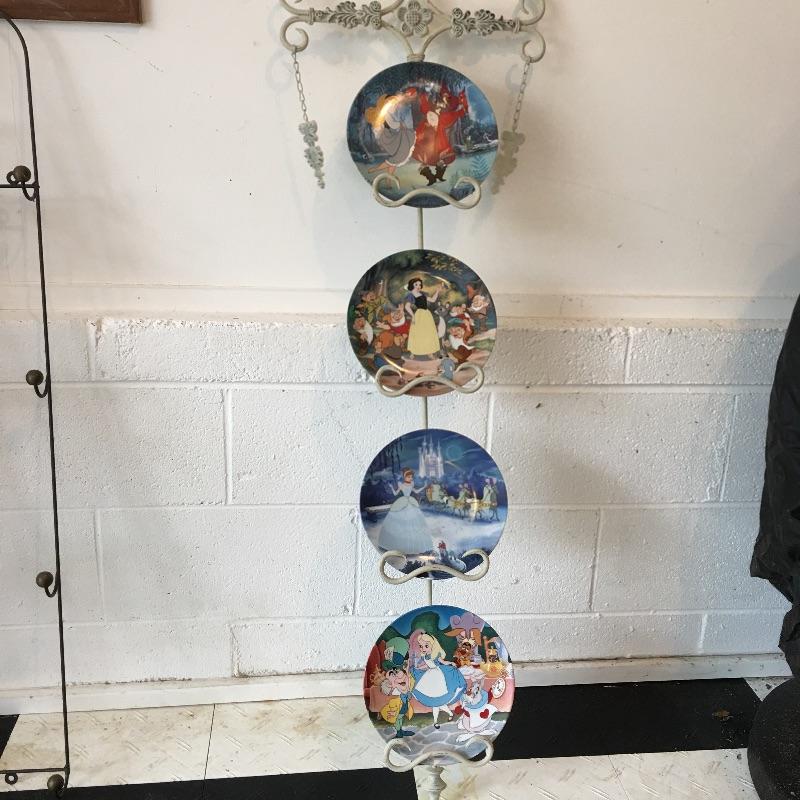 This collection of plates includes four numbered Disney Treasured Moments plates, six numbered plates by Thomas Kinkade, two numbered plates by Carl Valente and one numbered plate by Lena Liu. Also included in lot is four tall iron plate stands and four short iron plate stands. Tallest plate stand measures 48”tall and largest plate measures 8.5”.
