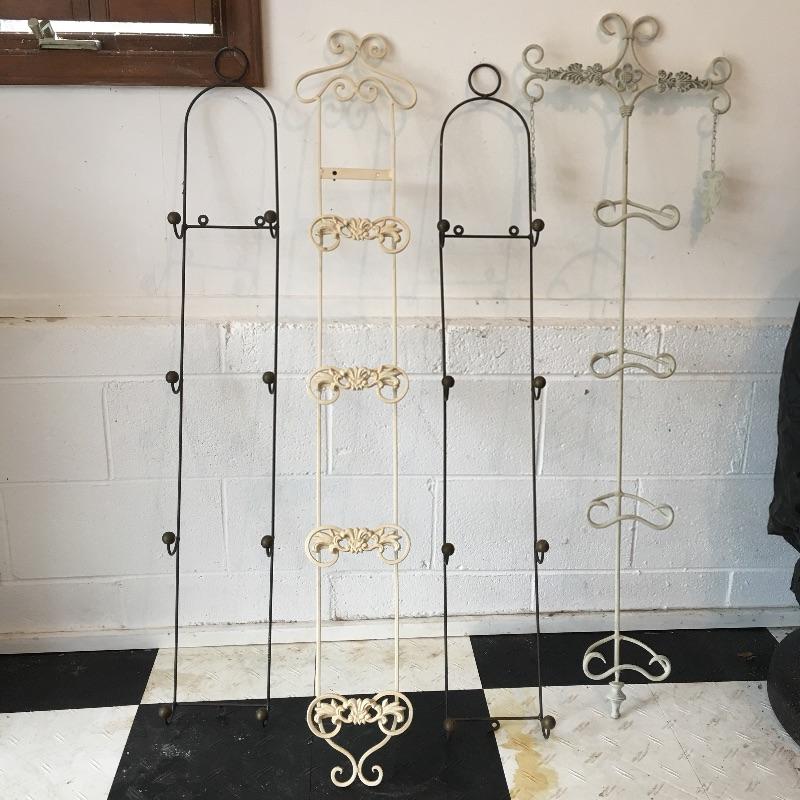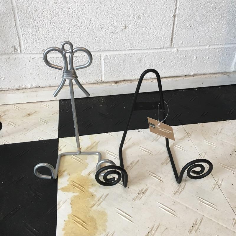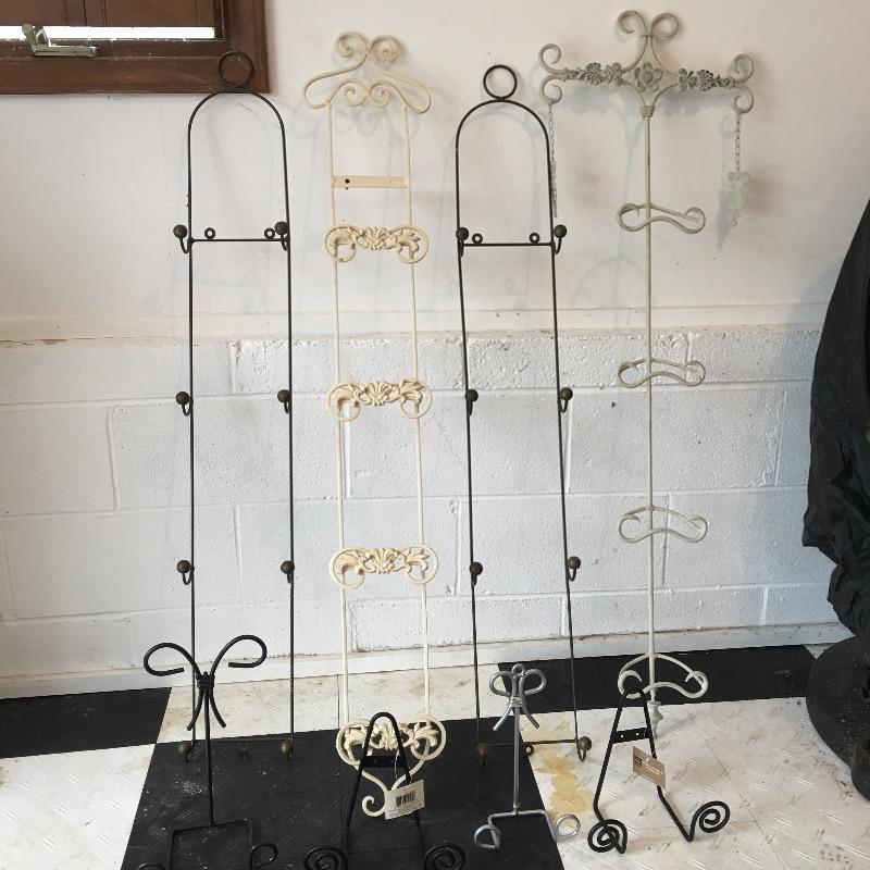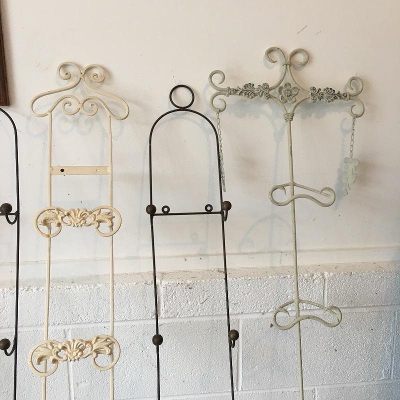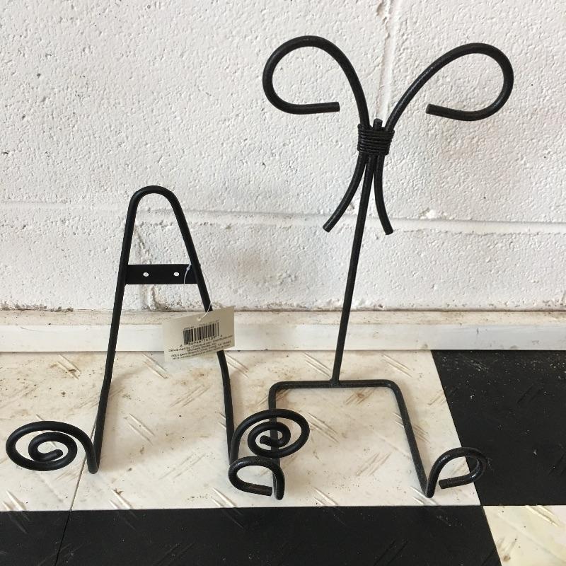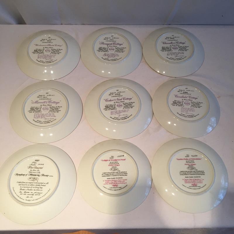 This collection of plates includes four numbered Disney Treasured Moments plates, six numbered plates by Thomas Kinkade, two numbered plates by Carl Valente and one numbered plate by Lena Liu. Also included in lot is four tall iron plate stands and four short iron plate stands. Tallest plate stand measures 48”tall and largest plate measures 8.5”.