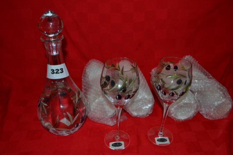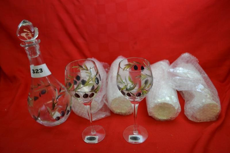 LOT 323 HAND PAINTED CARAFE AND 6 MATCHING GLASSES
