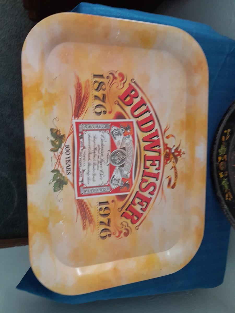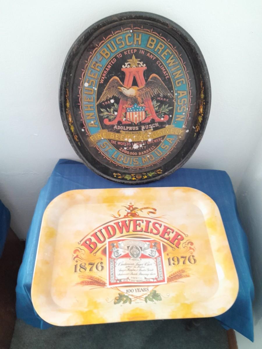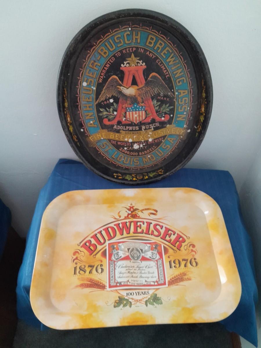 TWO BUDWEISER TIN ADVERTISEMENT DECORATIVE PLATES / PLATTERS 15.5" X 11.5" AND 15" X 12"