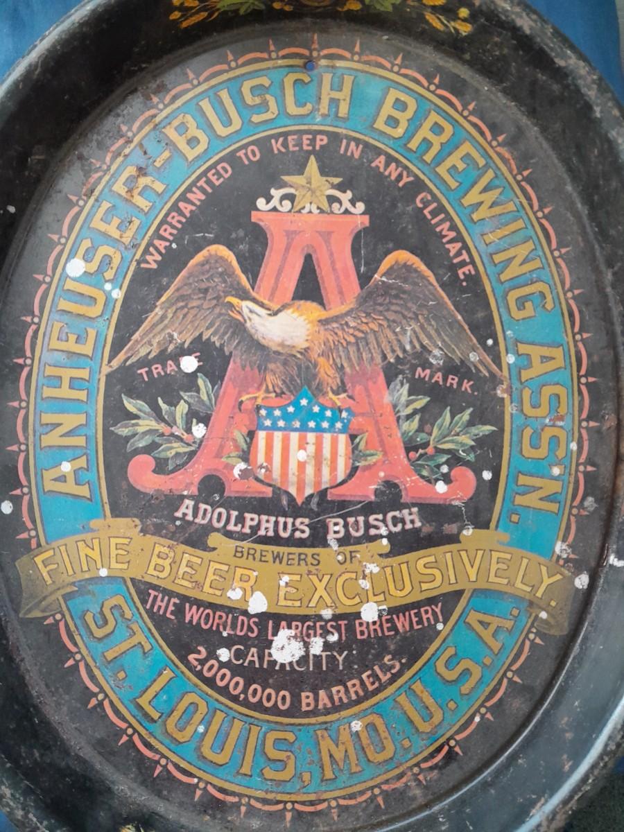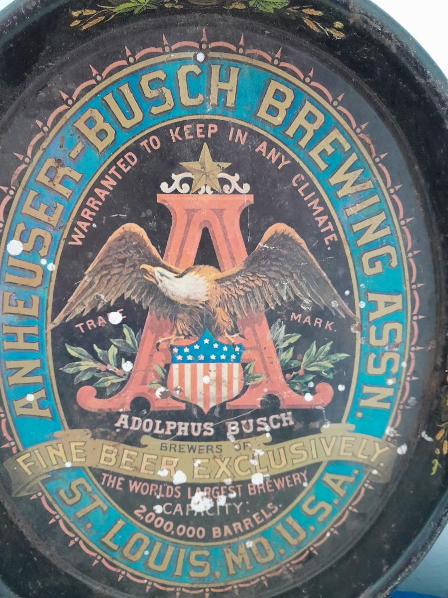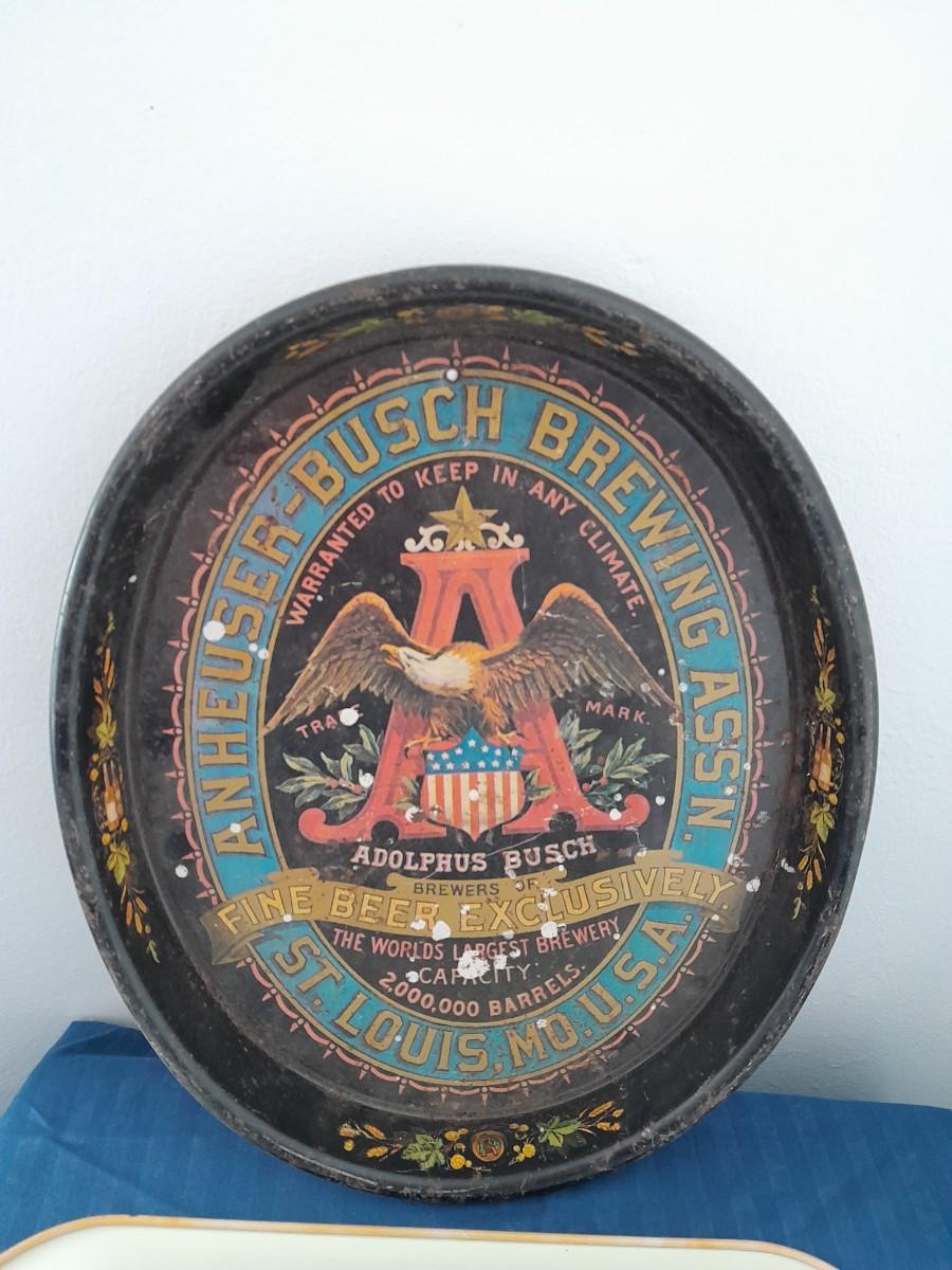 TWO BUDWEISER TIN ADVERTISEMENT DECORATIVE PLATES / PLATTERS 15.5" X 11.5" AND 15" X 12"
