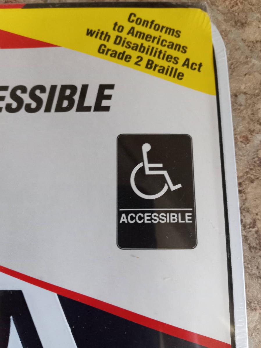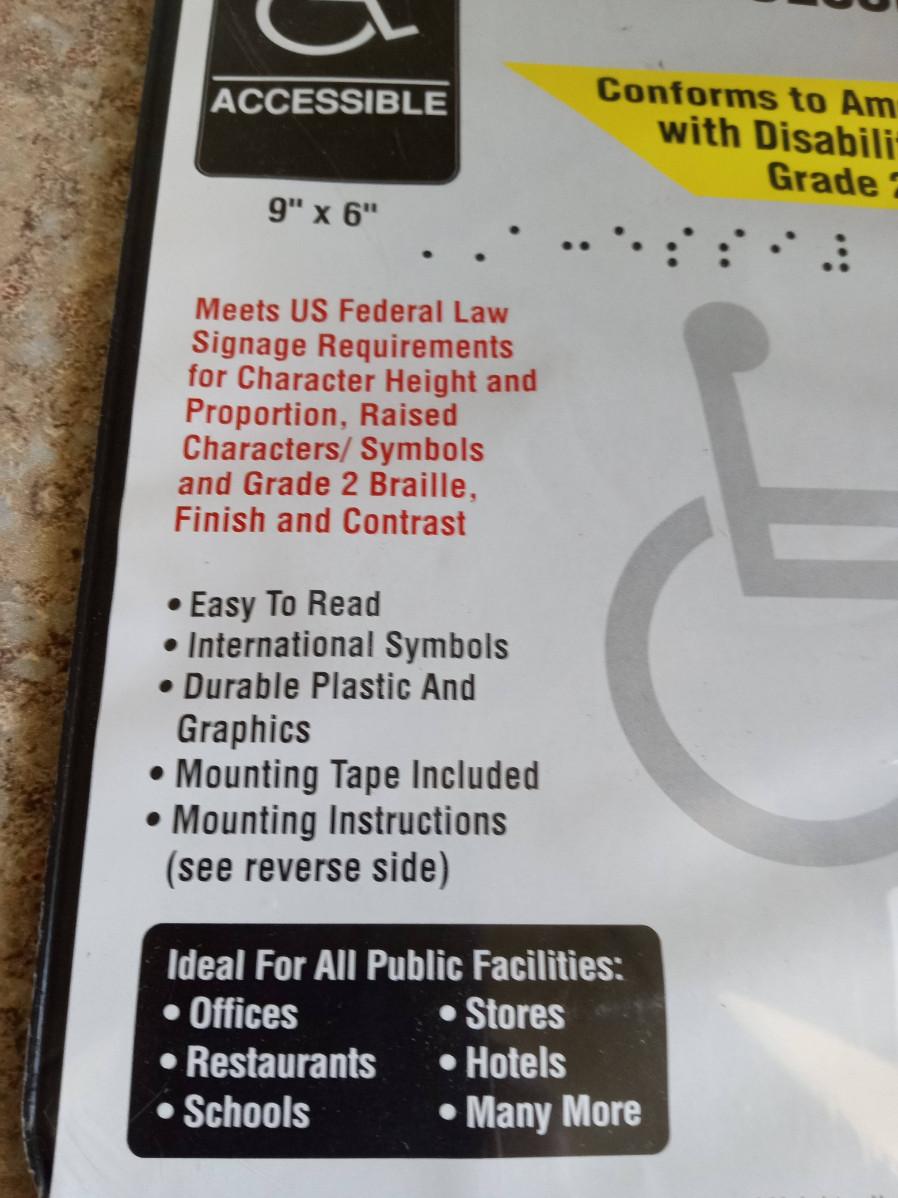 MEETS US FEDERAL LAW SIGNAGE REQUIREMENTS FOR CHARACTER HEIGHT AND PROPORTION, RAISED CHARACTERS/SYMBOLS AND GRADE 2 BRAILLE