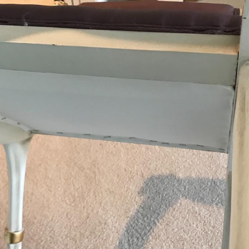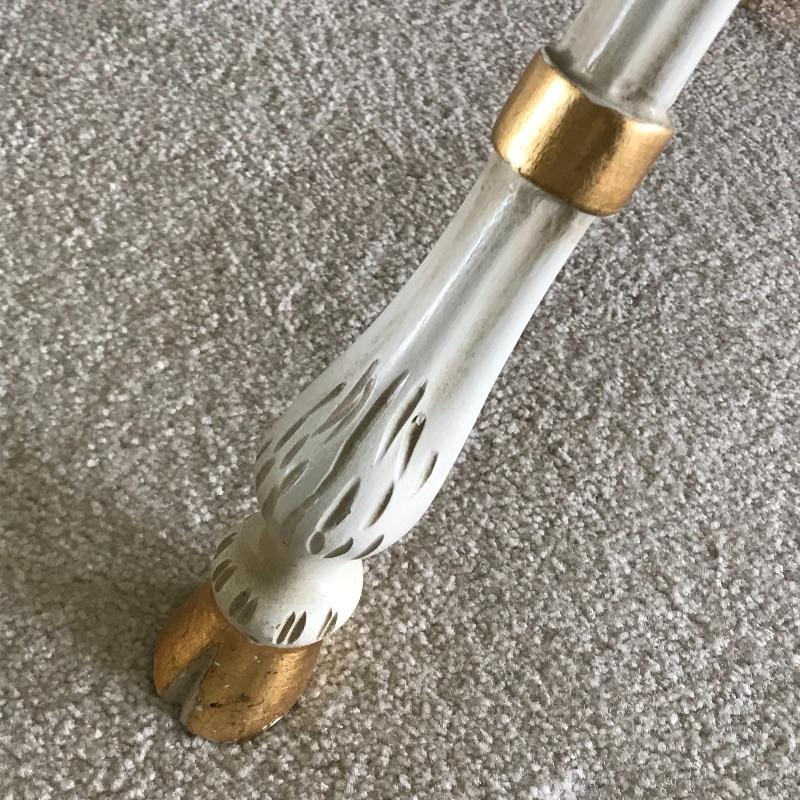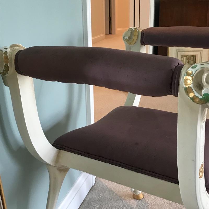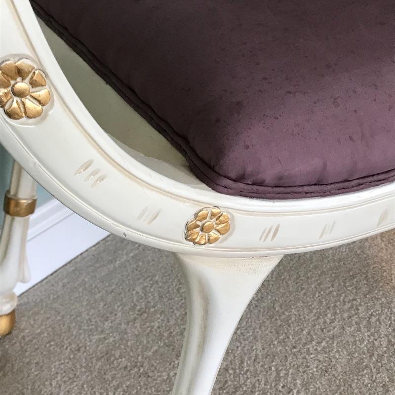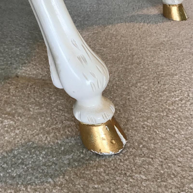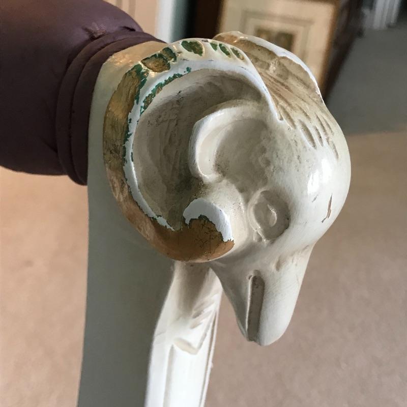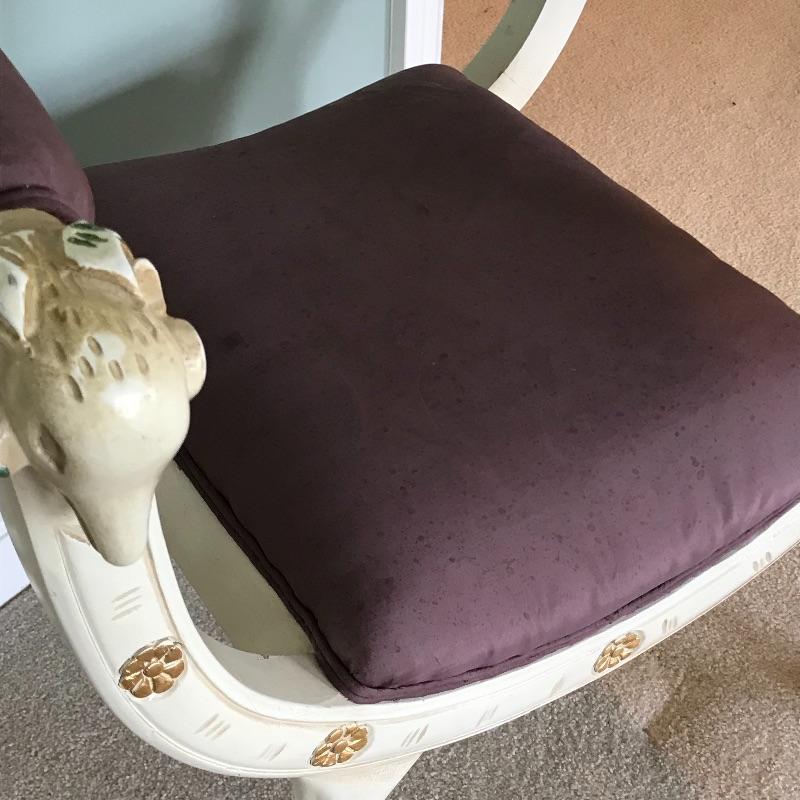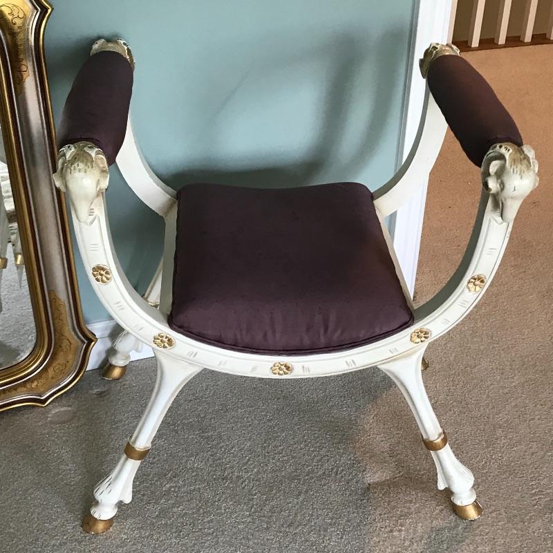 This lot includes an extremely unique painted wood bench seat for one, with carved ram heads and gold colored hooves for feet. The seat upholstery is plum colored and matches the arm rests.