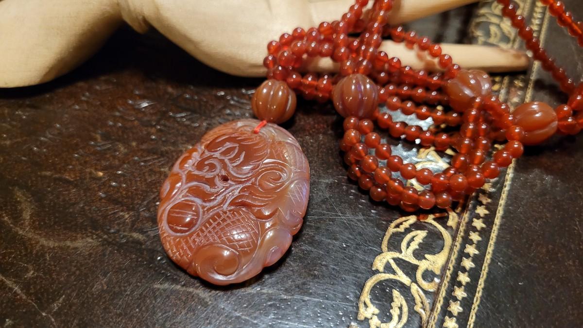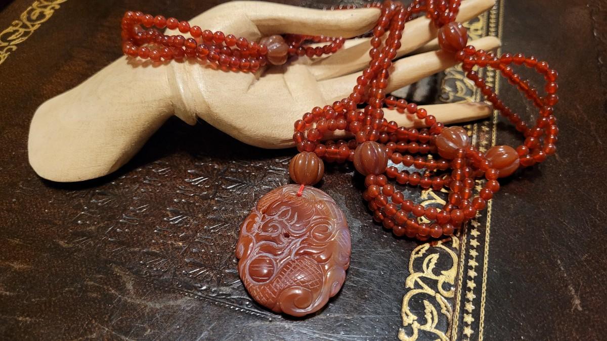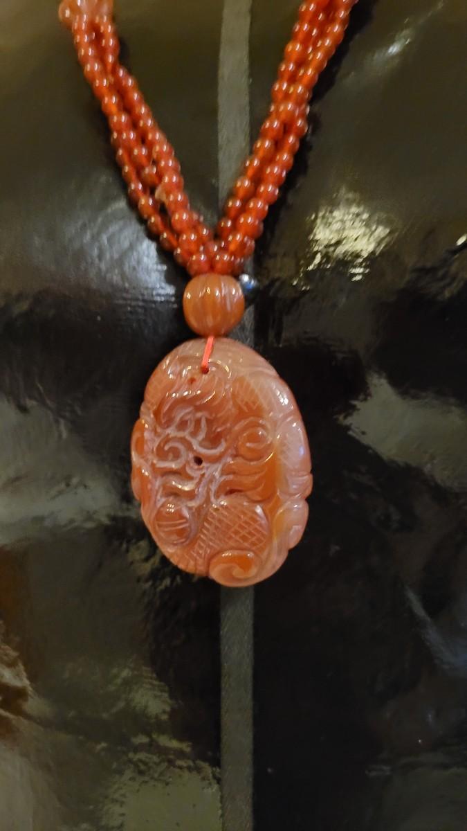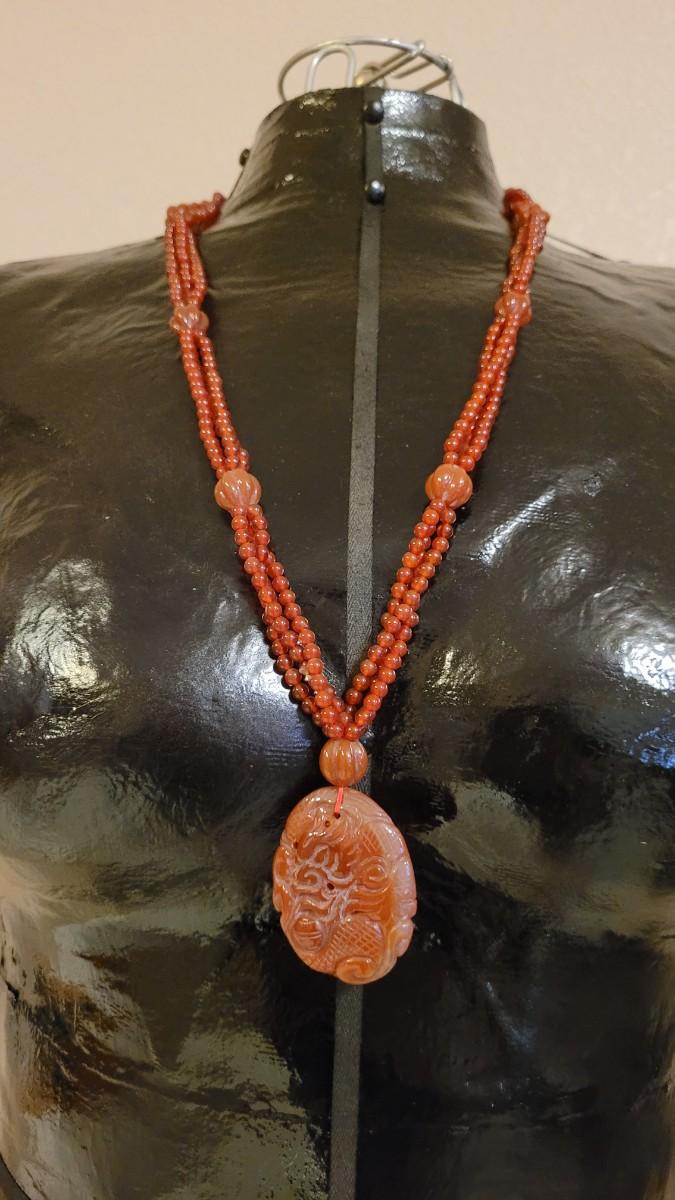 Lot 323: Vintage Asian CORNELIAN Bead Necklace with Matching Carved Dragon Pendant